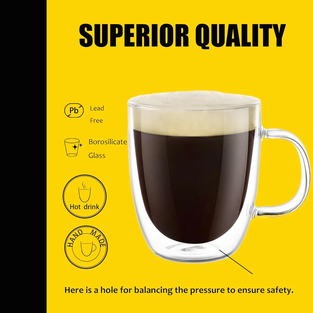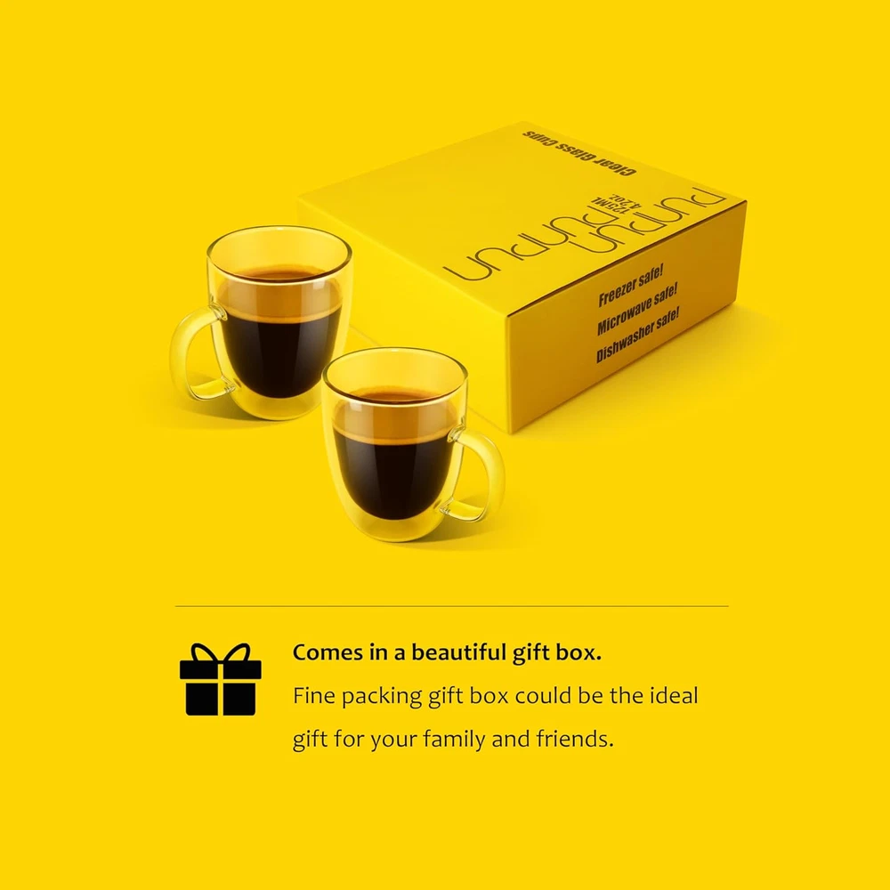 Glass Coffee Mug Clear Double Walled Iced Coffee Cup Hot Beverages 17Oz 2 Pack Top Quality Designer Glassware: Double wall insulated design is perfect for coffee and tea lovers. The mugs are made of borosilicate material, keep liquids hotter or colder longer than traditional glass or ceramic mugs.After a longer period of time the outer glass wall remains comfortable to touch. Superior quality with high temperature resistance from -20~150℃/ -4~302°F. Freezer safe, microwave safe and scratch free. BPA free, 100% Lead free and hand made. Large Size: Set of 2 , each 17ounce .500ml. High capacity is pefect for caffe latte and caramel macchiato or mocha frappuccino, you will have more freedom to play. All lines of glass mugs are smooth and daintiness, creating a nice feeling in hand. With the big rim, this double wall glass mugs are very easy to clean. Everyday Glass Coffee Mugs: The PunPun large clear coffee mugs serve the perfect for tea ,espresso, latte, cappuccino. The entire glass is so clear that the coffee seems to float in air, it’s a perfect addition to your breakfast and afternoon coffee time. Ideal Gift: Imporved package, very safe to avoid breakage on the way. Two nice coasters match two mugs. PunPun clear coffee mugs could be the ideal gift for your family or friends on special occasions such as weddings, parties, birthdays, housewarmings, or any other occasion. Shipping We are always working hard to ensure your package arrives as soon as possible. Please understand that some factors like weather, high postal traffic, and the performance of shipping companies are outside of our control. We offer free shipping to the lower 48 states and ship within 3 business days of payment, usually sooner. We do not accept P.O. Boxes. Please provide a physical address. Returns We offer a 30-Day Return Policy on Most items which you are not completely satisfied with. You have the option for a full-refund or an exchange of the item. Customer Satisfaction If there's a problem, Please message us before writing negative feedback or open a case, we will solve any problem for you, We Respond to all messages within Max 12 hours We try our very best to make sure every customer is completely satisfied