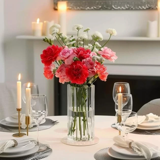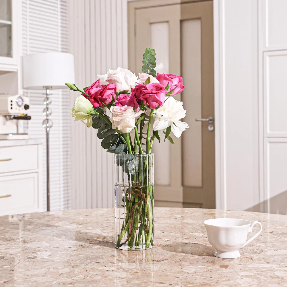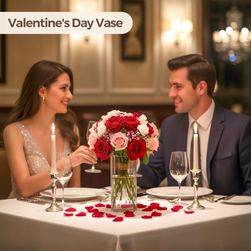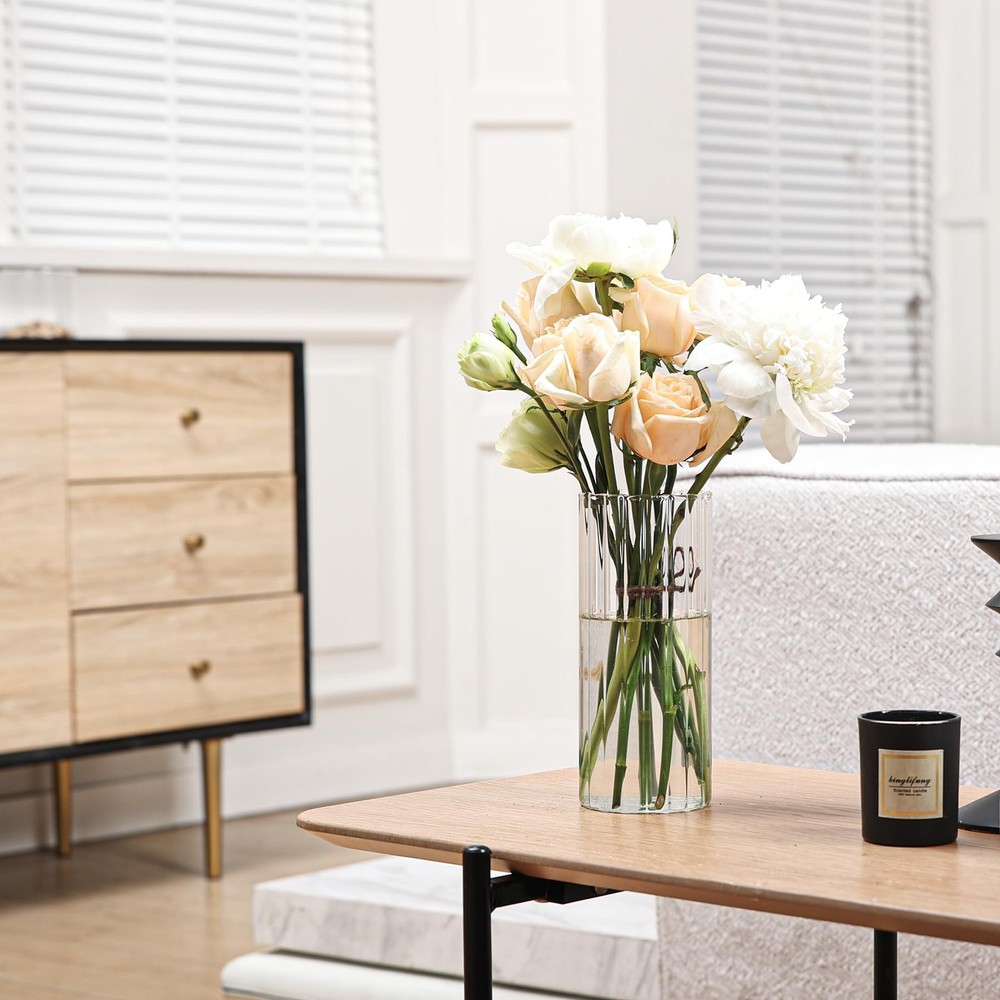 Glass Cylinder Vases, Bud Vase for Centerpieces, 8 Inch Tall Ribbed Vase Hurricane Floating Candle Holder, Decorative Flower Vases for Wedding Reception, Home Decor, Housewarming Gift (Clear) [Ribbed Design] - Featuring a unique ribbed design, this flower vase is both stylish and elegant. It is an ideal choice for home decor, weddings, restaurants, and offices.Its elegant appearance enhances the beauty of any setting. [Versatile Use] - These bud vases are not only great for arranging flowers, but also commonly applied as floating candle holders, or creative containers for succulents. Additionally, this vase is a great home decor piece, suitable for use as a table centerpiece or a decorative on your bookshelf, meeting various purposes. [Ideal Gift] - This elegant vase makes an ideal gift for various occasions such as Christmas, Thanksgiving, Mother's Day, weddings, housewarming parties and birthdays. It is a tasteful and thoughtful gift that anyone will love. Whether you are gifting it to family, friends, or colleagues, this vase expresses your heartfelt blessings.[Quality] - Made of thick and sturdy glass, this vase is durable and long-lasting. Notice: To avoid color fading, please DO NOT use detergents such as soap or alcohol to clean the bottle or soak in water for more than 1 hour.[Package Includes] - Includes piece (Diameter: 3.4 inches, Height: 7.9 inches). For detailed information, please see the size chart. Ribbed Design: Featuring a unique ribbed design, this flower vase is both stylish and elegant. It is an ideal choice for home decor, weddings, restaurants, and offices.Its elegant appearance enhances the beauty of any setting Versatile Use: These bud vases are not only great for arranging flowers, but also commonly applied as floating candle holders, or creative containers for succulents. Additionally, this vase is a great home decor piece, suitable for use as a table centerpiece or a decorative on your bookshelf, meeting various purposes Ideal Gift: This elegant vase makes an ideal gift for various occasions such as Christmas, Thanksgiving, Mother's Day, weddings, housewarming parties, birthdays and Valentine's Day. It is a tasteful and thoughtful gift that anyone will love. Whether you are gifting it to family, friends, or colleagues, this vase expresses your heartfelt blessings Quality: Made of thick and sturdy glass, this vase is durable and long-lasting. Notice: To avoid color fading, please DO NOT use detergents such as soap or alcohol to clean the bottle or soak in water for more than 1 hour Package Includes: Includes piece (Diameter: 3.4 inches, Height: 7.9 inches). For detailed information, please see the size chart
