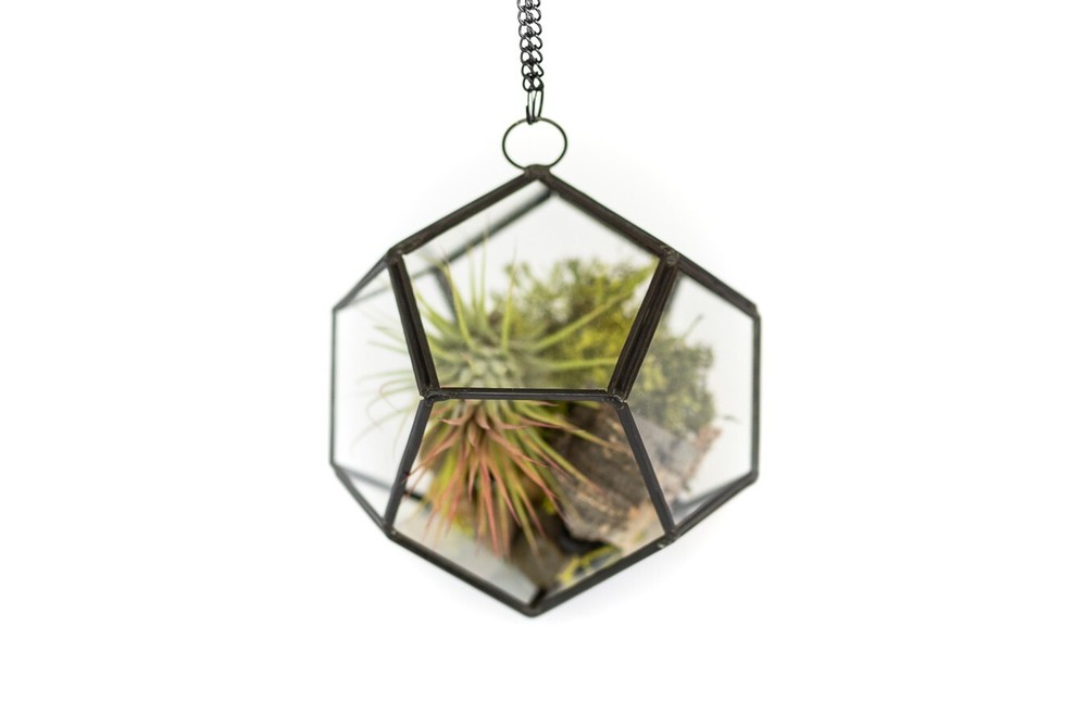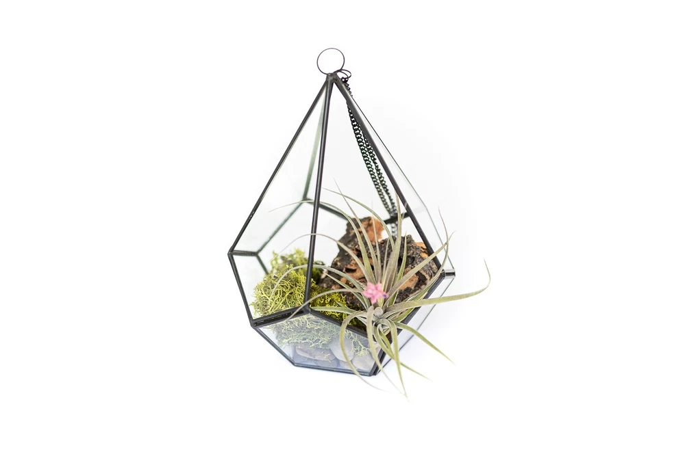 More About Our Large Glass Multifaceted Terrariums Showcase your air plants in modern style with our multifaceted glass terrariums, available in two striking shapes; a sleek diamond or a bold dodecahedron (pentagon). Both designs feature multiple glass panes framed in black metal, with a unique shaped opening that makes adding plants a breeze. Perfect for displaying multiple small plants. Each terrarium includes a black chain for hanging and can also sit beautifully on any flat surface. Size: Diamond - Plant Opening - Width - Height 4 x7 inches 4 inches 9 inches Pentagon - Plant Opening - Width - Height 3x3 inches 5.5 inches 5 inches More About Air Plants Air plants are easy-care house plants in the genus Tillandsia. Air plants are unique because they do not need soil to grow. They are epiphyte plants native to Central and South America. They only need light, water and air to survive. They are great for small spaces, as accents, home decor or party favors. The options are unlimited – Tillandsia can stand alone or pair with an accessory such as a terrarium, ceramic hanger, cork bark, driftwood, and more! Air plants also make great gifts – They are the gift that keeps giving! Air plants reproduce by producing offsets or “pups” from the base of the plant after they show off their spectacular bloom. Every order comes with care instructions. Multiple Uses Air plants add beauty to indoor and outdoor spaces. Place them in terrariums, wall planters, containers, globes and use them to stylize vertical gardens displays. As a succulent alternative, Tillandsia (air plants) can decorate events like weddings, birthdays, for Easter and Christmas. Use them as party favors, Mother's Day gifts, centerpieces or as unique gifts. Easy-To-Care-For Air Plants (Genus: Tillandsia) are hardy bromeliad plants from Central and South America that don't require soil to grow. Simply soak them in water for 20 to 30 minutes once a week and let them dry out. They require indirect but bright light. A care instruction card from Air Plant Shop will be included in every order. Hand Packed & Picked Our shippers are trained to only send the healthiest living plants. We pack every order with quality and care. All our plants come with a 30 Day Guarantee. Let us know if you are not completely happy with your order and we will send you new plants. We have a variety of plants available. Select anywhere from 5 to 5,000 plants we will ship them out the same business day if the order is made by 3 PM Eastern Time Monday-Friday. About Blooming & Color Plants will not always arrive in bloom with red and purple color. However, most will bloom 2-3 times a year. See photos for what the non-blooming green plants look like Air Plant Care Tips Do not plant your air plants in soil. Do not let them stay wet for long periods of time to avoid rotting. Let them dry completely before placing in a glass terrarium. You may cut the unsightly roots off and peel or trim off the brown leaves. Some species have naturally dark bases. Where To Use Air Plants In a terrarium or ceramic holder As a desk plant On a shelf or in a decorative bowl Table centerpieces Party favors On a porch Attach to a tree Pair with driftwood, seashells or cork bark