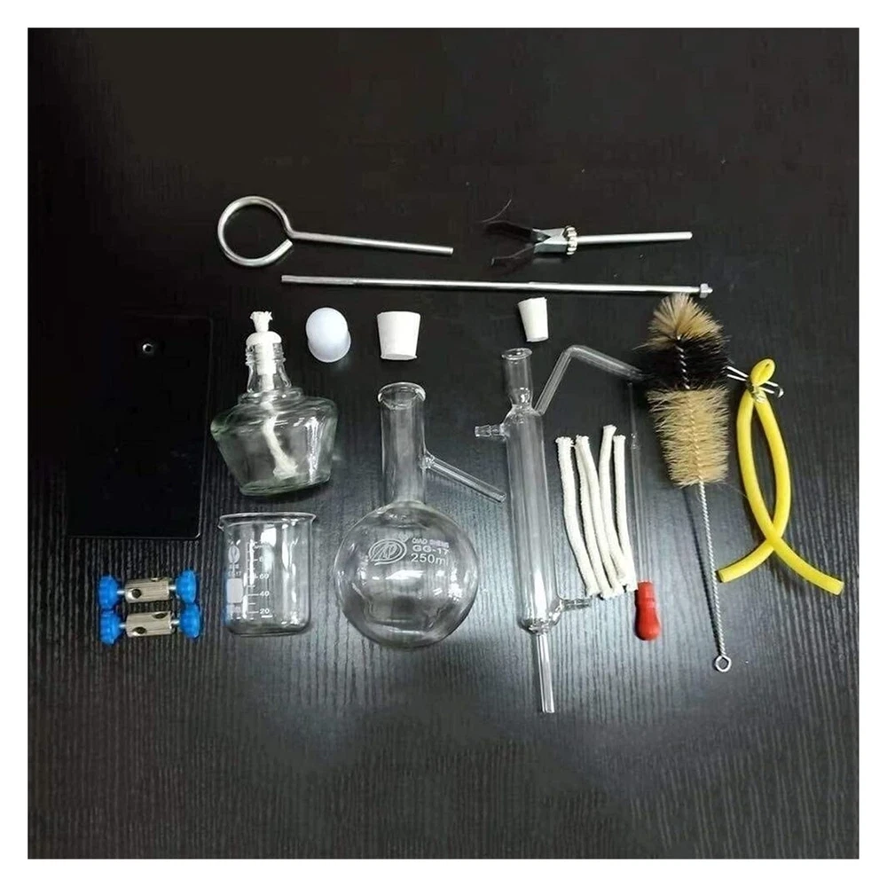 13pcs Glass Distillation Apparatus, Vacuum Distillation Equipment, Chemistry Lab Glassware Kit Glassware Kit Glass Distillation Industrial Science Distiller Pure Dew Purification Making Essential Oils Distilled Water Filter  Product Name: Distiller.  Product List:  Miniature iron stand *1 Distillation flask *1 Straight condensing tube *1 Alcohol lamp *1 Glass beaker *1 Essential oil bottle *1 dropper *1 Flask brush *1 Latex tube *1 Waterstop clip *1 Perforated rubber plug *2 Cotton wick *10 Plastic funnel *1  Note: For the safety of logistics and transportation, the product list does not include matches, please purchase it yourself. Large Capacity Essential Oil Distillation Kit: Featuring a large capacity flask, our distillation apparatus facilitates batch production of essential oils, increasing extraction rates and yielding purer materials than conventional methods. 3.3 Borosilicate Glass: Upgraded to 3.3 borosilicate glass, our lab glassware withstands high temperatures and corrosive reagents. The low linear expansion coefficient of the glass effectively prevents product breakage due to high temperatures. Laboratory distillation set can be used for small flasks to refine essential oils distilled water purification straight condenser.It is the perfect set for organic chemistry experiments, distillation, fractionation, separation, purification and synthesis. Professional Accessories: Equipped with accessories such as conical flasks, beakers, brushes, etc., facilitating users in collecting and processing experimental products, and providing comprehensive support. This excellent distillation and purification equipment empowers the DIY essential oil you like. Standard & Frosted Joints: Joints are all standard size; it is easy to install and replace. All joints are frosted for high air-sealed and no air leakage, ensuring distillation purity. The high distillation rate saves you money.
