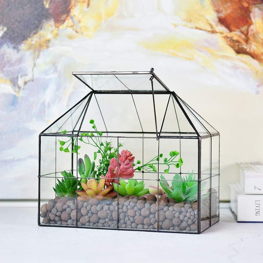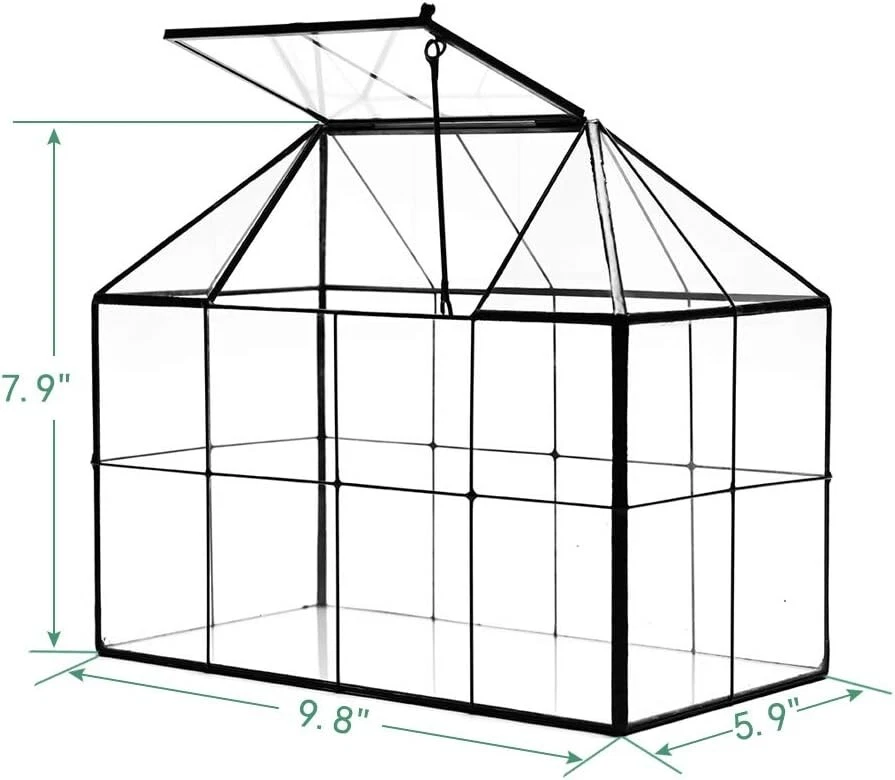 Large House-Shaped Glass Terrarium – Swing Lid, Sturdy Design For Plants & Decor This large glass terrarium is a house shape plant terrarium with swing lid, have beautiful black accent and ventilation. Glass greenhouse terrarium great for raising succulent, moss, fern, cacti, venus fly trap. Large plant terrarium motivate your imagination to create a dreamy world at home. Made of reinforced glass, super sturdy, clear glass terrarium tabletop planter Size: 9.8""X7.9""X5.9"" inches, great decor for office desk, window, balcony. as a housewarming gift Product Description Exquisite Glass Plant Terrarium create a fashion life atmosphere, make your life more poetic and relaxing. This Exquisite Sealed house shape glass terrariumis just like a piece of art with its modern style and sleek design, The craftsmen carefully welded the brass frame of this tiny glass greenhouse by hand, and put the full transparent glass into the frame, forming a exquisite handicraft glass terrarium. Different from other glass terrarium, the glass panels of this house terrarium are sealed, It can almost water proof, great for growing succulent, orchid, moss, fern, cacti, venus fly trap. Made of framed transparent glass with copper frame, super sturdy, create a separate environment inside for your lovely plants and keep your plant and pets get along very well together at home. Great Housewarming Gift Glass terrarium is a decent way to raise plants and watch them, without dirting your room. Plant terrarium with Modern design greatly adding visual interest and artistic value to any space. It is also ideal for holding wedding card or gift card. Great housewarming gift for your family and friends. Perfect centre display box for weddings, holidays, parties, offices, and home decor. Beautiful plant terrarium with swing lip on the top This large glass terrarium is a house shape plant terrarium with swing lid, have beautiful black accent and ventilation, easy to keep plant in/out. Best choose as a new home for your snail and other small pets. Glass terrarium is a decent way to raise plants and watch them, without dirtying your room. A perfect addition to home or garden, create a great focal point and decorative piece. Large plant terrarium motivate your imagination to create a dreamy world at home. Perfect unique design make this Glass Terrarium nice for eye-catching, with your small potted plants Creates a Relaxing and Poetic Environment. Made of reinforced glass, super sturdy. Modern style and classic elegance.