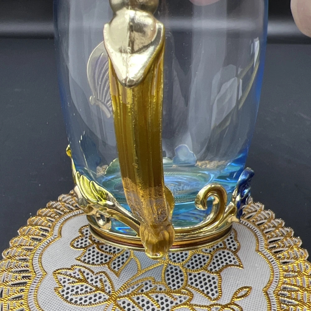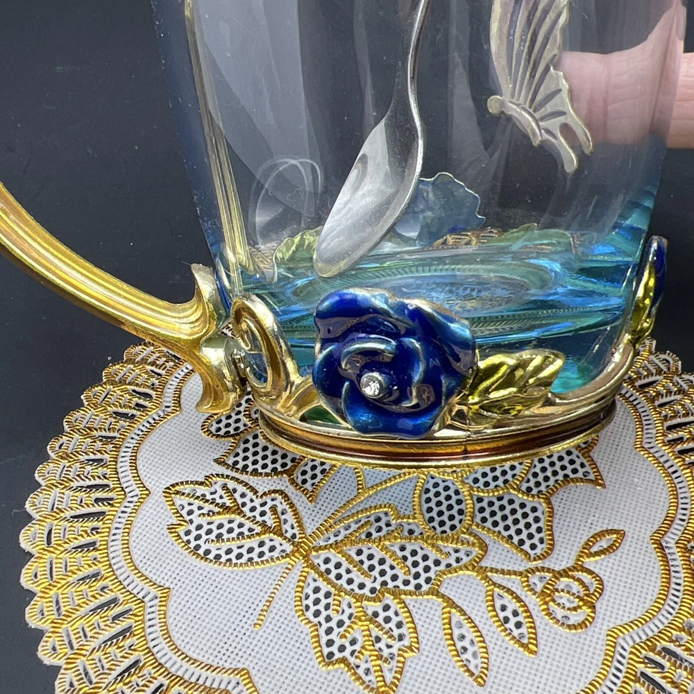 Elevate your tea-drinking experience with this stunning Glass Jeweled Enamel Tea Cup & Spoon Set. Handmade with intricate attention to detail, this set features a beautiful rose, flower, and butterfly design that will add a touch of elegance to any occasion. Crafted from high-quality glass and enamel, this set includes a tea glass with sparkling jewels and a decorated spoon . Perfect for all occasions, this set is not only functional but also a work of art. The butterfly theme make it a unique addition to your collection. Impress your guests or simply enjoy a cup of tea in style with this must-have set. I will pack with care and get it to you ASAP Thanks for looking !