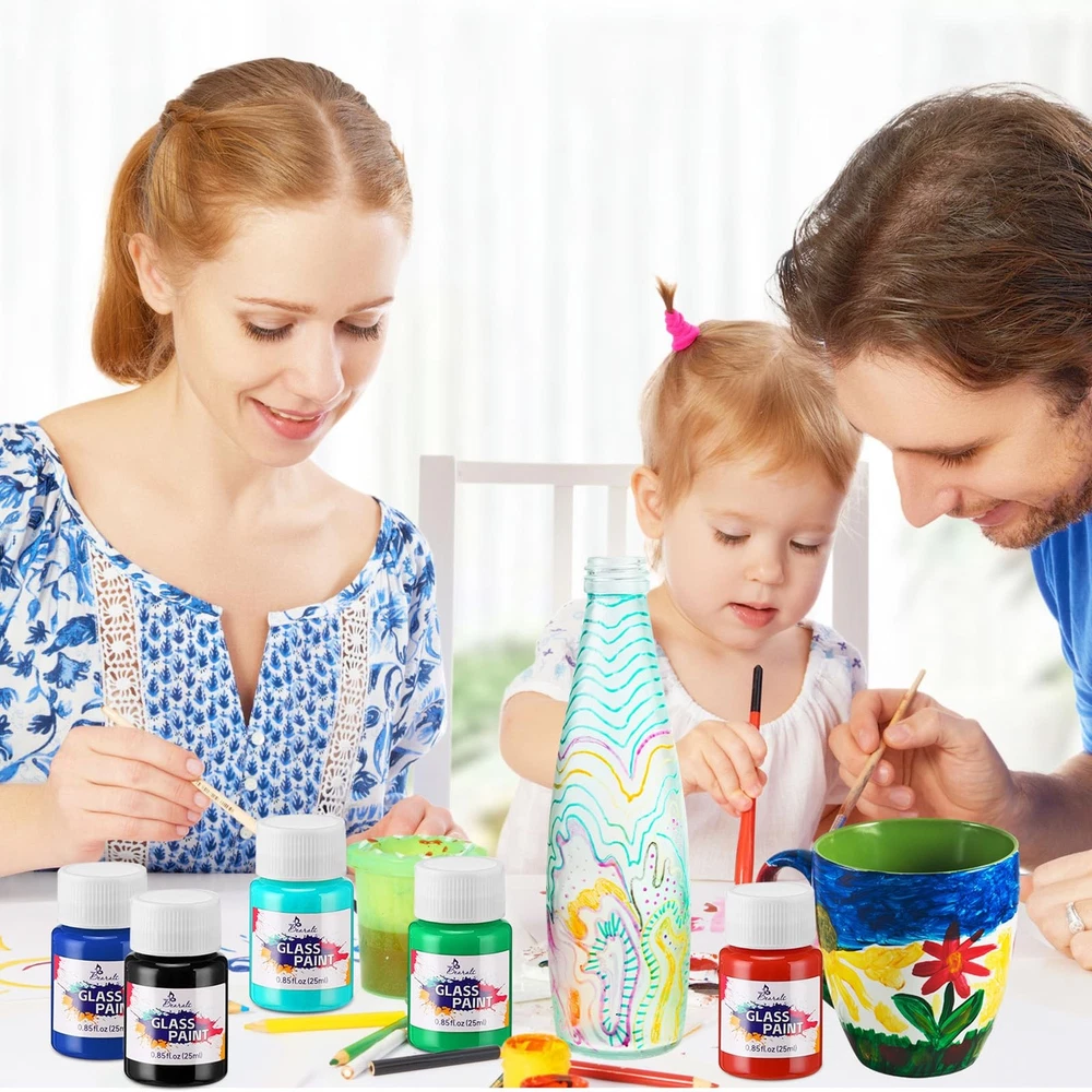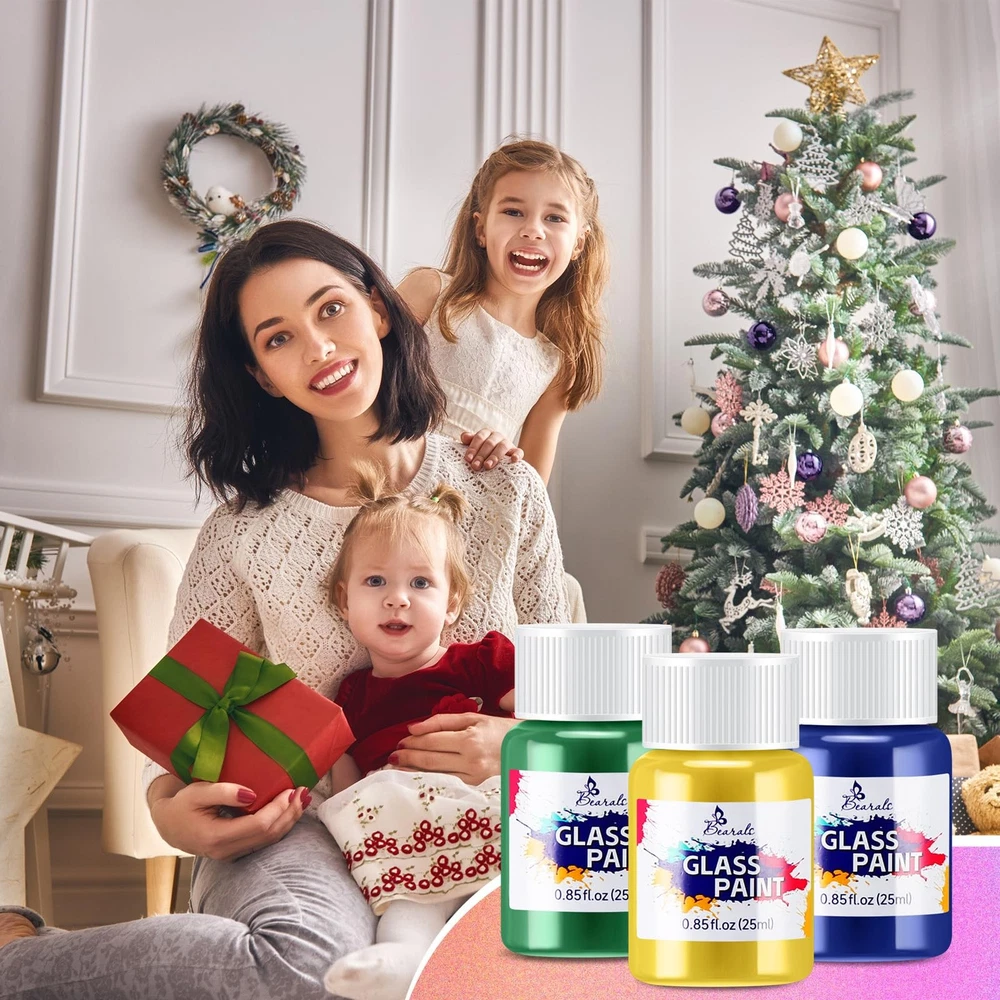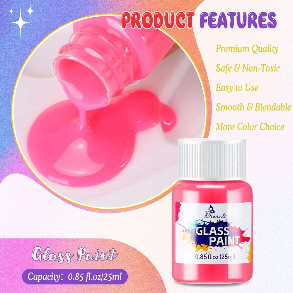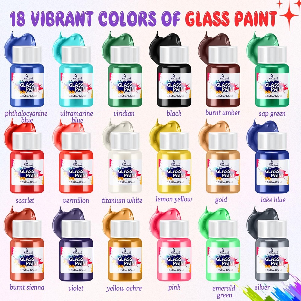 Bearals Glass Paint Included: --18 Vibrant colors glass paint(Bottle of 0.85oz/25ml) Great for a variety of surfaces. Include: glass, wine glasses, windows, light bulbs, ceramics Premium Quality: We use better ingredients to make this glass paint. The creamy consistency and high pigment make your paintings more silk and the stained glass paint glides on smoothly, dry quickly and keep your artwork vivid. Safe & Non Toxic: Conforms to ASTM D-4236 and EN71, our stained glass paint is non-toxic and completely safe to use. 18 Vibrant Colors: Our glass paint comes with 18 bright glass colors in 25ml / 0.85fl.oz bottles, offering vivid color options to your artwork. And this glass paint set can better meet your needs for glass painting. Wide Application: Bearals glass paint is not only used for glass painting, can also be applied on wine glassed, windows, ceramics and other transparent surfaces. Perfect Gift Choice: This glass paint is suitable for kids, students, adults or for beginners and artists who love glass painting. Packed with an exquisite box, this stained glass paint can be also used as a gift for birthdays, parties, school, and other occasions.