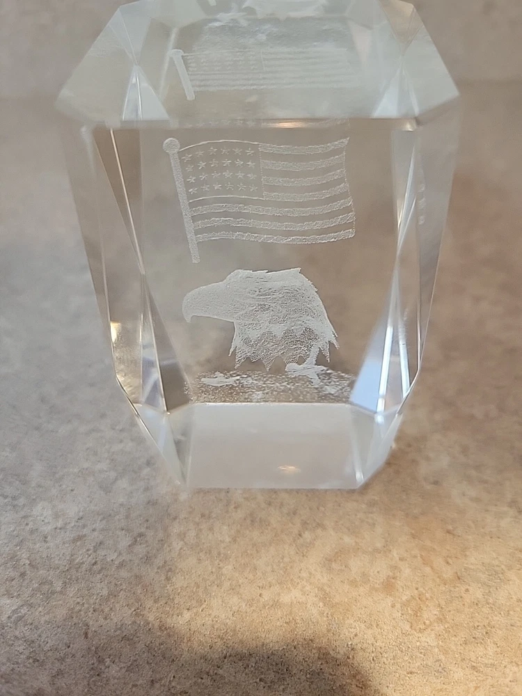 This is a clear glass paperweight with a 3D laser etched eagle and American flag design. It is a patriotic and collectible item that would make a great addition to any desk or display. The unit quantity is one and it is made in China. The brand is Glass and it is not handmade.