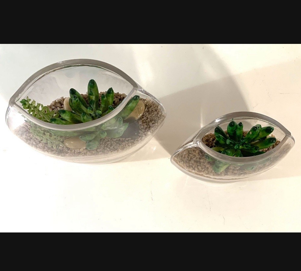 Set of 2 glass terrariums with artificial succulents. Great for home or office decor. 5 x 4.25 x 2 inches. Small one is 4 x 3.25 x 1.75 inches. (B2)