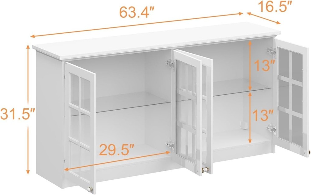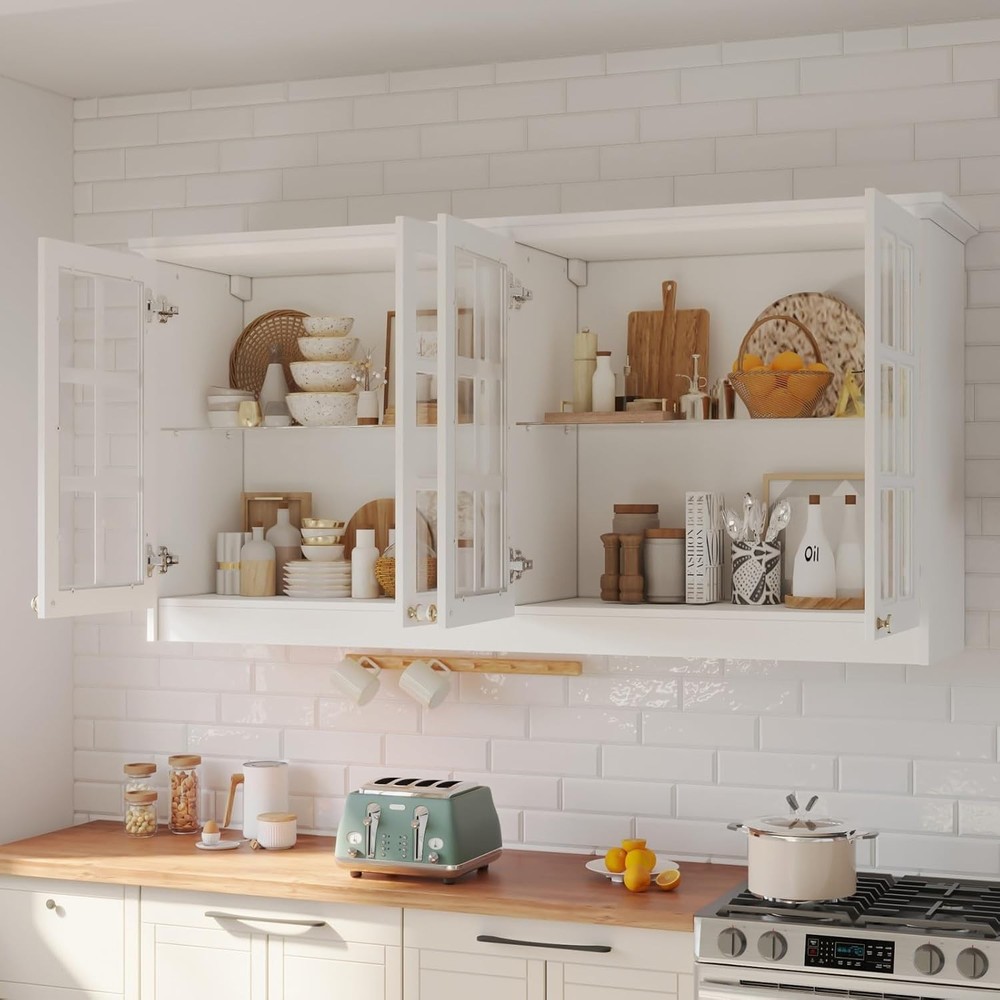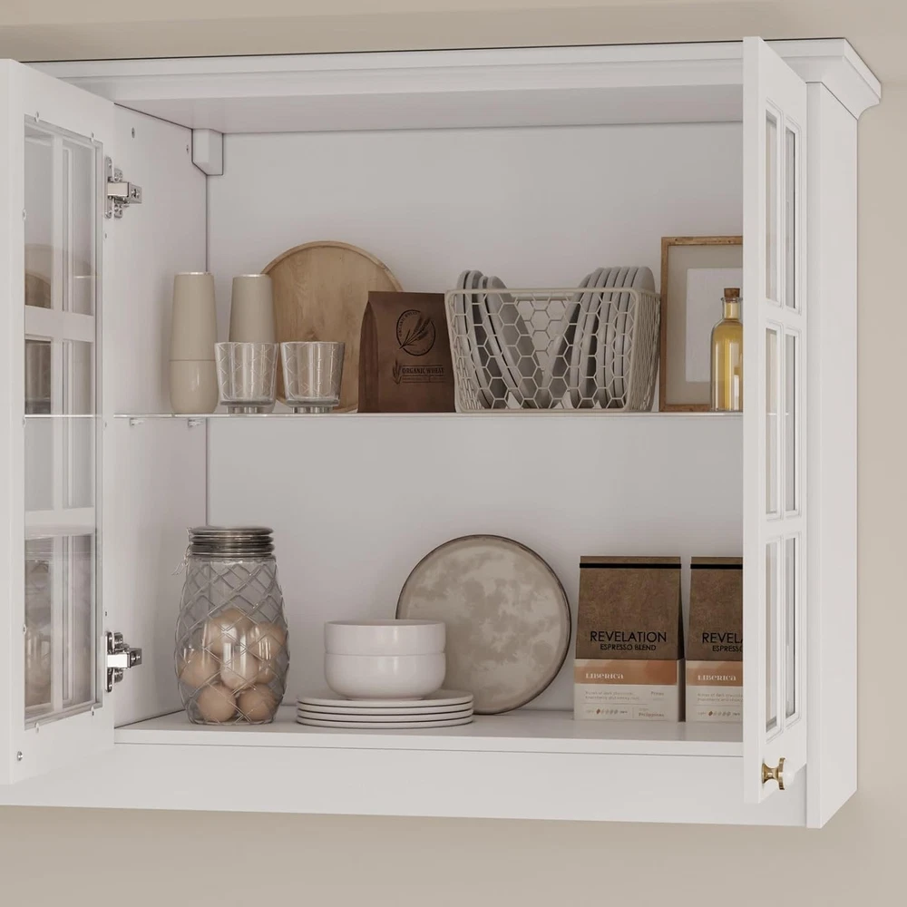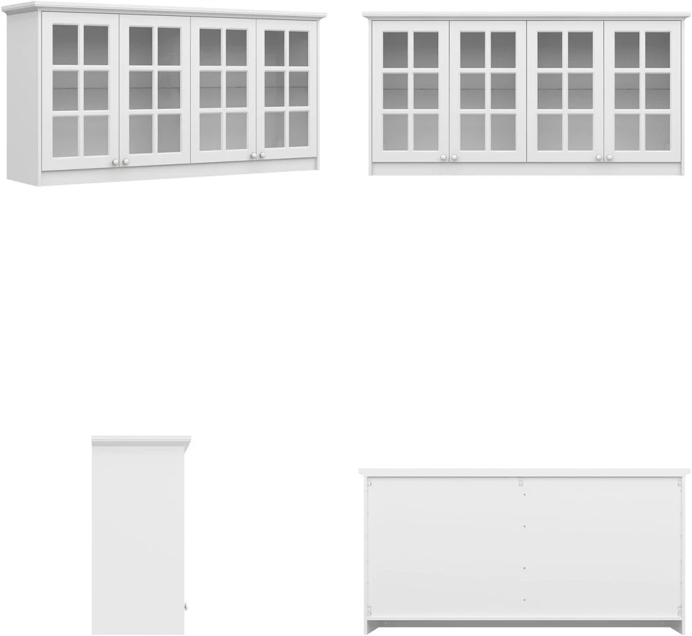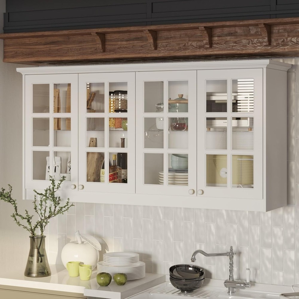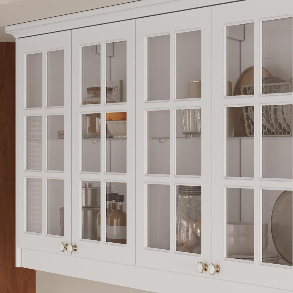 Product Description About this item • Modern Cabinet - The glass display cabinet is painted in white. It is paired with decorative gold and white 2-tone knobs, bringing graceful sense. Glass doors are adorned with crossing-line patterns, classic to look. Charming appearance will add visual interest while present chic display effect. • Storage Design - With 2 glass shelves, this wall-mounted storage cabinet will provide users with 4 compartments to store belongings. Shelves are detachable, catering to daily storage needs whether in kitchen, bathroom, garage, home office or laundry room. • Multipurpose - This glass cabinet is practical in many occasions. It is suitable for both wall mount and floor mount. Glass doors give it the function of displaying contents, like collectibles. It fits to be used as pantry cabinet, cupboard, wine cabinet, file cabinet, bookcase and bathroom cabinet. • Sturdy Construction - This pantry cupboard is made of quality MDF boards and glass. With sturdy construction, it features good load capacity. Our wall cabinet is equipped with hanging retainers that can fix it to wall firmly to prevent accidental injures. Dimension: 16.5”D x 63.4”W x 31.5”H. • Assembly - The wall mount pantry storage comes with a detailed instruction and necessary accessories. Please check out that all parts are received and intact before install it. We recommend 2 person to install it together for a smoother process. Wall Storage Cabinet with Glass Doors, Kitchen Pantry Cupboard with Glass Shelves, Wall-Mount Storage, Display Case for Home Bar, White 16.5”D x 63.4”W x 31.5”H On Aug 13, 2025 at 18:52:13 PDT, seller added the following information: