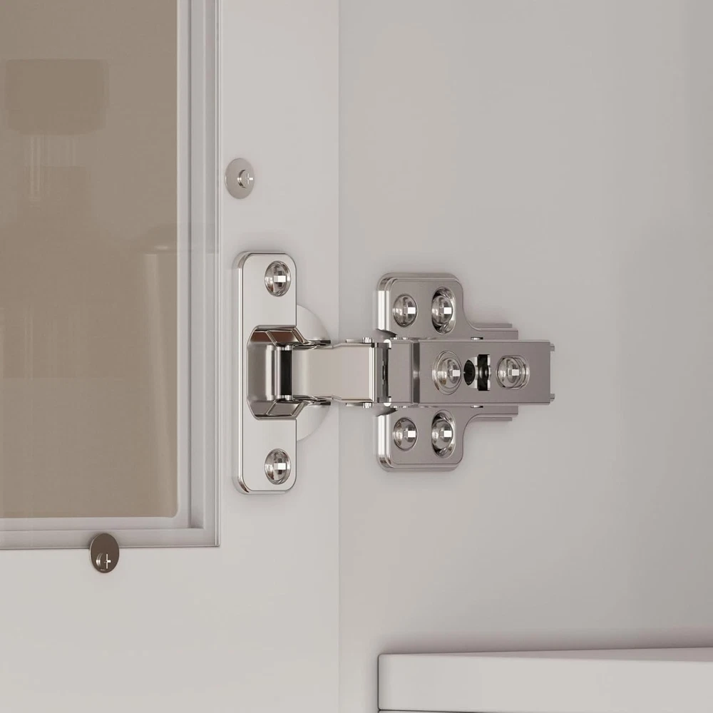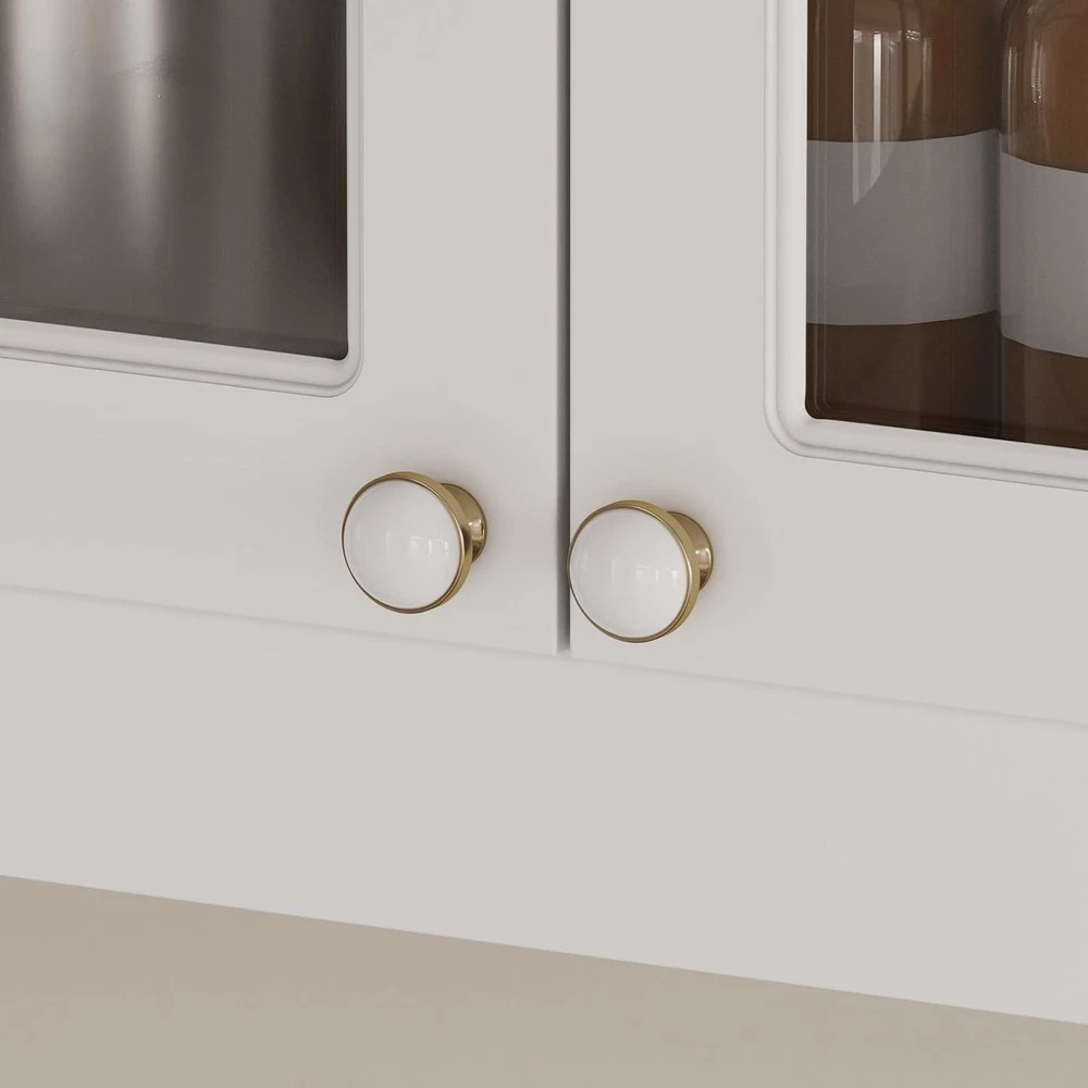 This stylish white cabinet with gold accents and glass doors adds elegance to any space. The chic crossed-line pattern gives it a classic look while the adjustable shelves offer versatile storage. Perfect for displaying dishes, decor, or pantry items—functional and beautiful!