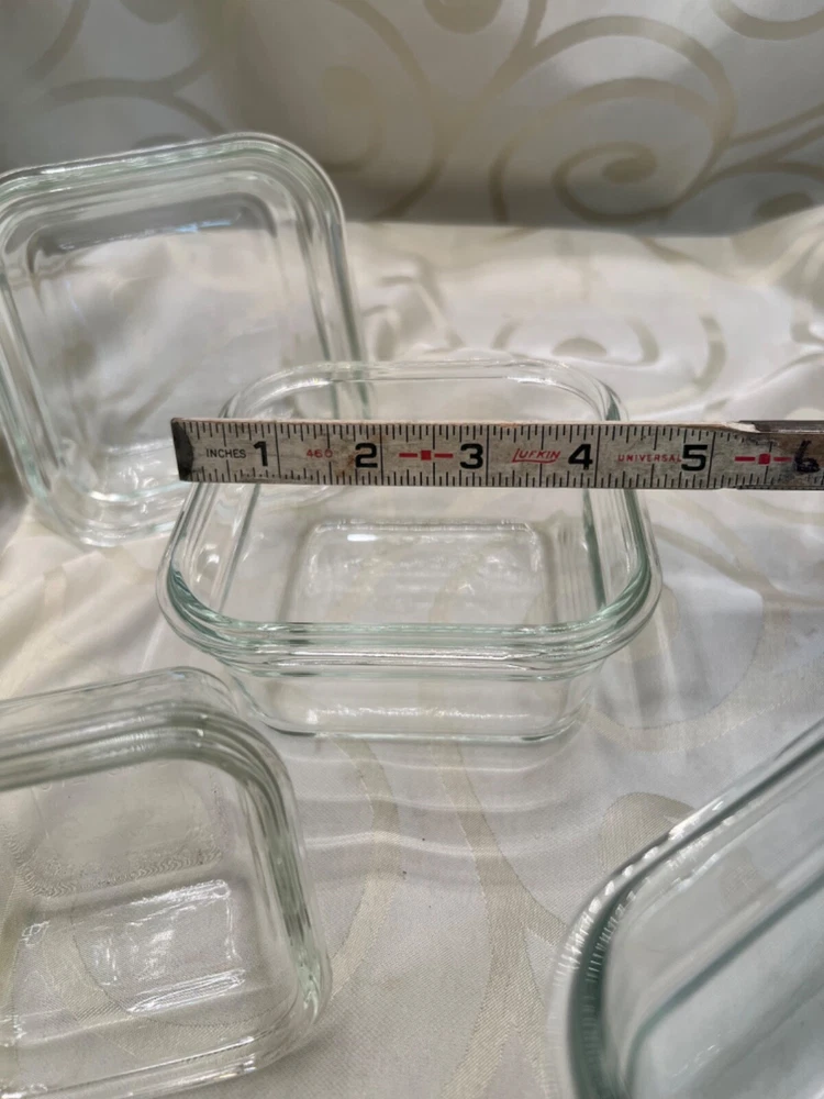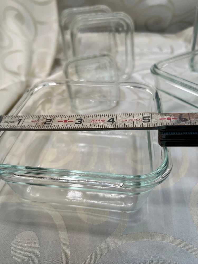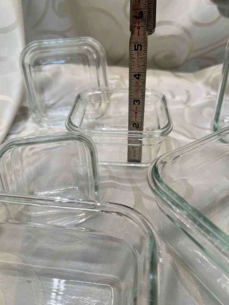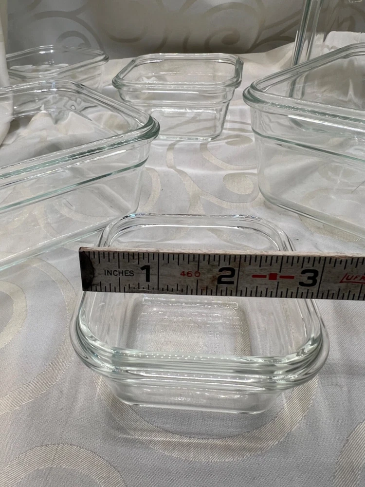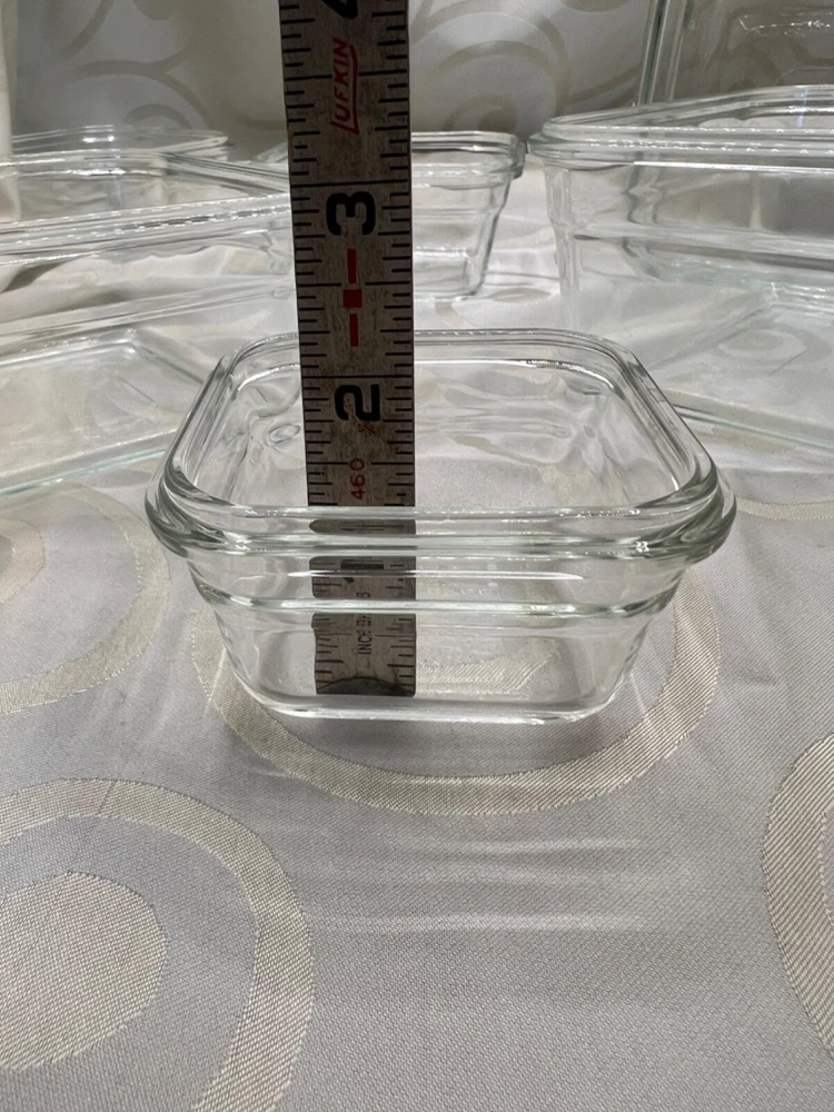 The Glasslock Oven Safe food storage set includes 6 square containers made of clear glass. The set comes in different sizes with capacities ranging from 1/2 cup to 6 cups. These containers have a height between 1 1/2 inches and 3 inches, and lengths varying from 2 inches to 7 inches. They do not have lids, making them suitable for oven and microwave use.