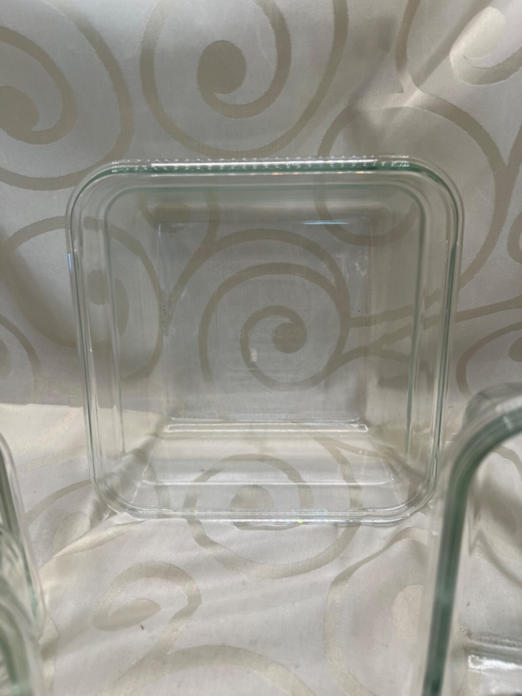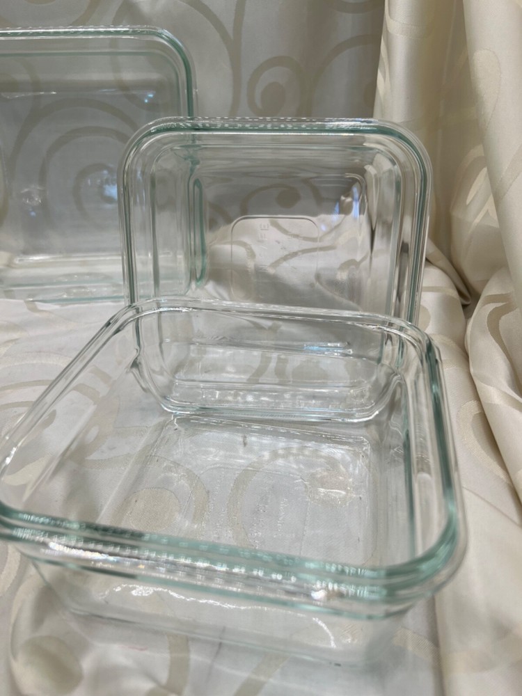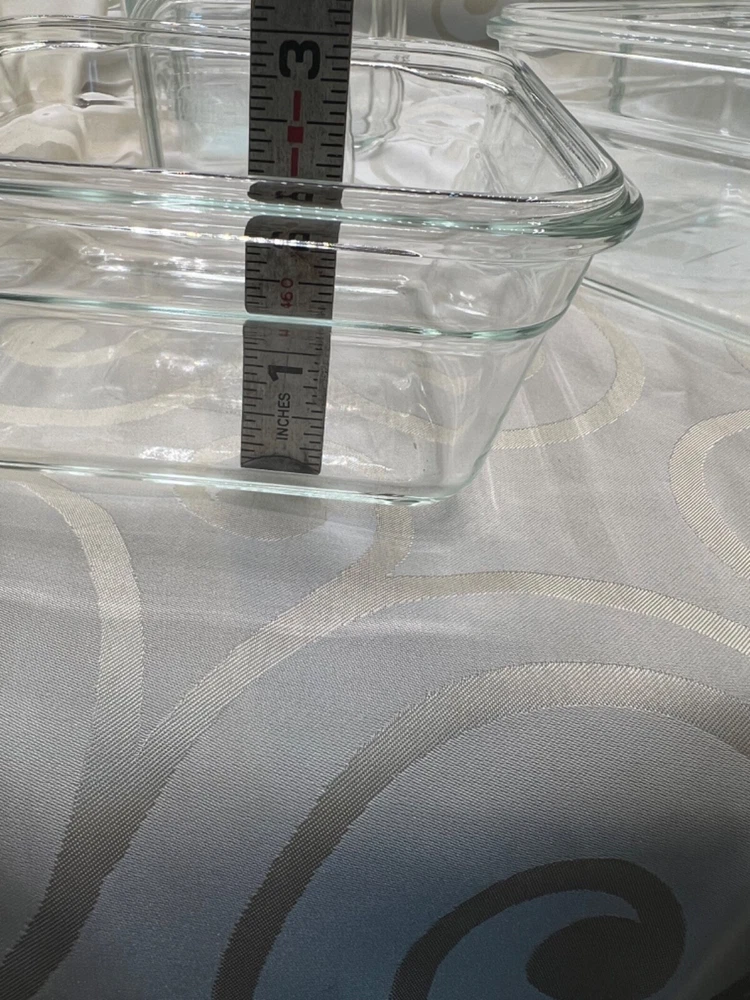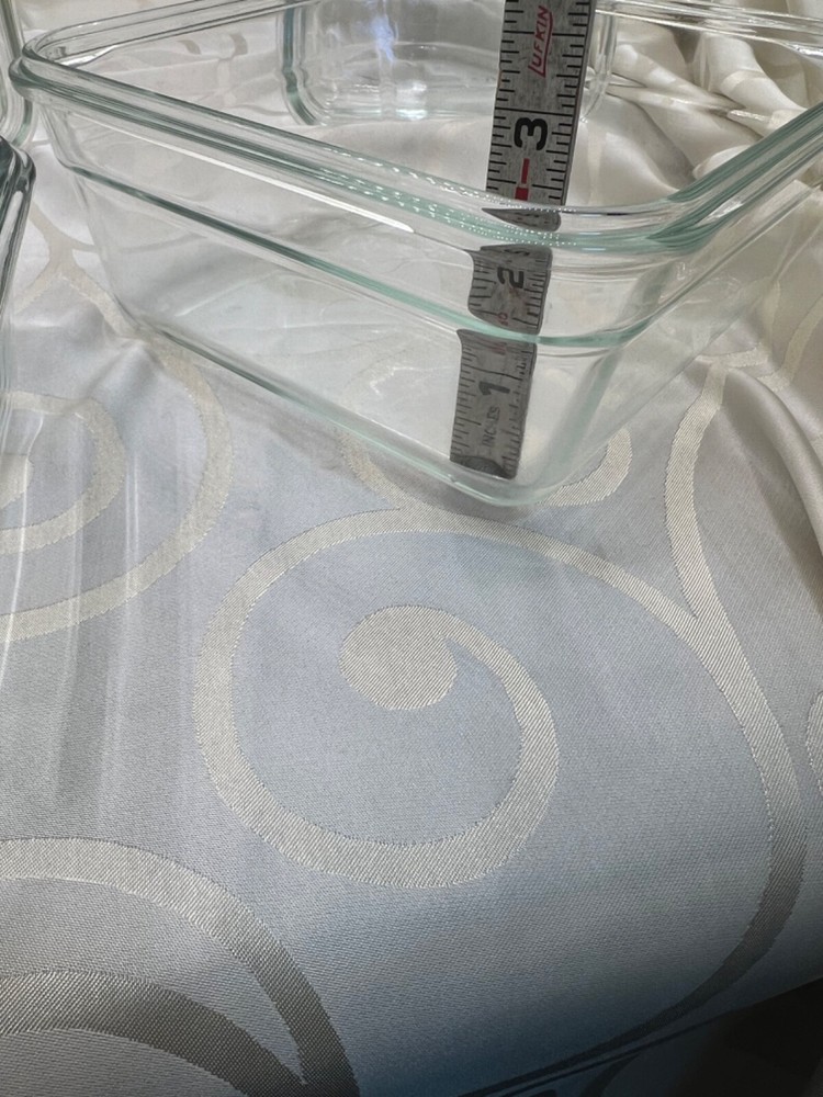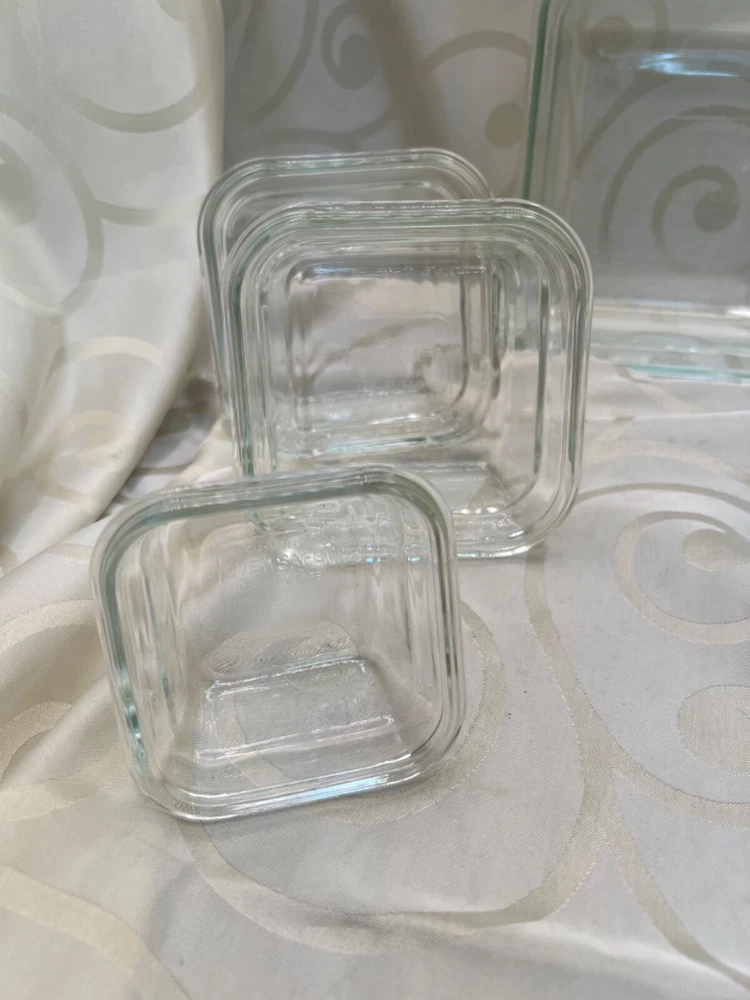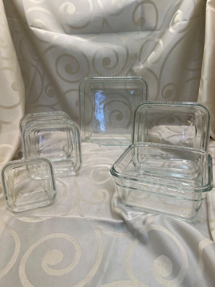 The Glasslock Oven Safe food storage set includes 6 square containers made of clear glass. The set comes in different sizes with capacities ranging from 1/2 cup to 6 cups. These containers have a height between 1 1/2 inches and 3 inches, and lengths varying from 2 inches to 7 inches. They do not have lids, making them suitable for oven and microwave use.