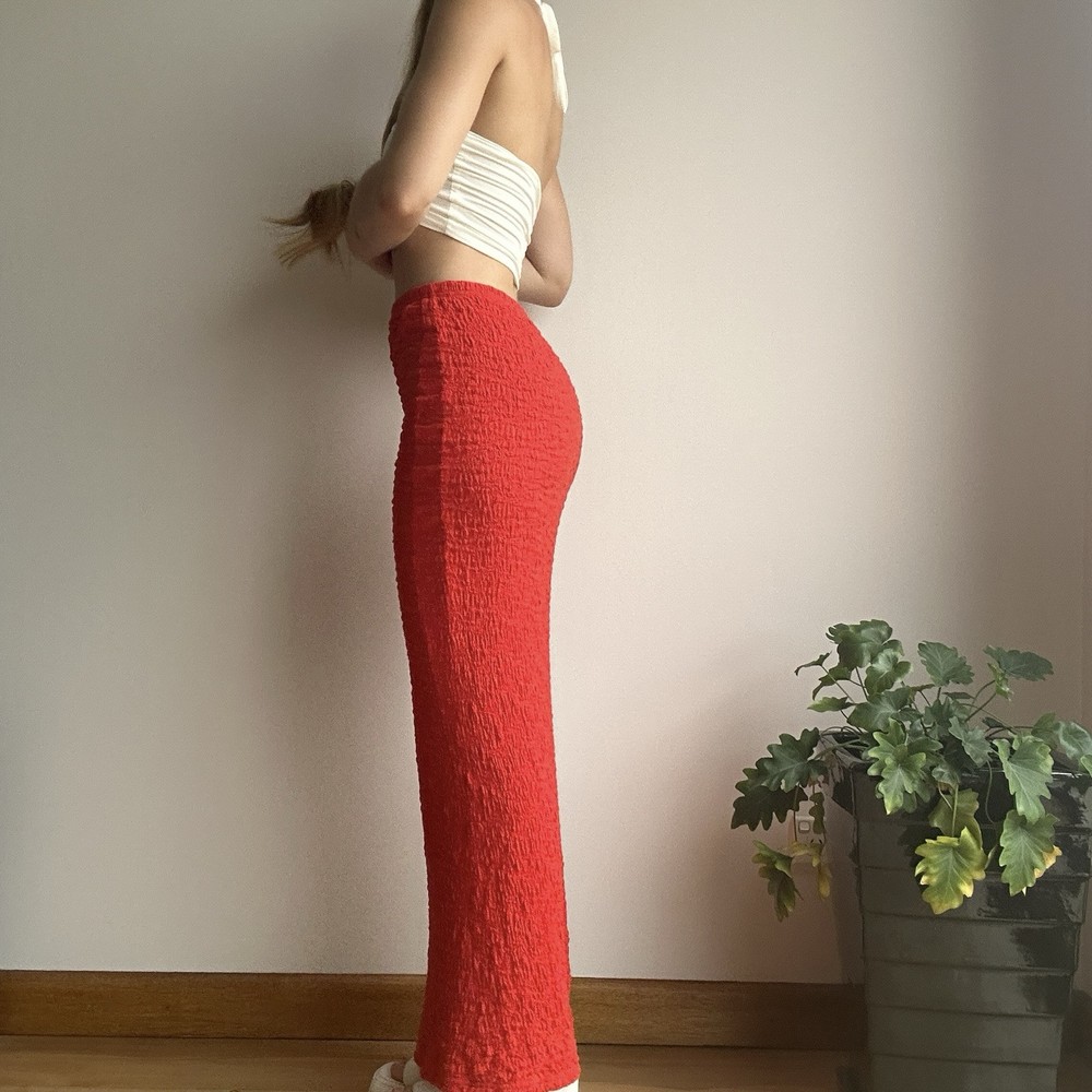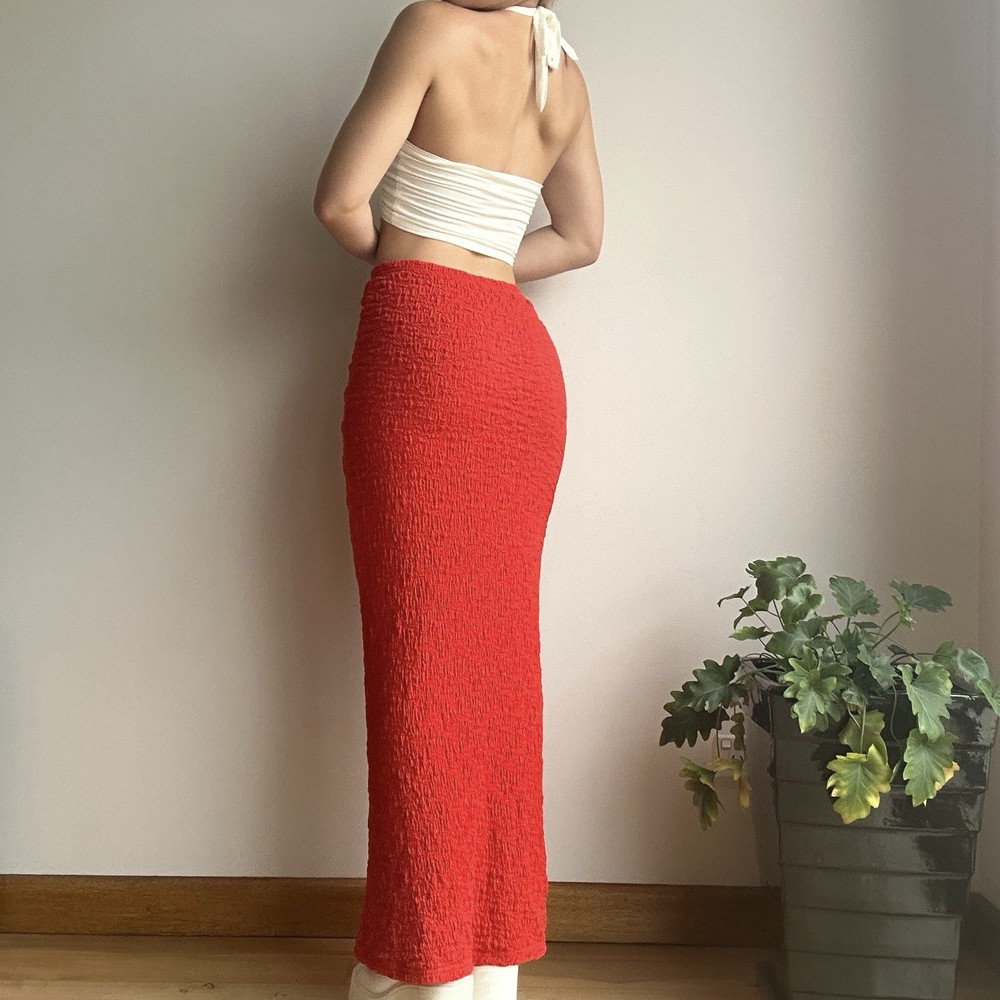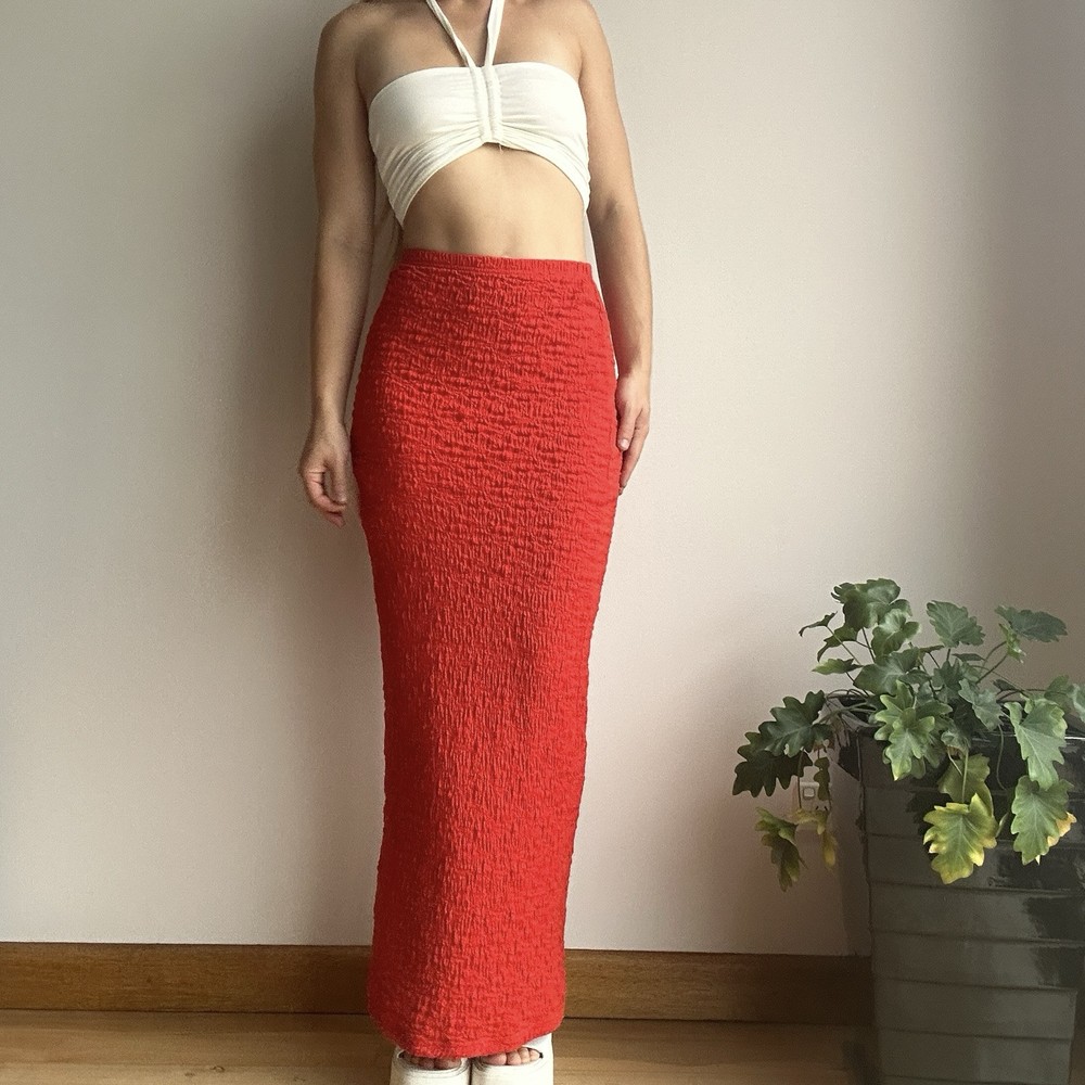 Rise: High Type: Skirt Closure: Pullover Handmade: No Size Type: Regular Vintage: No Brand: Glassons Department: Women Skirt Length: Long Style: Maxi Occasion: Party/Cocktail, Travel Pattern: Solid Seller Notes: “no faults to note” Features: Textured Season: Autumn, Spring, Summer Colour: Red Size: XS Material: Cotton, Elastane, Nylon