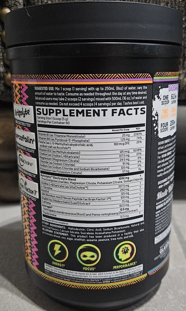 Brand: Glaxon Flavor: Voodoo Cola Expiration Date: 10/24 Item Weight: 10.5 oz Dosage: 5 g Active Ingredients: Caffeine, English Ivy, Vitamin B1 (Thiamine), Vitamin B6, Vitamin B12, Magnesium, Potassium When to Take: Before Workout, Afternoon, Morning, After Meal, After Workout, Before Meal, During Workout, Night Formulation: Powder MPN: na Type of Diet: Fitness, Gym & Training, Bodybuilding, Non-Vegetarian, Vegetarian, Weightlifting, Vegan, Pescatarian, Paleo Department: Women, Unisex, Men Country/Region of Manufacture: United States Type: Sports and Fitness Performance Number of Pills: na Ingredients: Beta-Alanine, Caffeine, Citric Acid, Vitamin B1 (Thiamine), Vitamin B12, Vitamin B6, Magnesium, Potassium Supply: Up to 1 Month Main Purpose: Fitness, Gym & Training, Bodybuilding, Energy Support, Endurance/Energy, General Wellness, Muscle Gain, Muscle Health, Running & Jogging, Sports and Fitness Performance, Weight Management, Ice Hockey, Field Hockey, Cycling, CrossFit, Boxing, Basketball, Baseball