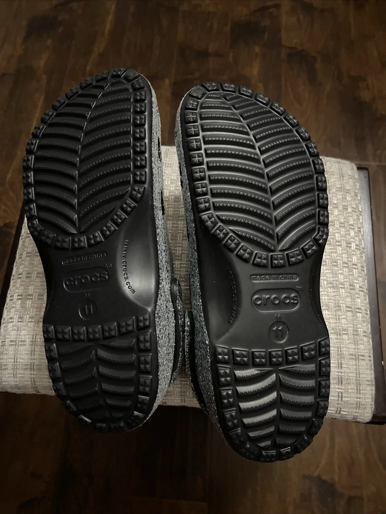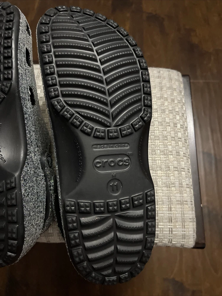 The "Glitter Crocs" are a pair of men's casual clog shoes in a size 11. They feature a glittery design on the rubber upper material, adding a touch of sparkle to the classic Crocs style. Perfect for lounging around the house or running errands, these Crocs combine comfort with a fun and stylish look.