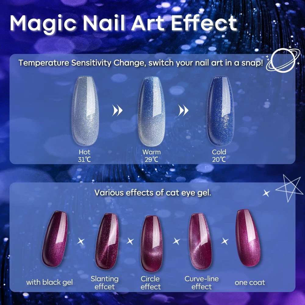 Glitter Gel Nail Polish Set 6 Colors, Fall Winter Color Changing Blue Cat Eye Magnetic Chameleon Reflective Black Temperature Chrome Manicure Design Multifunction Nail Art Manicure Kit Gift Special Gel Nail Polish Set: Limited Edition Space gel polish set, contains Glitter Blue Color Changing Gel, Purple Cat Eye Gel, Purple Sparkle Rainbow Shiny Gel, Diamond Shiny Powder Gel, Phantom Chameleon Gel, and Classic Black Gel.(Magnet included) You can experience 6 plus kinds of nail polish gel effects in one set! No more struggle to decide which colors should select, so you can DIY a colorful, stylish, modern manicure every time! Magic Nail Art Effect: The combination of each two gels can create a wonderful Nail Art Effect! The Mood Changing Gel has three temperature sensitivity changes, and the Cat Eye Gel also has various effects. More interesting designs are waiting for you to discover. Go enjoy the wonderful music festival with your eye-catching nails! Shimmery Pigmented Works of Art: Before curing in the lamp, take the magnet and place it to your liking to achieve the desired effect, it only takes a few seconds you will see! Then cure it in the lamp for 60 seconds. Remember that the closer the magnet is to the nails, the better the result, this does not mean that you have to keep it directly in contact with the polish. It allows you to create real works of art of great, great effect! Amazing Magnet Effects: Your perfect Thanksgiving Gifts. The fun of cat eye nails is just how customizable they can be. All you need is a tiny magnet included in the set as a gift. There are so many effects that can be created with this set. Easy and fast but still maintaining the professionalism of the product, keeping up with the fashion of the moment Manicure at Home: This Set is an ideal gift for a nail lover. It can be used to make lots of nail styles, perfect for all daily working, dating, party, ceremony activity, sports activities, birthdays, holidays. (Please take a skin test FIRST before using it to check for any reaction. The allergens mainly cause by acrylic resin Shipping We offer FREE shipping on all orders! We ship within Three business days of payment, usually sooner. We use a selection of shipping services such as UPS, FedEx, USPS etc. We only ship to the lower 48 states, no APO/FPO addresses or PO Boxes allowed. Local pickups and combined shipping options are not provided at this time. Return You can return a product for up to 30 days from the date you purchased it. Any product you return must be in the same condition you received it and in the original packaging. Please keep the receipt. Payment We accept payment by any of the following methods: PayPal Please pay as soon as possible after winning an auction, as that will allow us to post your item to you sooner! Feedback Customer satisfaction is very important to us. If you have any problem with your order, please contact us and we will do our best to make you satisfied. Contact Us If you have any queries, please contact us via ebay. We usually respond within 24 hours on weekdays. Please visit our eBay store to check out other items for sale! Thank you for shopping at our store.