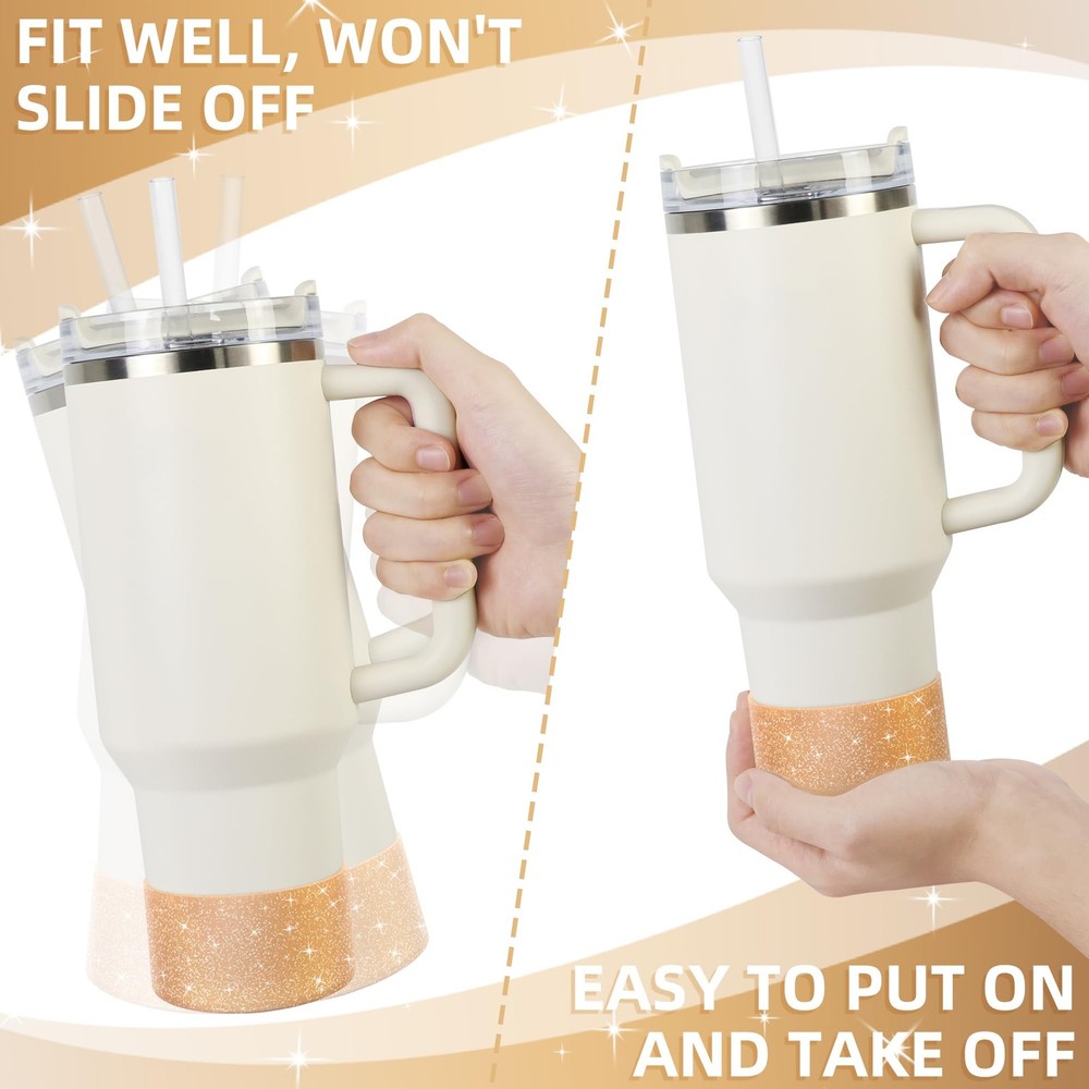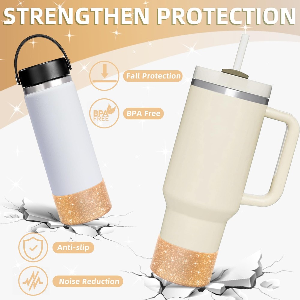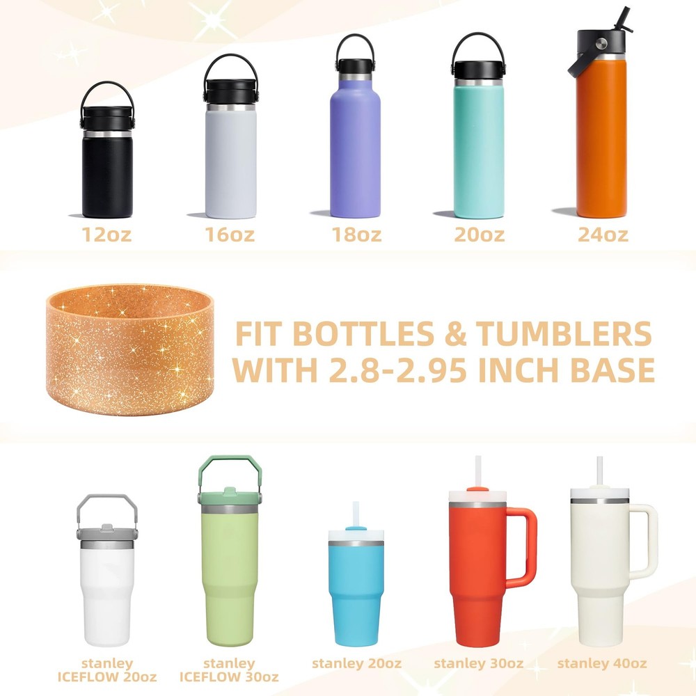 Product Details: Our copper silicone boot for Stanley cup accessories are 2.85 inches in diameter and 1.7 inches high. Suitable for water bottles with a base diameter of 2.8-2.95 inches, which can meet most 12-24oz water bottles on the market. If you are unsure, please measure the size of the bottom of your bottle before purchasing. Fits Perfectly: Our protective boot are specifically designed for Stanley Quencher(30/40oz) H2.0 and Stanley iceFlow (20/30 oz) Tumblers. Also fits Hydrojug Traveler 40 oz, Hydro Flask Wide Mouth (12/16/18/20/24 oz), Hydro Flask Standard Mouth (18/21/24 oz), Owala Tumbler 40 oz, Yeti Rambler Tumbler(20/30 oz), Yeti Rambler Travel Mug(20/30 oz), Simple Modern Tumbler (20/24/28/40 oz), Simple Modern Summit (14/18/22 oz) and Ascent (12/17/20/24 oz), Wide Mouth(12/18/24 oz), Standard Mouth(12/18/22 oz) and other water bottles. Silicone boots are available as Stanley cup accessories, Hydro Flask accessories, Owala accessories, Yeti accessories, etc. Premium Material: This water bottle boot is made of high-quality silicone, which is more flexible and does not deform. It is BPA-free and safe for children to use. Easy to use, easy to clean and reusable. Not only will it protect your water bottle from noise, dents and damage, but it will also make your water bottle look shiny and create a sparkling look for your favorite water bottle! Glitter silicone boot for stanley decorations, make your Stanley Cup more unique! Product Details: Our silicone boots are 2.85 inches in diameter and 1.7 inches high. Suitable for tumblers or water bottles with a base diameter of 2.8-2.95 inches. If you are not sure whether it is suitable, please measure the diameter of the bottom of your bottle before purchasing Fits Perfectly: Our protective silicone boots are specifically designed for Stanley Quencher(30/40oz) H2.0 and Stanley IceFlow (20/30 oz) Tumbler. Also fits HydroJug Traveler 40 oz, Owala Tumbler 40 oz, Hydro Flask Wide Mouth (12/16/18/20/24 oz), Hydro Flask Standard Mouth (18/21/24 oz), Yeti Rambler Tumbler(20/30 oz), Simple Modern Tumbler (20/24/28/40 oz), Simple Modern Summit (14/18/22 oz) and Ascent (12/17/20 oz), Wide Mouth(12/18/24 oz), Standard Mouth(12/18/22 oz) and others Bling-bling: Compared to ordinary boots, glitter silicone boot not only protect your water bottle from noise, dents, and damage, but they also make your water bottle appear shiny, creating a sparkling look for your favorite water bottle Premium Material: This water bottle boot is made of high-quality silicone, which is more flexible and won't deform. BPA-free and safe for children. Easy to use, easy to clean and reusable Satisfaction Service: After you receive the silicone boot, its surface may have sporadic sequins fall off, is a normal phenomenon. If there are any problems we will try our best to give you a satisfactory solution