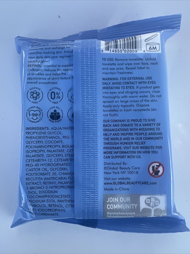 Gently removes dirt, oil, and makeup and leaves skin silky smooth and suitable for all skin types. A must have in spas and salons, they are also great for travel and for home use. Specifications Case Quantity: 1 Assortment Details: 25 -ct. packs of Global Beauty Care® Retinol Makeup Cleansing Wipes Brand: GlobalBeautyCare® We are always here to serve you. Remember if you have any questions regarding your purchase, please contact us before making your purchase. And we will be very happy to help you. Also remember before leaving negative or neutral feedback please contact us and we are happy to help and resolve any situation. We are available Monday through Friday 9:00 am to 5:00 pm. Saturday, Sunday and holidays we are not available. Thank you so much.