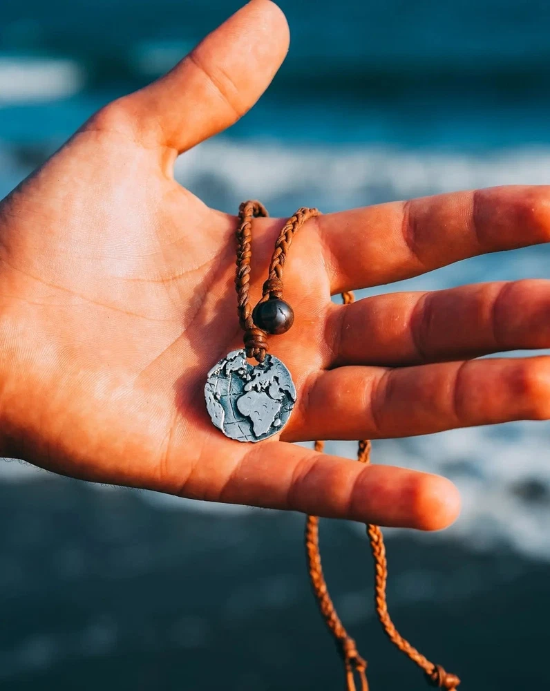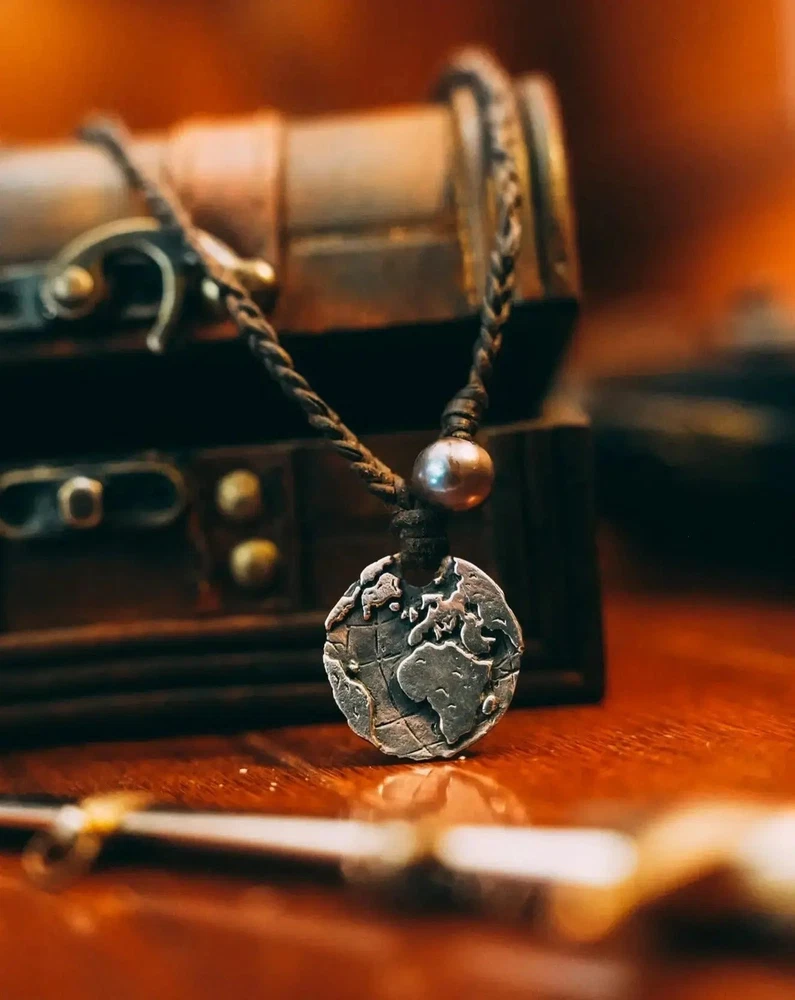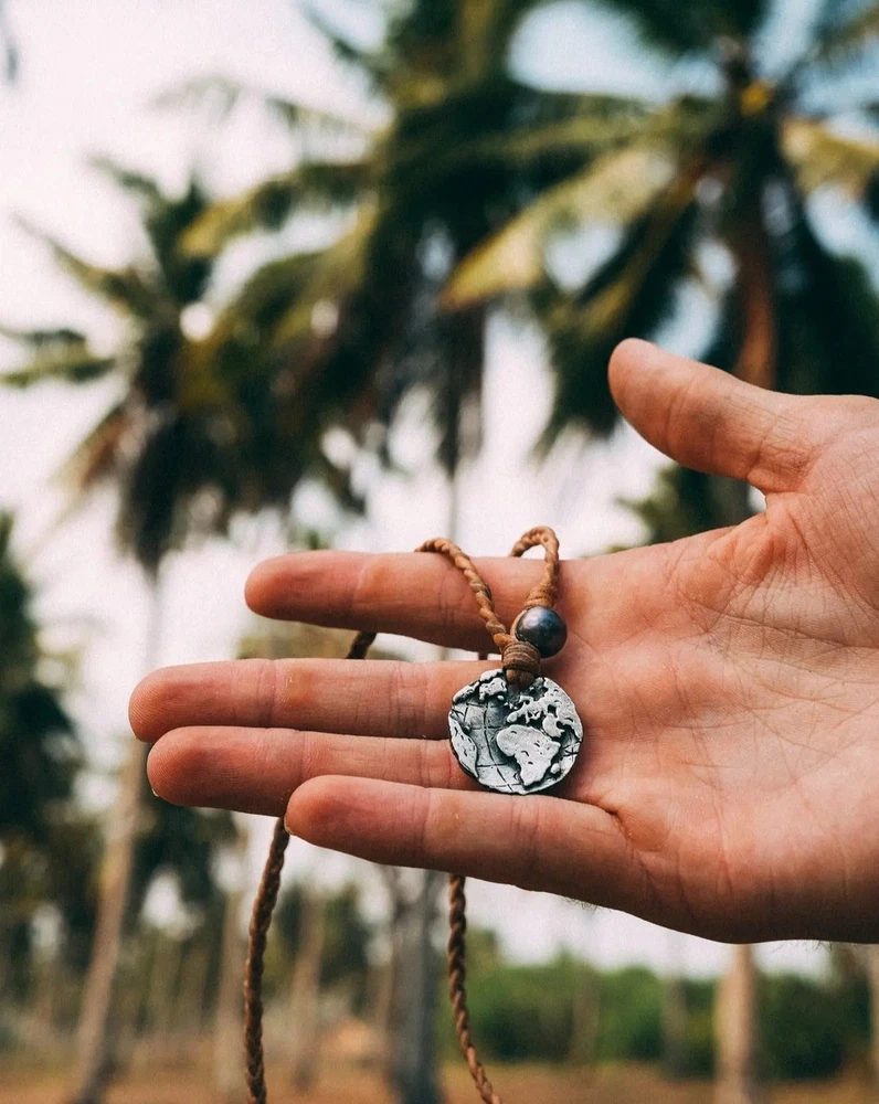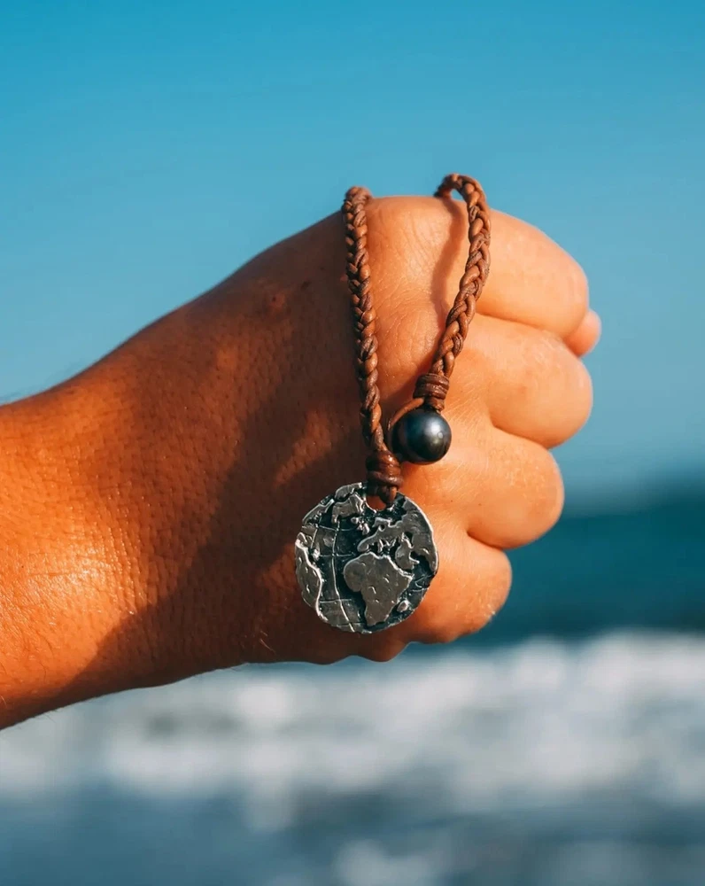 Globe Coin Necklace Navigate life's adventures with confidence wearing the Globe Coin Necklace. Crafted Premium 925 Silver, Leather & Authentic pearls, it is an accessory that complements any outfit and never needs to be taken off. - 925 Silver - Premium Black Pearl - Two white pearls in back for size adjustment - Authentic Braided Leather Chain Each piece is handmade to last a lifetime.