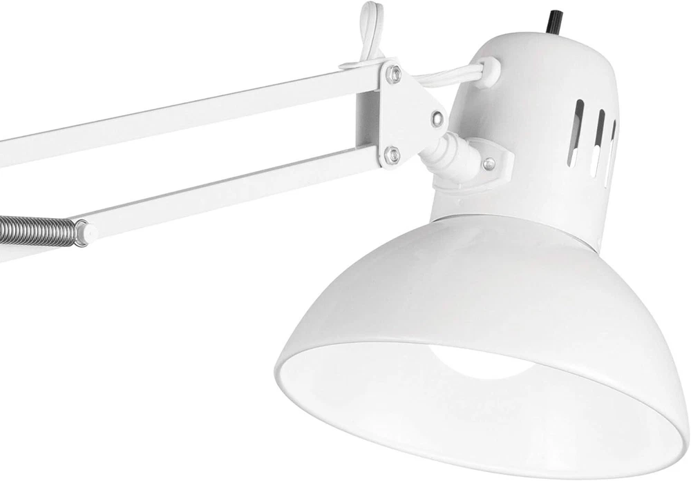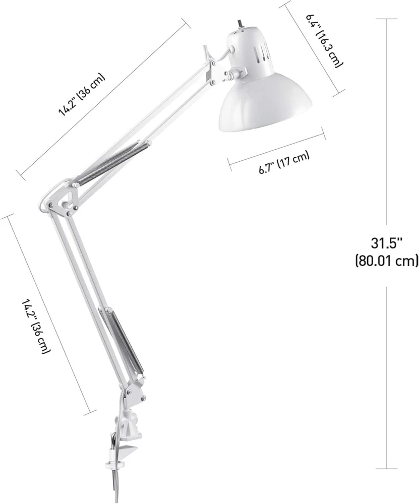 Globe Electric 52847 31.5 Inch Swing Arm Clamp-On White Desk Lamp with Product Details Finish Type: Glossy Base Material: Metal Bulb Base: E26 Product Dimensions: 21"D x 6.69"W x 31.5"H Item Weight: 1.9 Pounds MODERN ESSENTIAL: designed to illuminate blueprints and drafting papers, the Architect Lamp has been around since the 1920's but it has become a modern essential item for your home with exposed structural and architectural elements and a glossy white finish VARIABLE MOUNTING: the moveable metal clamp allows you to mount this lamp on any surface (up to 2" wide) such as a desk, bedframe, or counter while keeping the lamp upright and easy to use - a 6 foot (1.8 meter) cord gives you the length you need to reach any space BULB REQUIREMENTS: 1x E26/Medium Base 60W Bulb (sold separately) ADJUSTABLE: the spring-loaded arm and easily adjustable lamp head help direct the light wherever you need it the most ON/OFF ROTARY SWITCH: conveniently located on the top of the lamp shade for quick and easy use