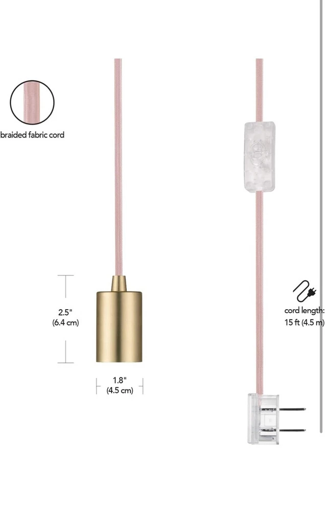 Open box New item! TRENDY MINIMALIST DESIGN: brighten any corner of your room using the trendy minimalist design of the Emile Pendant Light exclusively from the Novogratz and Globe Electric EXPOSED SOCKET: create a custom design with this exposed socket by adding one of our exceptional vintage-inspired or designer-created bulbs TRENDY COLORS: with this stunning mix of pink and brass, your home lighting will stand out for all the right reasons – on-trend and always in style BULB REQUIREMENTS: 1x E26 Medium Base 60W Bulb (sold separately) - Compatible with LED, Incandescent and Halogen Bulbs - LED or Incandescent Bulbs Recommended VERSATILE PLACEMENT: not only is the 15-foot hanging cord a superb color, it also allows you to place your pendant wherever you need it most