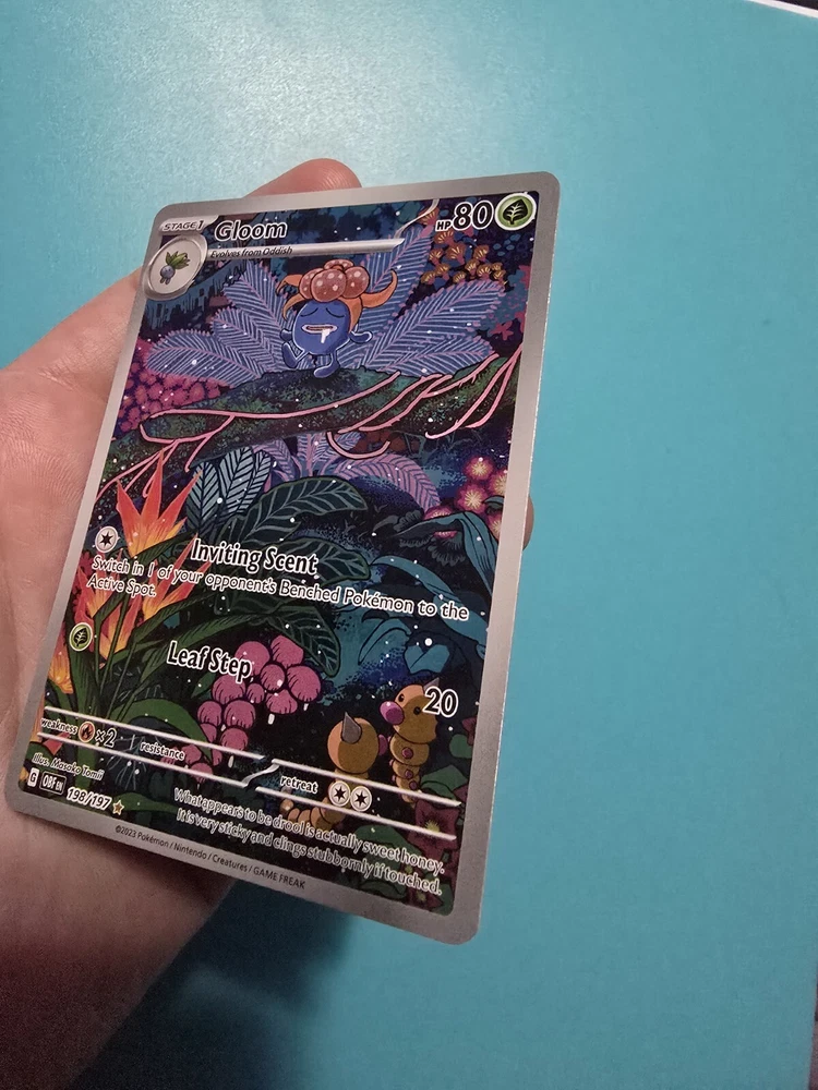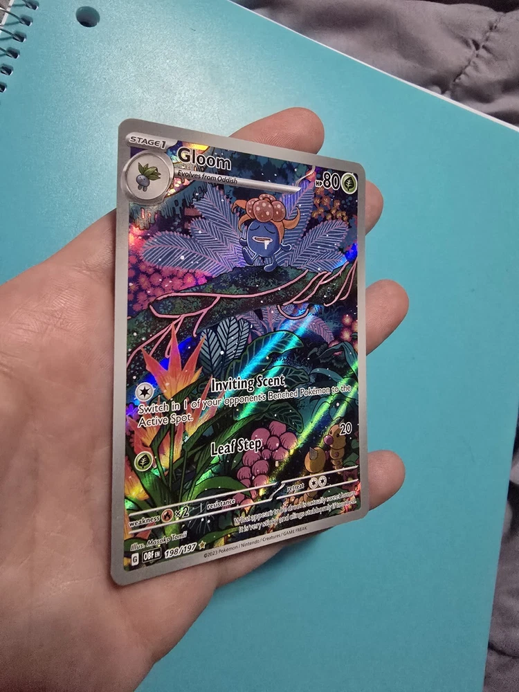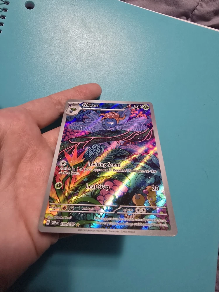 Finish: Holo Card Type: Pokémon HP: 80 Game: Pokémon TCG Creature/Monster Type: Flame Stage: Stage 1 Card Number: 198/197 Set: Sv03: Obsidian Flames Manufacturer: The Pokémon Company Language: English Rarity: Illustration Rare Card Name: Gloom