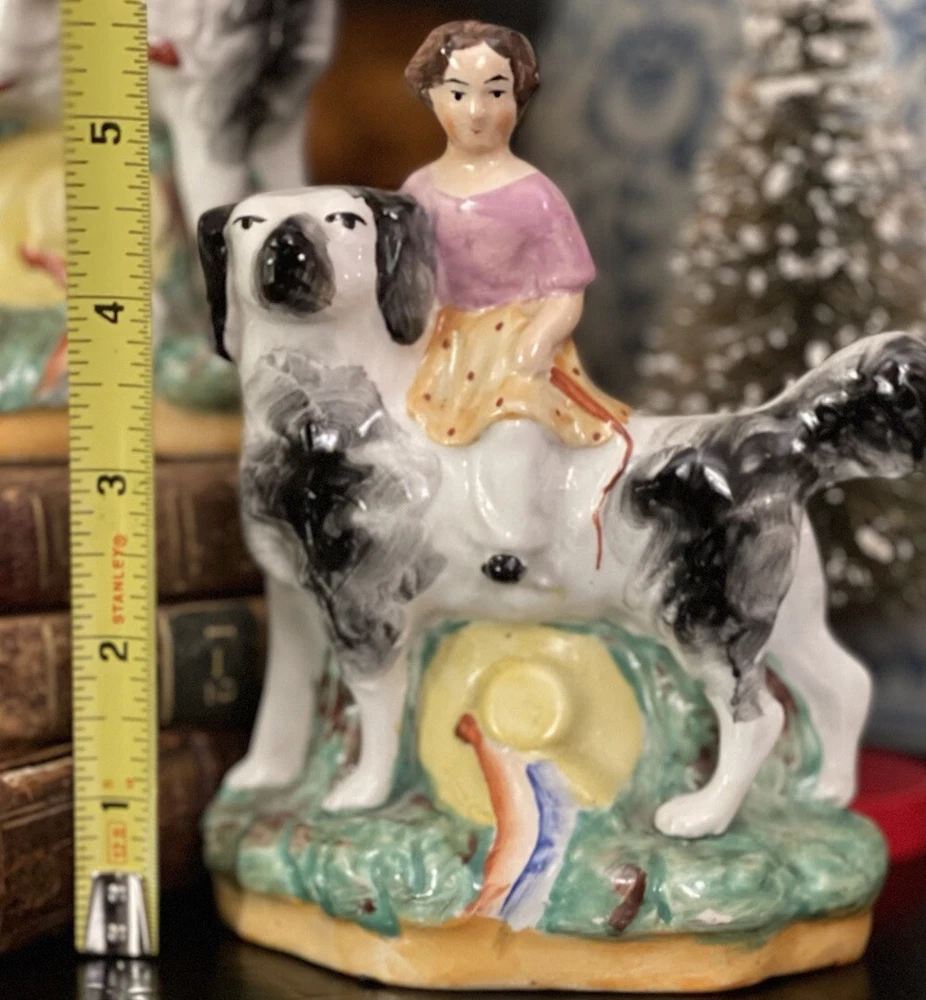 Handmade: Yes Brand: Staffordshire Finish: Glaze Original/Reproduction: Original Rare Find Pattern: Traditional Set Includes: Right and Left Facing Mantle Dog Pair Origin: Staffordshire Country/Region of Manufacture: United Kingdom Production Style: Art Pottery Material: English Porcelain Product Line: Figural Giant Spaniel Flatback Mantle Pairs Item Width: 2” Item Length: 4.5” Number of Items in Set: Two-Piece Style: Traditional English Color: Polychromatic Item Height: 5.5” Antique: Yes Features: Noble Ladies Riding Giant Spaniels Original/Licensed Reproduction: Original Backstamp: Printed Production Technique: Modelled Theme: Giant English Country Life Animals Shape: Figural Spaniel Dogs with Riders Occasion: All Occasions Type: Figural Pair Staffordshire Giant Mantle Spaniels Noble Ladies