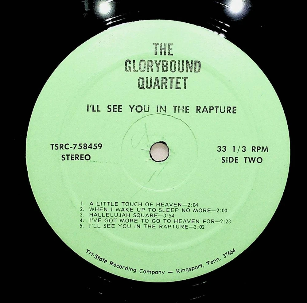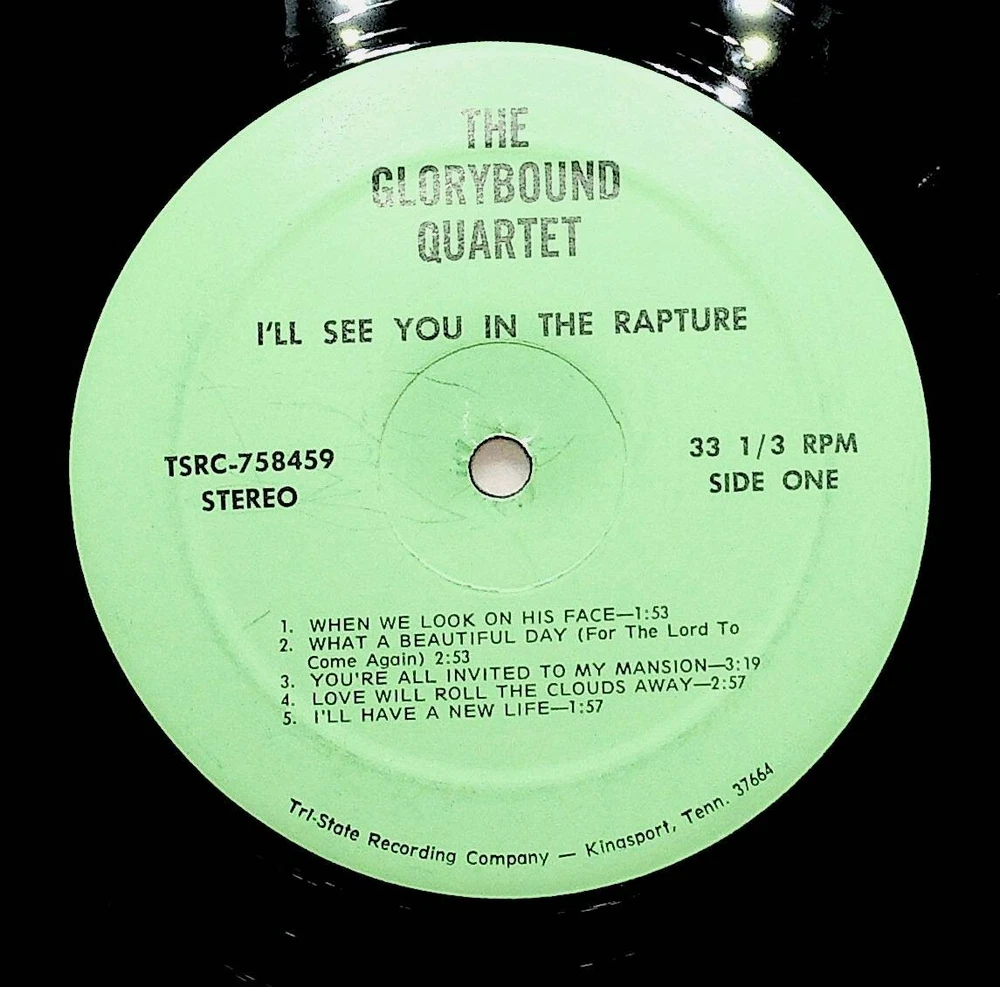 Yes we combine shipping for multiple purchases. Add multiple items to your cart and the combined shipping total will automatically be calculated. Glorybound Quartet See You In The Rapture Gospel Vinyl LP Record NO JACKET VG+ Vinyl Grade per Goldmine Standard: VG+; NO JACKET SIDE ONE 1. WHEN WE LOOK ON HIS FACE 1:53 2. WHAT A BEAUTIFUL DAY (For The Lord To Come Again) 2:53 3. YOU’RE ALL INVITED TO MY MANSION 3:19 4. LOVE WILL ROLL THE CLOUDS AWAY 2:57 5. I’LL HAVE A NEW LIFE 1:57 SIDE TWO 1. A LITTLE TOUCH OF HEAVEN 2:04 2. WHEN I WAKE UP TO SLEEP NO MORE 2:00 3. HALLELUJAH SQUARE 3:54 4. I’VE GOT MORE TO GO TO HEAVEN FOR 2:23 5. I’LL SEE YOU IN THE RAPTURE 3:02 The main difference between The Glorybound Quartet and most other Quartets is that they truly have what it takes, and more important they know who gave it to them. In respect to having good harmony, a neat appearance, and an overall good presentation, they are second to none. When it comes to a spiritual outlook on their singing abilities, they have the main ingredient that separates them from other singing groups. These young men are not a gospel QUARTET; they are a GOSPEL quartet. You be the judge as you listen to this record and feel the warmth and sincerity surround you. I believe then, you will see this is truly a "GLORYBOUND QUARTET." DARRELL HENLEY-PIANO ERVIN WYATT, JR.-LEAD DON FIELDS-DRUMS RICKY WYATT-TENOR JIMMY NICKELS-BASS . MIKE WYATT-BARITONE Piano: DARRELL HENLEY Drums: DON FIELDS Steel: EDDIE TRENT Bass: TIM COMPTON Guitars: BOBBY ALL Recorded At: TRI-STATE RECORDING COMPANY Kingsport, Tennessee 37664 P. O. BOX 649 ABINGDON, VIRGINIA 24210 MR. DARRELL HENLEY, MGR.
