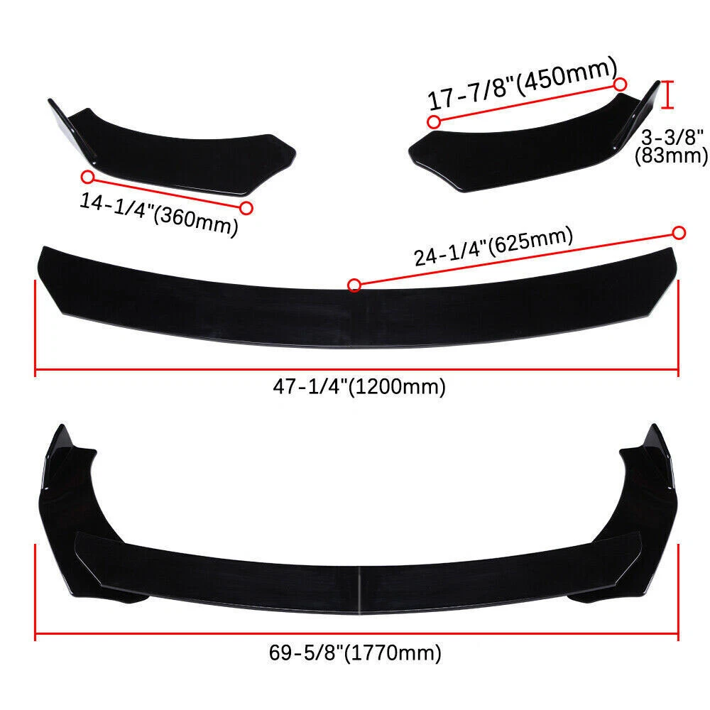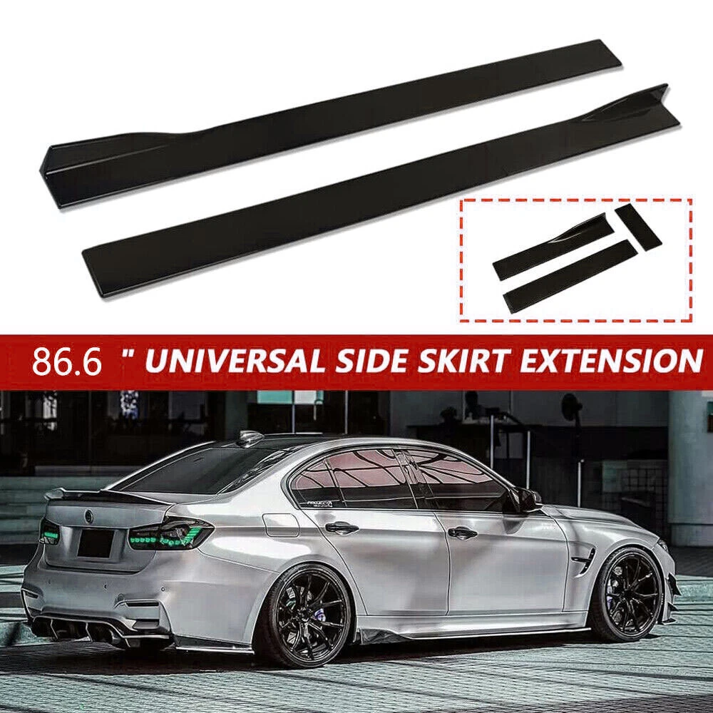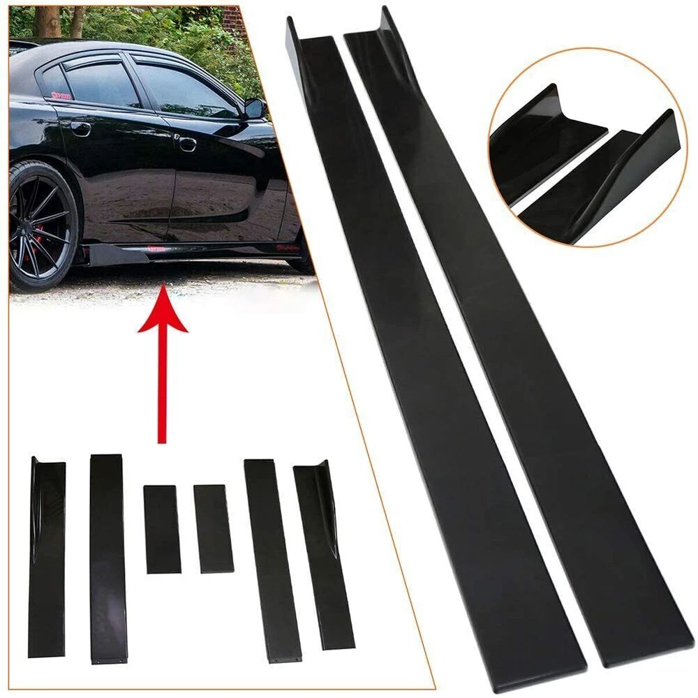 Package Included 1:Front Lip Chin Bumper Specification: Condition: 100% Brand New Type: Front Lip Chin Bumper Body Kits Material: Polyurethane Color: Glossy Black Placement on Vehicle: Front ; Lower Features: Give your vehicles sporty appearance Protect Your Bumper From Scratching Strict quality control standards to Build and test. Come With Screws, for quick installation Professional Installation Is Highly Recommended. Fit for Universal width 75". Require: Product will require drilling holes into the bumper and/or lip/diffuser to attach safely to the vehicle. Package Included 2:Side Skirt ( 2pcs ) Specification: Condition: 100% Brand New and High Quality Type: Car Body Side Skirts Material: Polyurethane Color: Glossy Black Length Size:2.2m(Make Sure 2m Length is the size you want!!!!!!!!!!!!!!!!!!!!!) Position: Side Skirt Extension Features: Universal modified side skirt for car sedan. While the side skirts don't affect the front ground clearance too much, it enhances the side extension of the in a very pure and exciting way. A Perfect Aftermarket Replacement. Professional Installation Is Highly Recommended. Package Included 3:Rear Lip ( 2pcs ) Specification: Condition: 100% Brand New and High Quality Type: Car Body Rear Lip Material: Polyurethane Color: Glossy Black Rear Lip Size:19 in x 4.33 in Placement on Vehicle: Left, Right Package Includes: 4pcs/set Front Lip Chin Bumper Body Kits 2x Side Skirts 2x Rear Lip 2xStrut Rods Screws kit Require: Product will require drilling holes into the bumper and/or lip/diffuser to attach safely to the vehicle. - It's does not fit the car has a curve underneath by the back door.our item is straight.