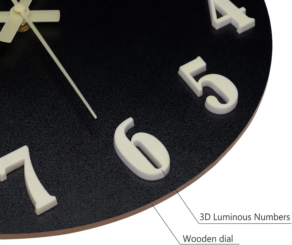 Feature: 【Glow in The Dark】The big clock numbers and hands which have night light function. It asks for absorbing enough light energy during the day. At night, it is released in a fluorescent manner, so you can see the light at night or in the dark.Tips: The product might be run out of energy during a long day in the box, so I advise to let the wall clock absorb light energy (sunshine or fluorescent lamp) more than 4 hour before installation when receive the products. 【No-Ticking Slient sweep Movement】The premium quality of the precise quartz movement guarantee accurate time, also the silent sweep ensures a good study and work environment.Non ticking super silent,you no longer have to worry about its annoying clicking noises at night. 【Easy to Read】Glowing clock hands and large 3D numbers makes it easier to read at night, which makes reading the time easy from any angle,especially suitable for the elderly and people with poor eyesight. 【Simple to Install】Hooks included allows easy installation, just put a small nail through the plastic hook and it securely hangs on your wall within a few seconds.(1 hook included).Powered by one AA battery (not included) please use normal carbon battery for the clock. 【Perfect Wall Decoration】This wall clock suitable for living room, bedroom, kitchen, office, study, garage, meeting room, class room, church and any other places which needs a silent environment. Detail: Color : Black frame, black background Material: Plastic frame, Glass lens, Aluminum clock hands Dimension: 12 x 12 x 1.57 in Weight: 350g Style: Modern / Classic Power Supply:1 x AA 1.5V Battery (Not included) Package Include: 1* Clock without battery