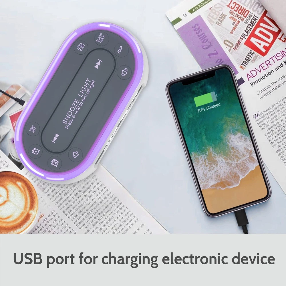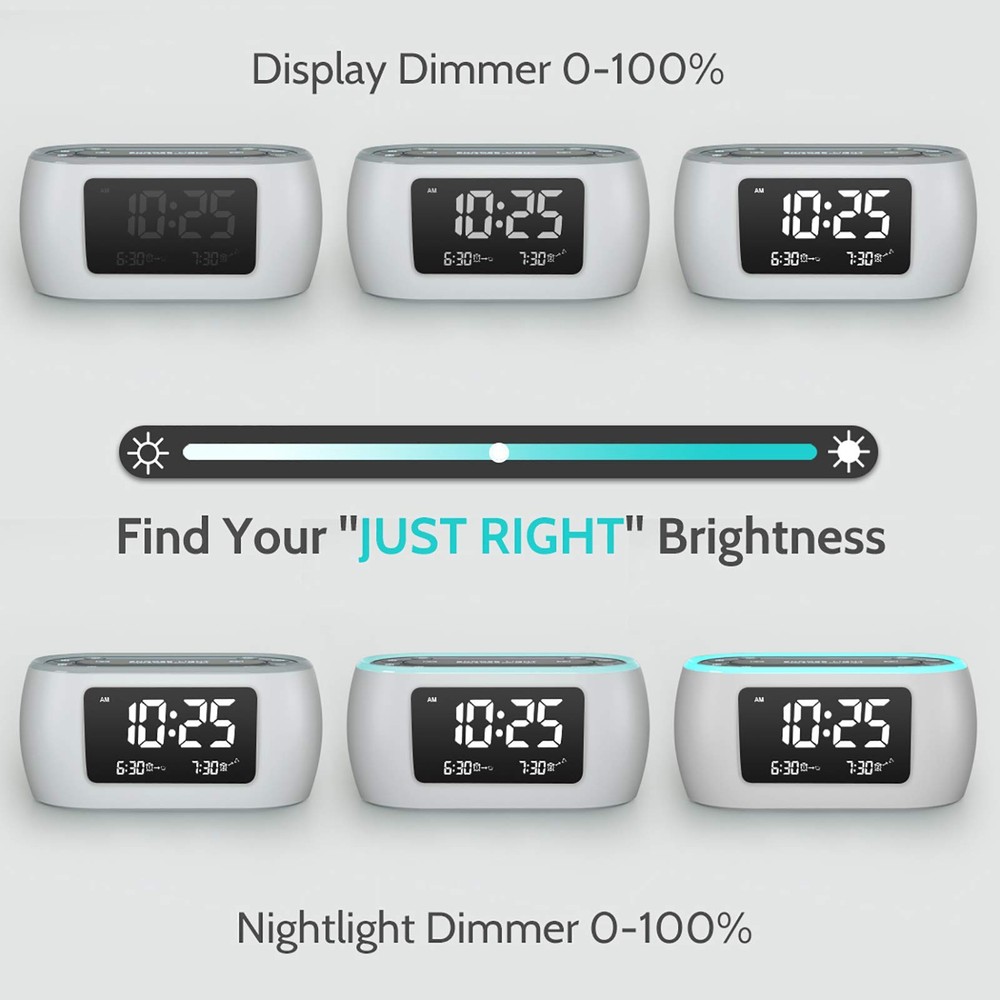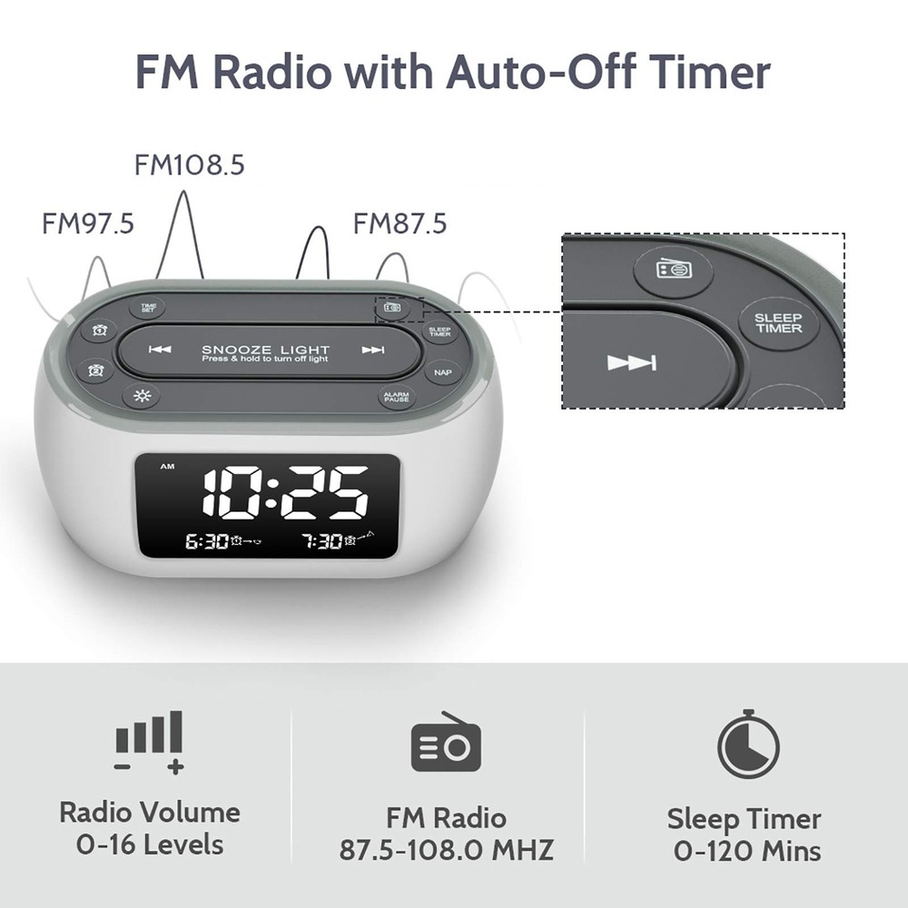 The Glow is an alarm clock with radio and nightlight, intended to combine easy listening with a fun way to fall asleep and wake up every night and morning. FEATURES: 7 COLORS NIGHTLIGHT Glow provides 7 color nightlight with 5 level adjustable brightness to add an element of charm to your bedroom every night. It is fun for kids to change color to their everyday mood. Plus a radio for bedtime music and story to enjoy a soothing and pleasant bedtime before sleeping. THE SILICONE MATERIAL For those worried about loud noise in night when you press the button, the top setting button of Glow comes with silicone material, differ from many other cheap clicky plastic button, it has nice touch and lower noise when you press. BATTERY BACKUP Glow is outlet powered and can be backup with 3X AAA batteries( Battery is not included). Glow stays fully functional, time will show and your alarm will still wake you up in the morning while running off batteries. LIGHTED- IN-THE -DARK-BUTTON The buttons for setting are situated on the top of the Glow, so you can find them easily when you’re half-asleep. What’s more, there have lighted -in- the- dark button, which means that even if in night,you can find the actual setting button when you need to adjust. INCLUDES 1 × Glow alarm clock 1 × Power Adapter 1 × User Manual TECH SPECS Dimension: 4.8 x 2.44 x 2.44 inches Power: AC100-240V, 50/60Hz Battery: 3 AAA ( Battery is not included) Display: 0-100% brightness control for display Volume: 0-16 Level Adjustable Volume 【3 IN 1 CLOCK RADIOS WITH DIAL DIMMER】- Glow is an alarm clock, nightlight, and FM radio, all in one. Customizable nightlight color, brightness, alarm sound, volume level. Glow also features a variable dial display dimmer that allows you to set it as bright or dim as you wish easily 【NIGHTLIGHT & RADIO WITH AUTO OFF TIMER】- Glow provides 7 color nightlight with 5 level brightness to add an element of charm to your bedroom. Plus a radio for bedtime music to enjoy a soothing and pleasant bedtime before sleeping. You can also set sleep timer to turn off both nightlight & FM radio automatically 【DUAL ALARM WITH 3 WAKE UP SOUNDS】- GLow provides dual alarm to wake you up with your favorite radio station, built-in beep sound or birds chirping. The alarm volume is adjustable and it increases in volume slowly so that it doesn’t startle you awake 【UNIQUE LIGHTED BUTTONS & NAP TIMER】- The lighted in-the-dark buttons, perfect for when you want to adjust the volume and such at night without having to turn on any harsh lights. Glow also features a nap timer, just push a single button to set a nap from 10mins to 120mins without having to reset your regular alarm programs 【OUTLET POWERED AND REAL BATTERY BACKUP】- Glow is outlet powered and can be backup with 3*AAA batteries (battery is not included). Glow stays fully functional, time will show and your alarm will still wake you up in the morning while running off batteries. Buy it you will love it !