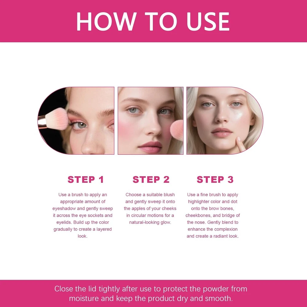 Free eBay listing template designed by dewiso.com Eye & Cheek Palette- Eyeshadow and Highlighter Makeup, Eyeshadow & Highlighter Duo with Radiant Color Palette, Seamless Blendability for All-Day, Day-to-Night Wear FREE AND FAST SHIPPING! About this item 【All-in-One Design, Simplified Routine】This versatile makeup palettes combines highlighter, blush, and eyeshadow in one. Featuring both matte and shimmery finishes, it effortlessly creates focal-point makeup for the entire face, meeting diverse needs from natural daytime looks to elegant evening styles 【Silky-Smooth Texture & Rich Pigmentation】 Experience the luxury of our makeup palette. Its skin-friendly, velvety formula blends effortlessly and delivers buildable, highly-pigmented color for a seamless finish, from subtle to stunning 【Long-Lasting & Skin-Hugging Wear】 Designed for all-day wear. The finely-milled powder resists fading, caking, or patchiness, keeping your highlighted glow fresh and radiant through hours of wear 【Universal Shades for Versatile Looks】 Create your perfect glow with this versatile highlighter makeup. The thoughtfully curated shades flatter all skin tones and can be layered for everything from a soft daytime highlight to an intense evening radiance 【Compact & Travel-Ready, The Perfect Gift】 Meet your essential. This sleek, all-in-one compact is perfect for travel and on-the-go touch-ups. Beautifully packaged, it makes a flawless and fashionable gift Show more Product We offer a 30-Day Return Policy on items which you are not completely satisfied with. You have the option for a full-refund or an exchange of the item. No returns are available on items shipped outside of the US . Shipping We offer Free Shipping to the US and ship within 2 business days of payment, usually sooner. We use UPS express shipping. That's why your products are usually delivered within 3 days . Contact We try our very best to make sure every customer is completely satisfied. If there's a problem , message us! We're happy to help. 24/7 live chat available.