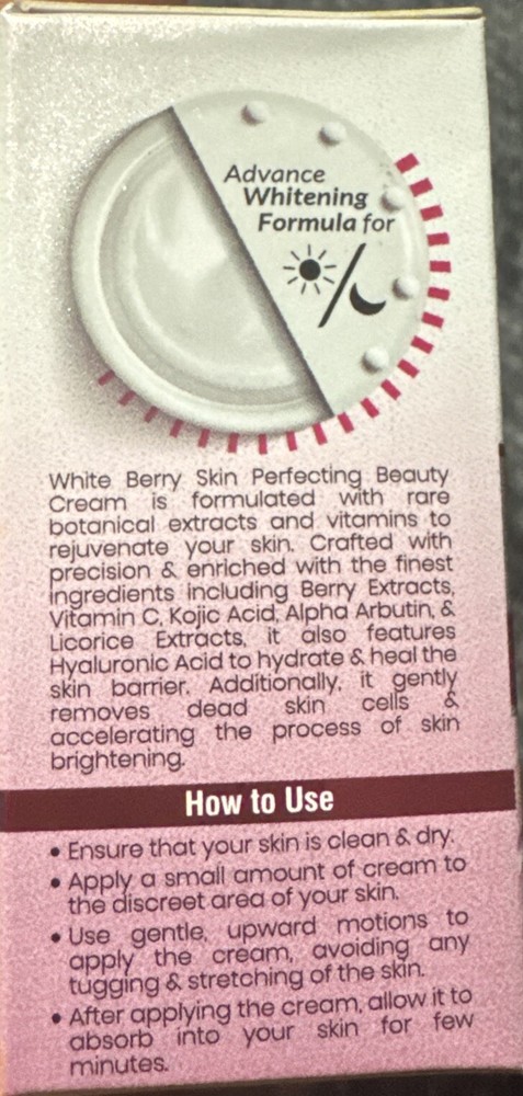 Formulation: Cream Ingredients: Water, Glycerin, Goji Berry Body Area: Face Brand: Creme Product Line: White Berry Type: Daily Use Features: Hydrating Color: White