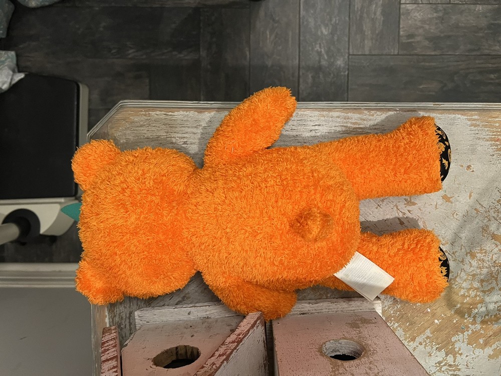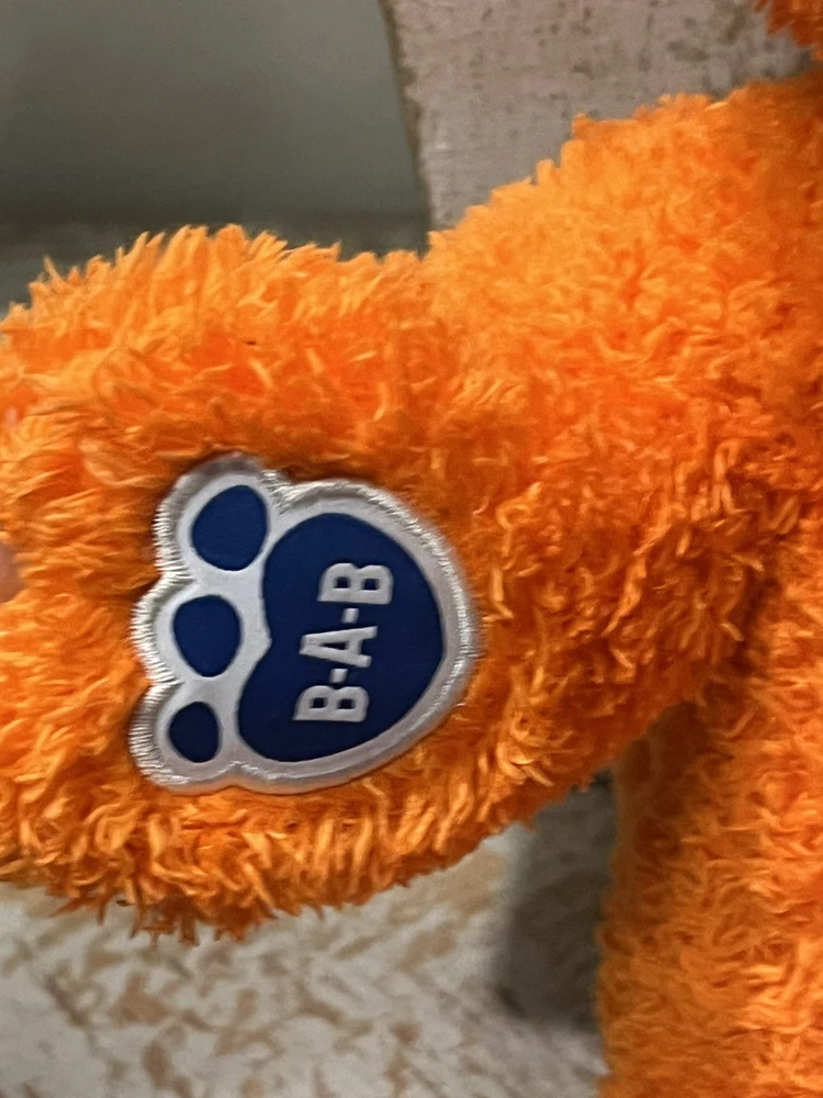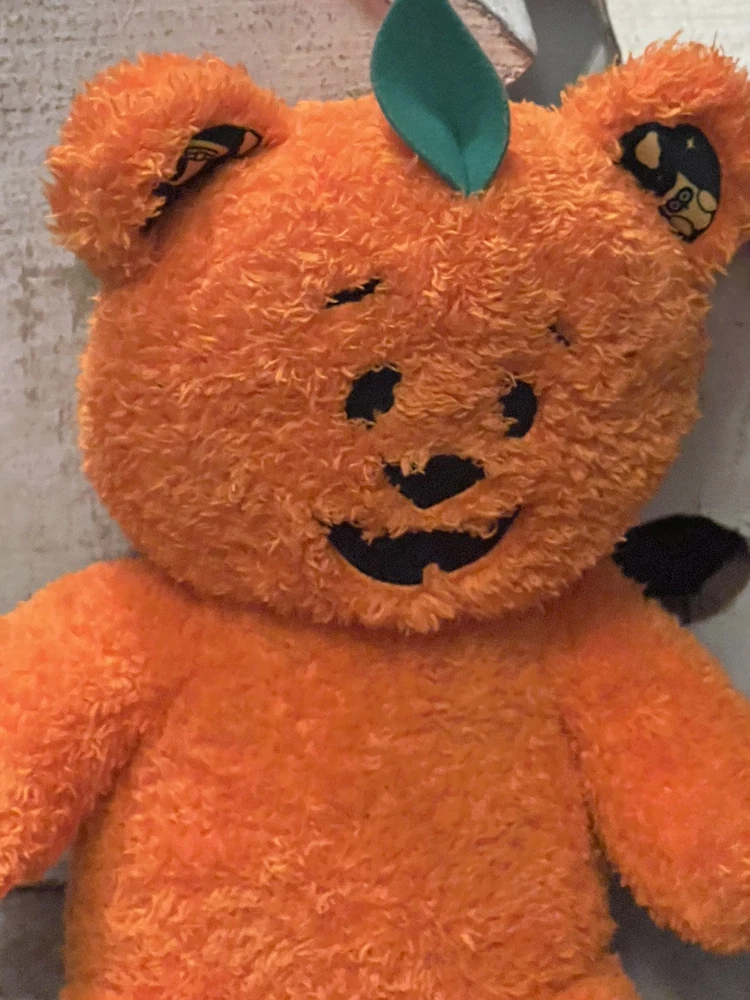 The Build-a-Bear Pumpkin Glow Halloween Teddy Bear is a 16-inch plush bear in orange color, featuring a Jack O Lantern character design perfect for Halloween. This original Build-A-Bear Workshop creation is made of plush material and includes a light-up feature that works. It is a single unit sold, not an antique, suitable for the time period of 2010-2019, and part of the Build-a-Bear franchise. This festive bear is a fun addition to any Halloween-themed collection or as a playful decoration during the spooky season. Will ship without batteries.