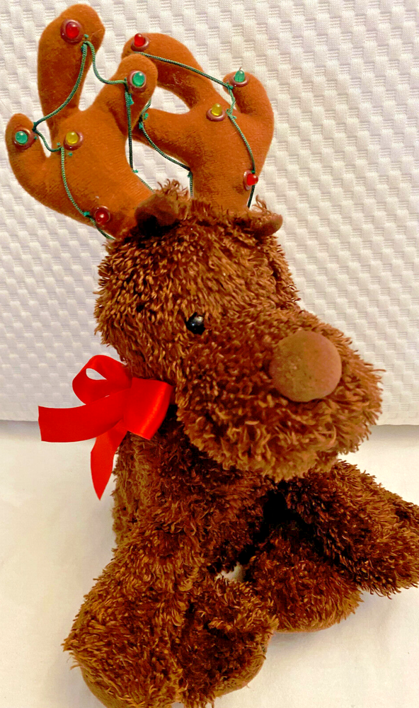 Brown Reindeer with light up antelers plush. Sings jingles bells, head moves white he sings. Great addition to your home for christmas decor. Charming plush reindeer antlers light up as he sings jingle bells and his head dances around. Vintage.