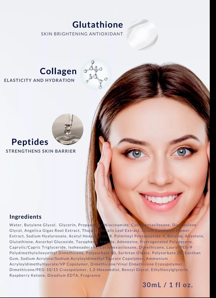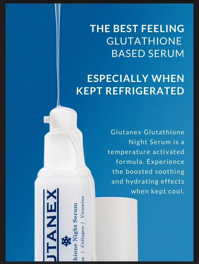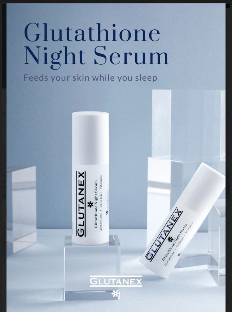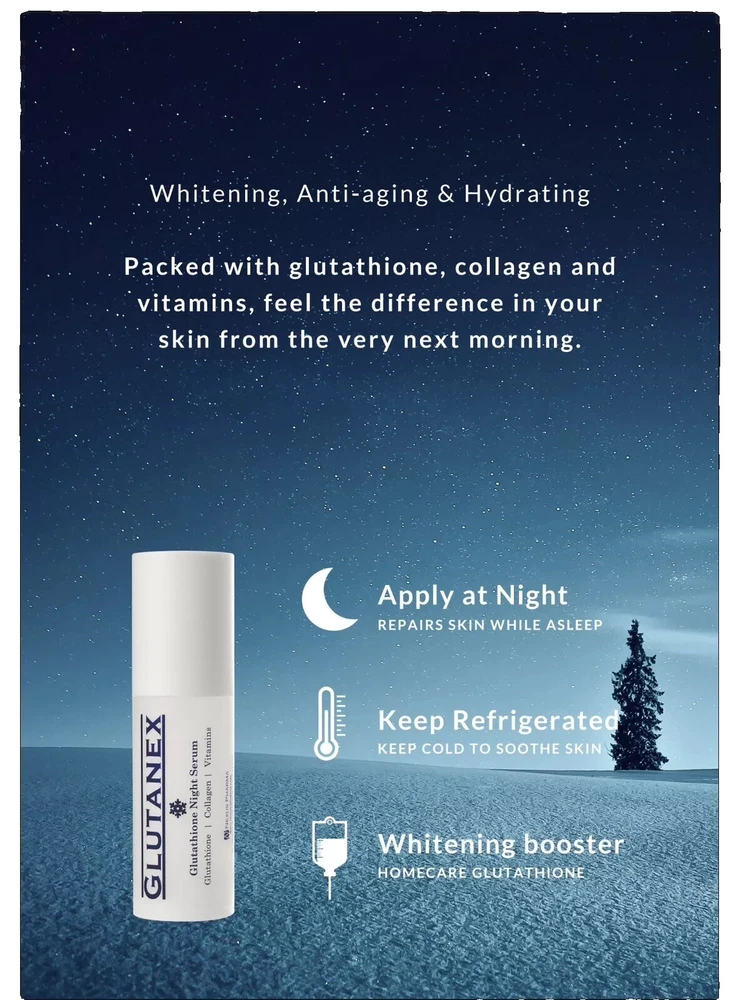Glutanex Night Serum. 30 ml Description Introducing Glutanex Glutathione Night Serum 30ml, your nighttime booster for glowing skin that you can indulge in every night. Formulated to ensure that your skin receives the best nutrients while you sleep, Glutanex Night Serum is packed with glutathione, vitamins, collagen, and peptides. Feel the transformative difference in your skin the next morning as it appears more radiant, rejuvenated, and refreshed. **Key Features:** - **Nighttime Nourishment:** This serum works overnight to nourish and replenish your skin, providing it with essential nutrients for optimal health and radiance. - **Powerful Ingredients:** Infused with glutathione, vitamins, collagen, and peptides, this serum delivers potent skincare benefits, targeting various skin concerns and promoting overall skin health. - **Convenient Packaging:** Each package includes a 30 ML serum bottle, ensuring long-lasting use and convenience. **Usage Instructions:** - **Serving Size:** Apply a dime-sized amount of the serum before bedtime, gently massaging it onto clean, dry skin in upward motions. Enhance your skincare routine by pairing Glutanex Glutathione Night Serum with other Glutanex products like Snow White Cream, Facial Mask, Glow Peptide Solution, and Sunscreen Stick. Experience the ultimate skincare regimen and wake up to visibly radiant, glowing skin every morning. WE DO NOT GUARANTEE RESULTS. RESULTS VARY FROM PERSON TO PERSON. SAFETY: Before use, perform a SPOT TEST to test for sensitivity as follows: Apply or rub product/products to a patch of skin on the inner, lower arm. Rub it in and allow it to dry on the skin. Do not wash that area of the skin for at least 24 hours; watch for signs of reaction. If rash, burning, tingling, or inflammation occur, immediately remove the product from skin and discontinue all further use.