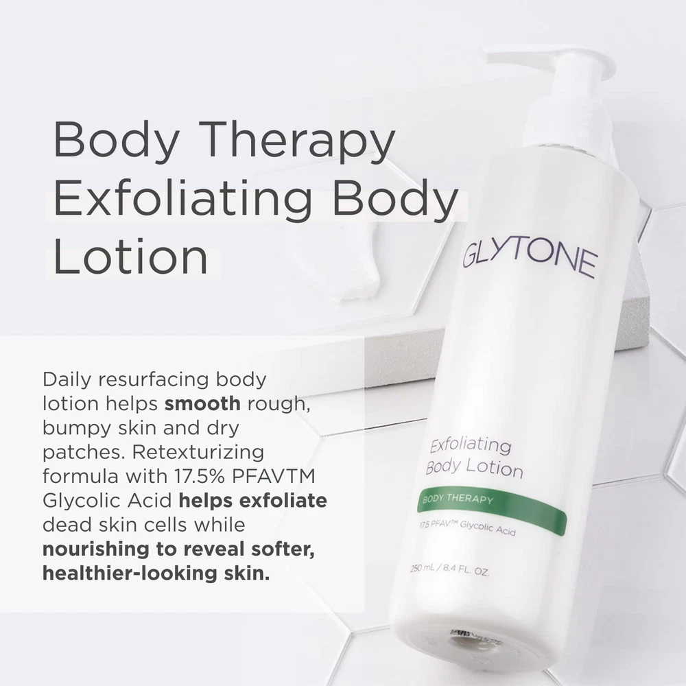 Leveraging Powered with 17.5% Free Acid Value Glycolic Acid, this rich, hydrating body lotion moisturizes, exfoliates dead skin cells & erases rough bumps to correct texture and reveal smoother, healthier skin. Apply daily to arms, back of hands, legs and other dry areas on the body. Product Description Leveraging Powered with 17.5% Free Acid Value Glycolic Acid, this rich, hydrating body lotion moisturizes, exfoliates dead skin cells & erases rough bumps to correct texture and reveal smoother, healthier skin. Brand Story Glytone, transforming solutions for beautiful and healthy looking skin