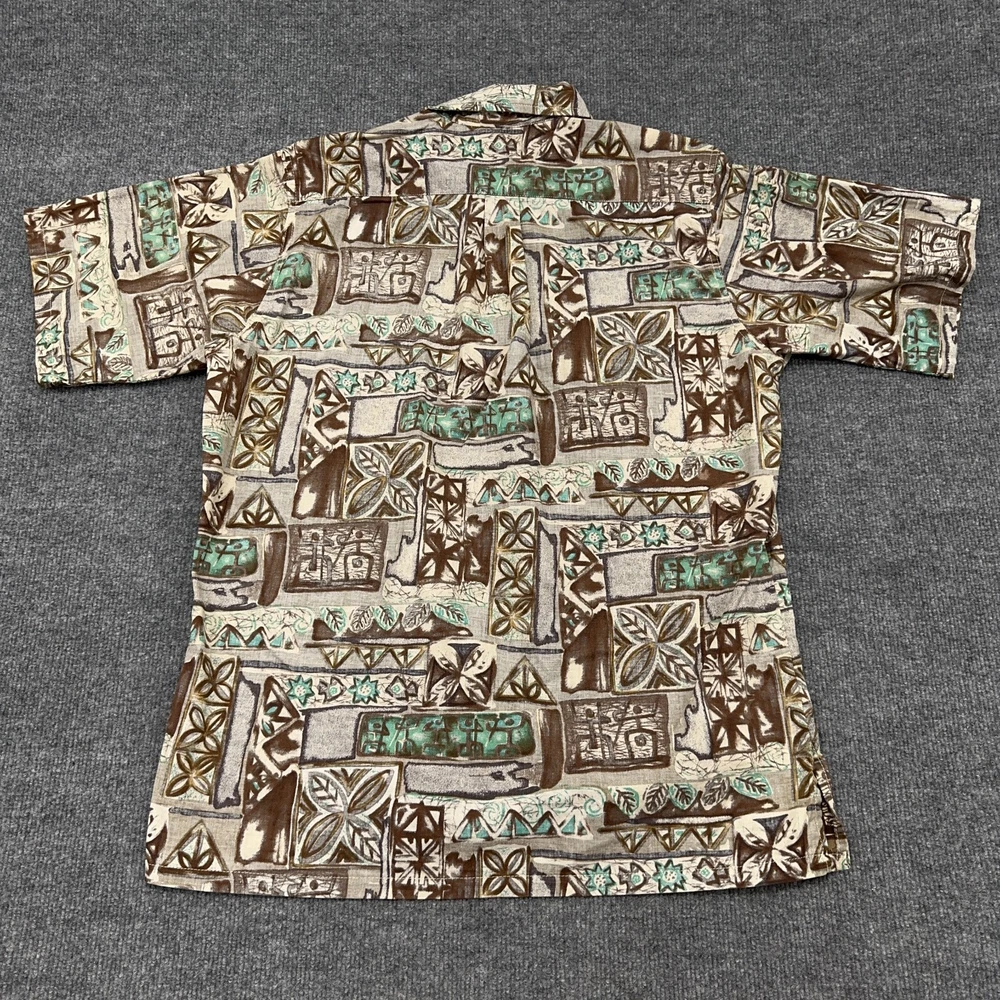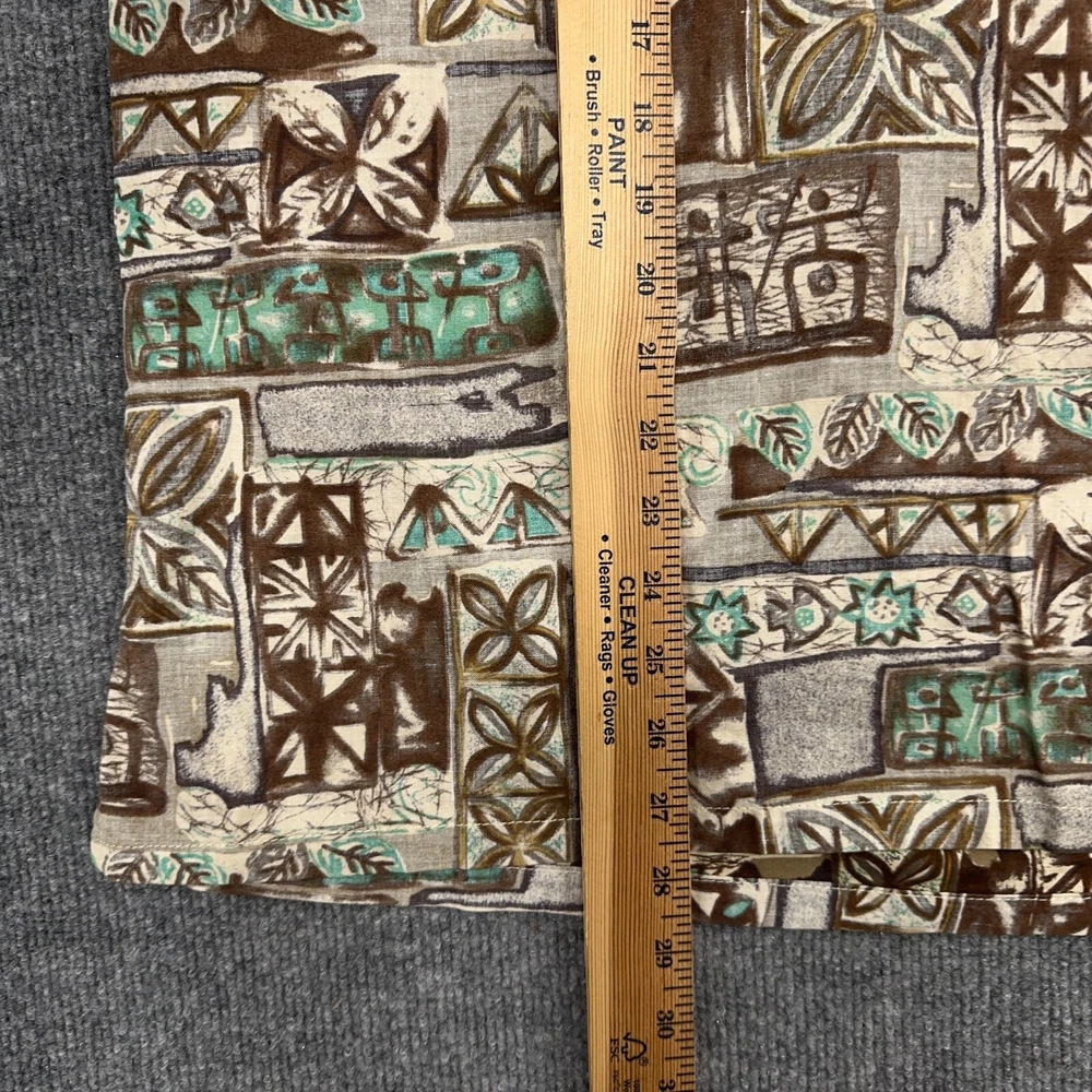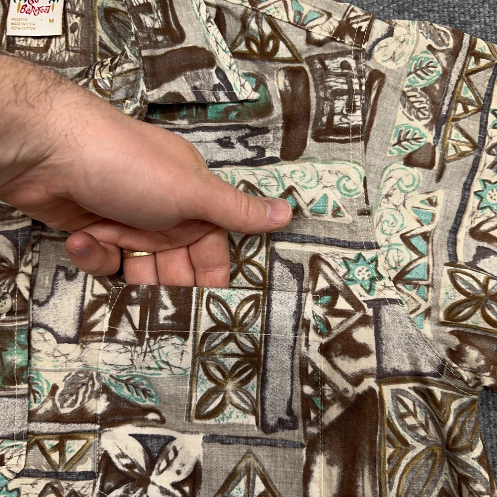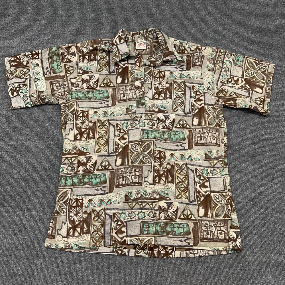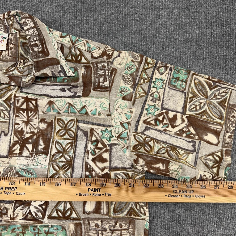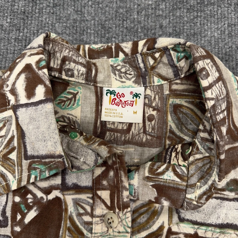 Go Barefoot Hawaiian Shirt Mens M Brown Green Geometric Popover Button Up In good condition. Please see photos for measurements.