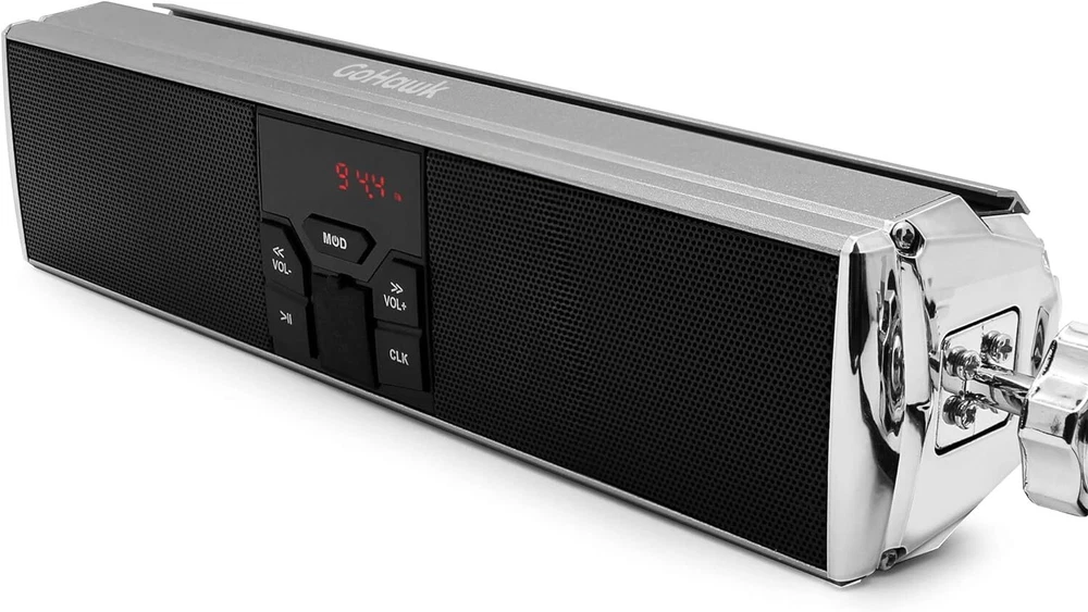 =============================================================== =============================================================== 1) Bluetooth Wireless 2) 24 White LEDs Strip 3) USB 2.0 4) AUX-IN 5) FM Radio 6) Display with Clock Cover: 87.5 - 108 MHz Sensitivity: ≤37dB Distortion: ≤0.5% SNR: ≥40dB LED Color: White Body Color: Silver Side Plate Color: Chrome Mounting Clamp Color: Silver Rated Voltage: 12V DC Max Input Power: 12W x 2 Rated impedance: 4 - 8Ω Bluetooth Ver.: 4.0 Bluetooth Protocol: AVRVP1.0, GAVDP1.0, ADVTP1.0, A2DP1.0 Wireless transmission range > 15m Frequency range:20Hz - 20KHz 3.5mm Audio Jack: No AUX-IN: 3.5mm USB: Support USB Drive in mp3 format USB Charging: No Dimensions: Speaker Width(Body): 9-3/4 in. Speaker Width(Overall): 18-1/4 in. Handlebar Clamp Size: 7/8 to 1-1/4 in. 1 x Speaker Stereo Main Unit 2 x Mounting Clamp 1 x Power Harness 1 x User Manual GoHawk's motorcycle soundbar speaker features an innovative mounting design with a new ball stub design and mounting clamp that supports 7/8" to 1 1/4" handlebars. The 360-degree swivel-able feature allows for custom installation, and the speaker comes with a 59" battery cable harness with a ring terminal connector, making it easy to install. The GoHawk RE9-X model has an overall width of 18-1/4" and is compatible with most motorcycles, ATVs, UTVs, 4-wheelers, go-karts, and golf karts. Before purchase, make sure to measure your handlebar center clearance. If you have a smaller handlebar clearance, consider the RE8 model with an overall width of 16-3/4". GoHawk's dual waterproof motorcycle stereo speakers come with a high-performance power amplifier built-in and 24 white LED strips that can be turned on and off with one click. The speaker clamp has a universal fit for 7/8" to 1 1/4" handlebars, and the aluminum stereo main unit has a satin finish and a digital display for easy use. This motorcycle speaker has Bluetooth wireless capabilities that allow you to stream your favorite music and radio channels from your smartphone. It is compatible with a wide range of devices, including iPhone, iPod, Samsung Android Galaxy S Note series, and any smartphone devices. It also supports USB MP3 files, FM radio, and has a clock display. Enjoy superb crystal sound quality with this advanced waterproof motorcycle speaker designed for 12V applications. The satin-finished stereo unit is built with high-quality aluminum material and is perfect for outdoor use. It's easy to install with all necessary hardware and wiring included, and it comes with a standard 12V power connection for plug-and-play convenience. Brand GoHawk Model Name RE9 X Speaker Type Outdoor, Soundbar Connectivity Technology Bluetooth, Auxiliary, USB Special Feature Waterproof 5961861
