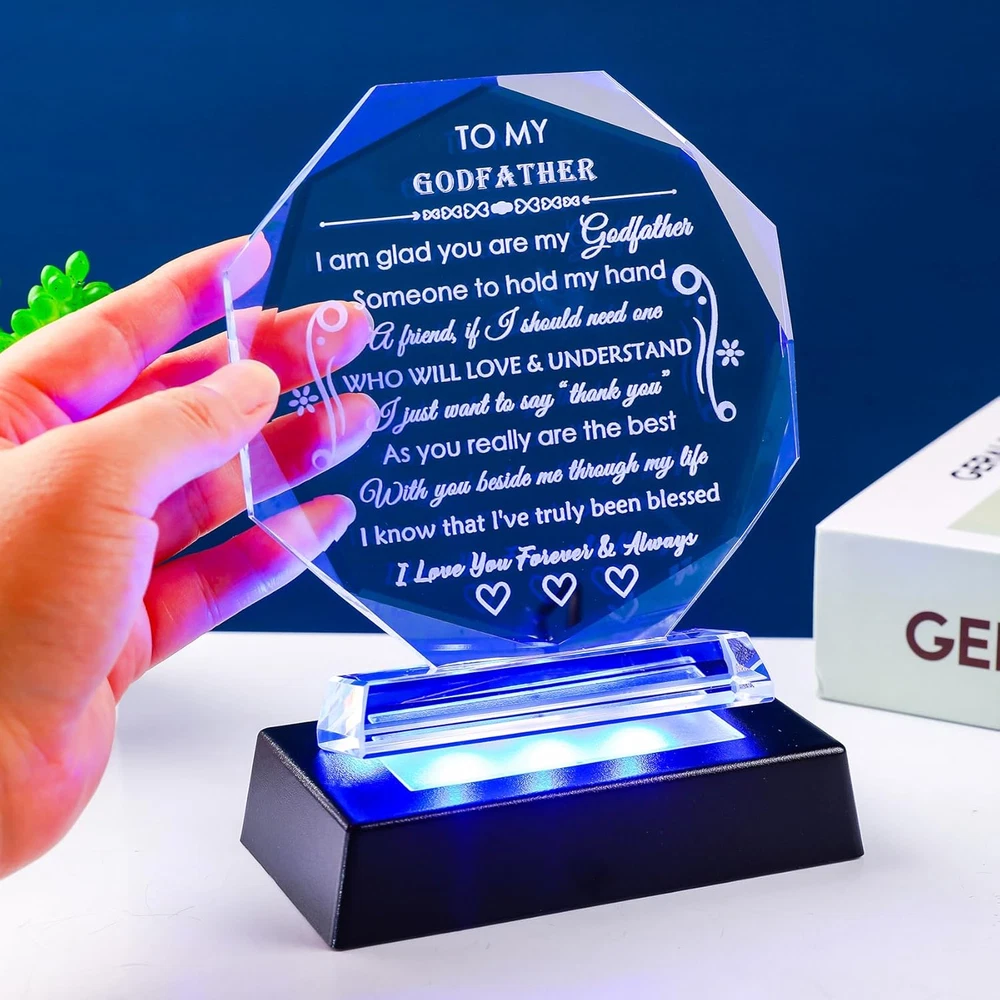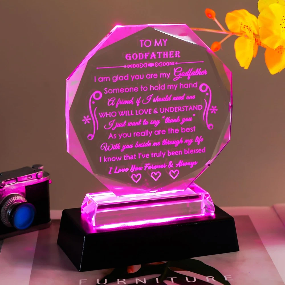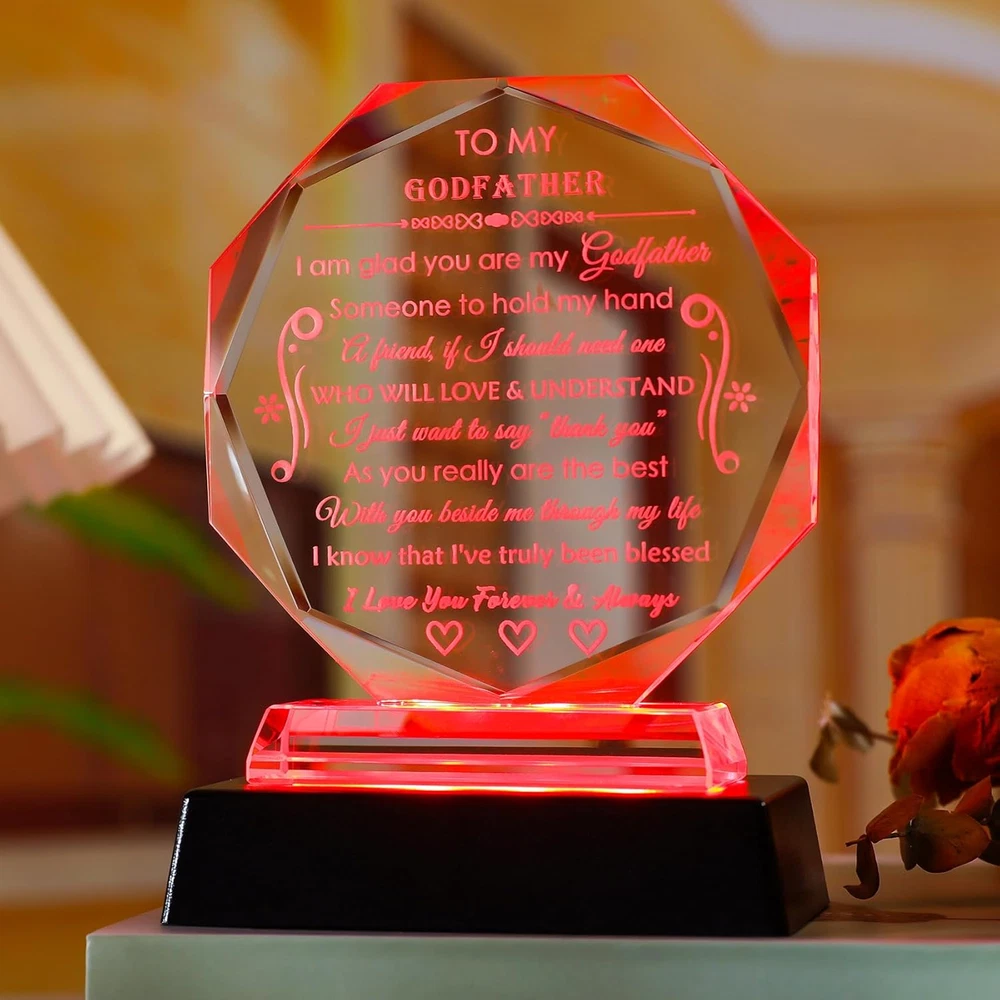 Menu Other Items Feedbacks About Us Contact Us Add To Favorites Godfather Gift with Colorful Base Engraved to My Godfather Crystal Keepsakes Gifts from Godchild on Fathers Day Christmas Thanksgiving Birthday Crystal Gifts for Godfather from Goddaughter Godson 💎QUALITY Glass MATERIAL: This keepsake was made of high-quality glass, transparent and glossier, it can be used for a long time but does not lose its luster. All patterns and words are laser-engraved inside the glass. It is not easy to wear or tarnish 🎁Godfather Gift: This crystal Godfather gift with LED Base is a thoughtful personal birthday Christmas Father's Day gift for a godfather designed especially, one who selflessly helps you and gives you the courage to live when you are in despair, and this bright crystal is like a warm hug that he will cherish forever. Best crystal keepsakes gifts to express your love to him 🎁 BEST GODFATHER GIFT from Godchild: The godfather glass keepsake is a meaningful gift from a goddaughter or godson of any age, to a loving godfather. Whether at baptism or years later for a beloved Godfather's birthday or holiday, the godfather keepsake present will hold a special place in his heart. ✨GREAT HOME DECOR: This crystal keepsake is equipped with an LED light base. This colorful LED base has a variety of colors of lights, which can be adjusted according to your preferences(seven working modes), creating a romantic atmosphere in a darker space. It will be a good home decoration when you put it on the table, wall shelf, or fireplace. It also can use be a night light GIFT BOX PACKING: The crystal gifts come in a stylish gift box with a small clean cloth and a blank gift card(You can write whatever words you want), you can send the gift directly, no need to repack To My Godfather I am glad you are my Godfather. Someone to hold my hand. A friend, if I should need one who will love & understand. I just want to say “thank you”. As you really are the best.With you beside me through my life. I know that I've truly been blessed.I Love You Forever & Always Product Features 1. Made with High-quality Glass Crystal, Making the Crystal More Transparent and Glossier. 2. Laser engraved words and images inside the crystal keepsakes will never fall off, this is an eternal Keepsakes 3. The Exquisite Packing Box Looks Delicate and Classy. Product Specification Color of Crystal: Clear Material: High-Quality Glass Crystal Size:4.72x4.72x0.98" Crystal Glass Weight:1.32 Package Include 1 x heart crystal blocks keepsakes 1 x Nice Gift Box 1 x gift cards 1×flannel 1×USB cable 1× LED Base When you are looking to buy something for godfather who has everything, this is the gift that fits right in and makes a big hit. Make Your Gift Out of the Ordinary! This is the gift that he can see every week and accompany him for a long time. A milestone crystal paperweight for godfather gift on Birthday Christmas Thanksgiving Item Specification Item Thickness 0.98 Inches Style Godfather Gift+LED Light Type Neon Color Clear Material Glass Material Type Glass Shape Heart Theme Words & Quotes Item Dimensions L x W 5.1"L x 4.7"W Pre Printed Text To My Godfather Recommended Uses For Product Gift and decorative item, specifically for a godfather Mounting Type Free Standing Style Name Godfather Gift+LED Included Components 1 x heart crystal blocks keepsakes, 1 x Nice Gift Box, 1 x gift cards, 1×flannel, 1×USB cable, 1 x LED Base Dimensions Shipping Returns Additional Info Product Dimensions: 4.7 "w x 5.1 "w. Weight: 1.7 lb Fast shipping is very important for us. Our standard shipping service is FREE. Your order will be shipped within 1-3 business days upon full payment received. Most items are delivered within 3-5 business days, however, please allow 3-10 business days. We are shipping only to USA. We only ship to the confirmed Paypal address. We reserve the right to cancel any order for any reason at any time. We are not responsible for undeliverable addresses. We offer a 30 day return policy from checkout winning date. Your satisfaction is guaranteed! If for any reason you are unhappy with your item, just return it within 30 days for a full refund, minus shipping cost. Please contact us prior to initiating a return so that we can issue you a refund authorization. Items defective upon receipt must be packaged in their retail packaging as if new and returned with a detailed description of the problem. Return shipping fees are not refundable. We reserve the right to decline any returns if the above guidelines are not followed. All of our items, unless otherwise stated, will only run on 120 volts. Please check to make sure your country complies with these specifications. If you have a problem or question regarding your transaction please contact us before leaving any type of feedback. We will work with you to resolve any problem you may have.