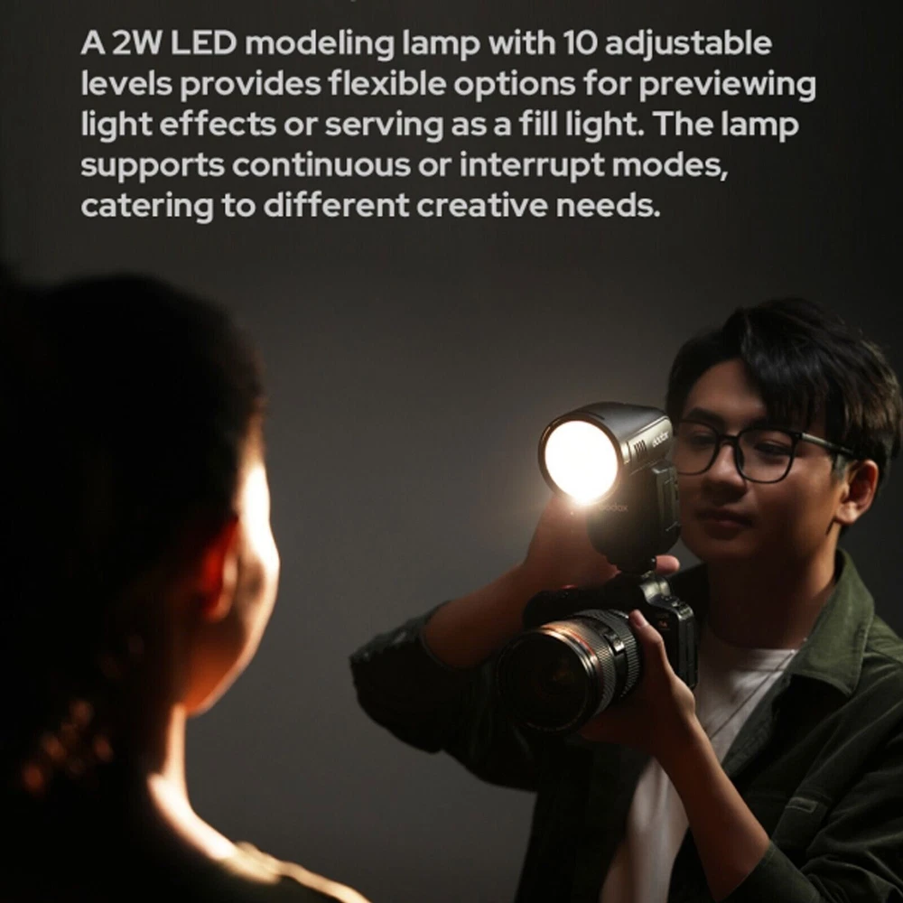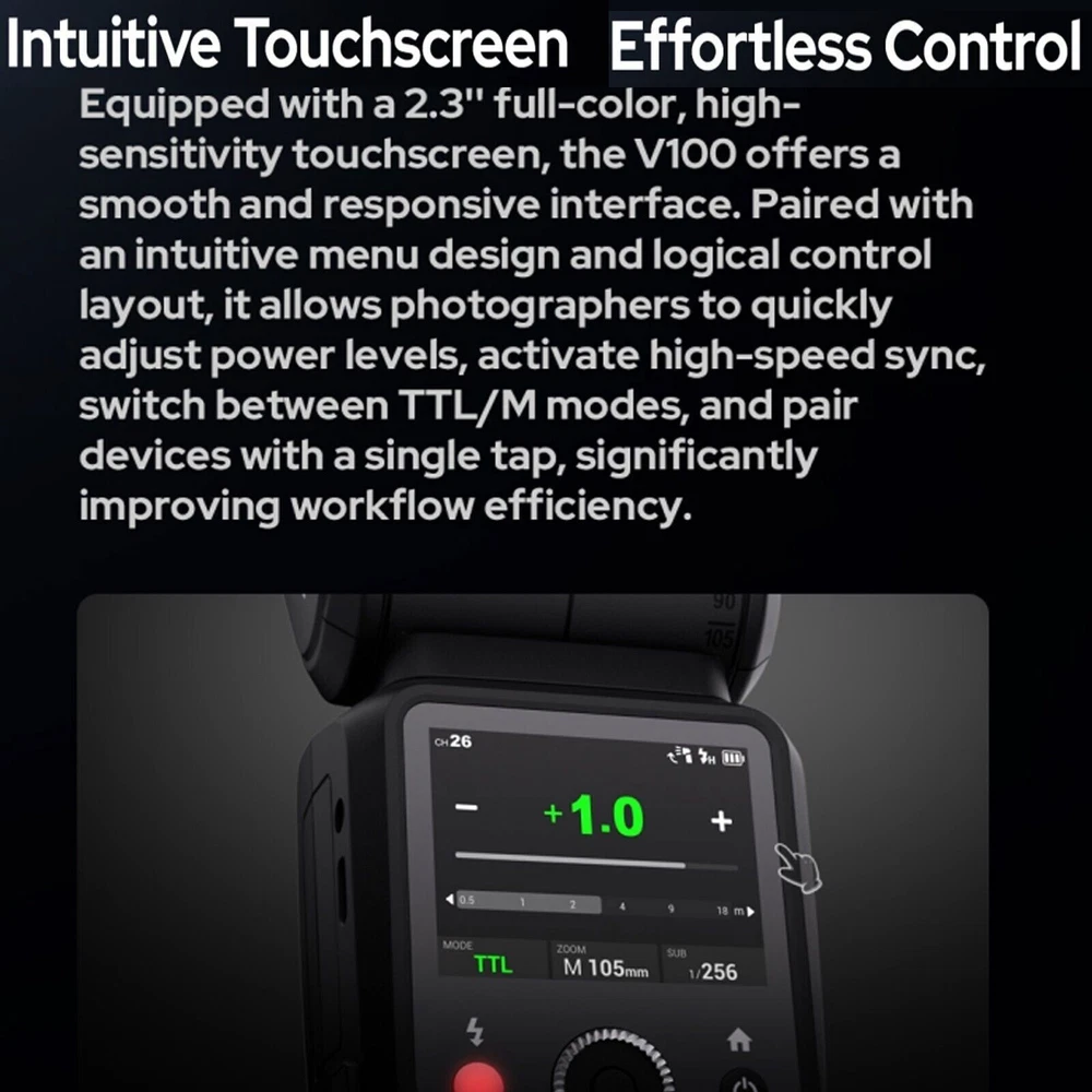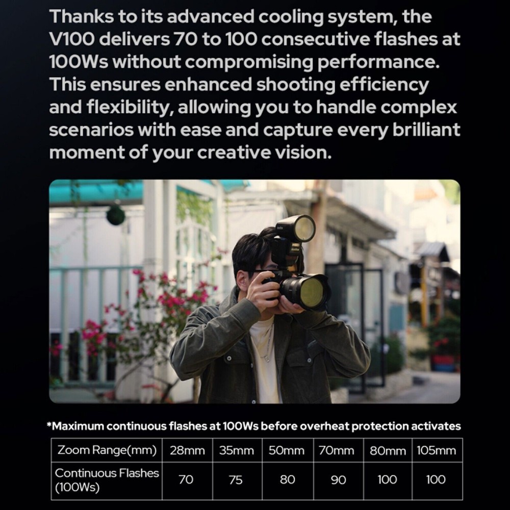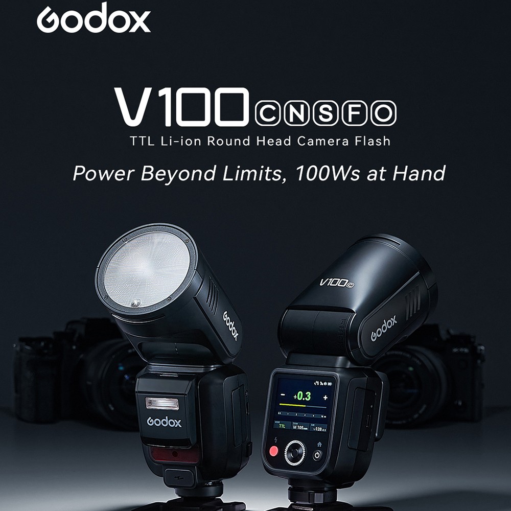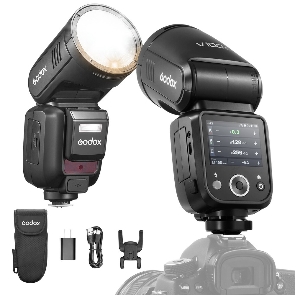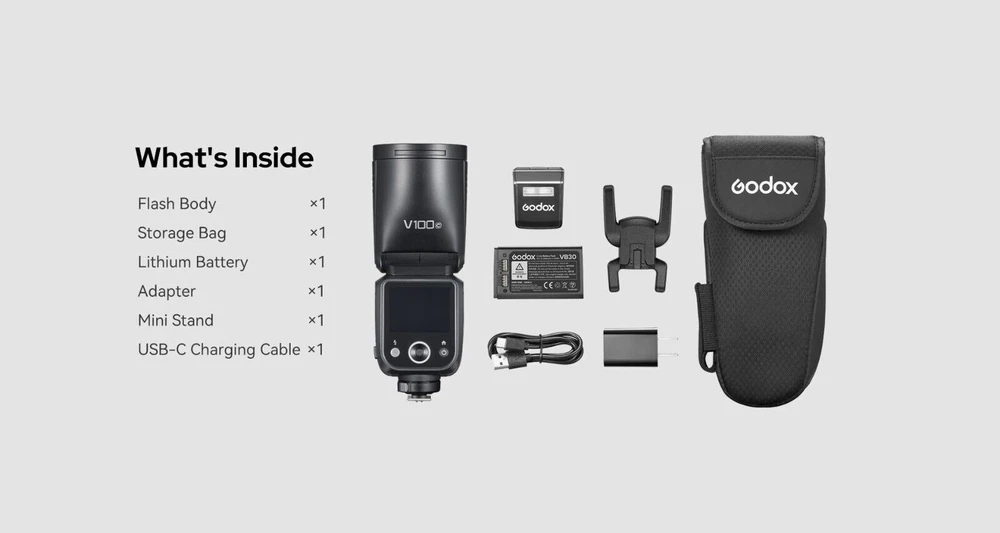 What's in the box Godox Flash body Lithium Battery Charger and USB Battery Charger Mini Stand Storage bag Godox 120cm umbrella softbox kit 2m light stand 100Ws, Beyond Limits 100Ws power at its maximum output (M mode). With adjustable power steps from 1/1 to 1/256 or from 2.0 to 10, it covers the spectrum from subtle fill light to robust lighting for diverse scenarios Intuitive Touchscreen, Effortless Control Equipped with a 2.3'' full-color, high-sensitivity touchscreen, the V100 offers a smooth and responsive interface. photographers to quickly adjust power levels, activate high-speed sync, switch between TTL/M modes. Global Shutter Flash Sync The V100 is seamlessly compatible with cameras featuring global shutter . Supporting shutter speeds up to 1/80,000 seconds and offering TTL functionality,This makes it an ideal choice for sports photography, outdoor bright light, and other fast-paced shooting scenarios. 70 Full-Power Consecutive Flashes Thanks to its advanced cooling system, the V100 delivers 70 to 100 consecutive flashes at 100Ws without compromising performance. This ensures enhanced shooting efficiency and flexibility, allowing you to handle complex scenarios with ease and capture every brilliant moment of your creative vision. Detachable Sub Flash The V100 continues the highly praised detachable sub flash (SU-1) design from the V1 Pro. This versatile feature enables dual-light setups with a single flash, offering creative lighting solutions for portrait photography. Wireless Sync, Streamlined Workflow With the built-in Godox 2.4G Wireless X System, the V100 functions as both a master and receiver unit. Its one-tap pairing capability seamlessly integrates with the X3 trigger or other Godox wireless flash units, streamlining multi-flash setups and boosting productivity. Powerful Battery, Convenient Charging Powered by the same high-performance lithium battery as the V1 Pro, the V100 ensures uninterrupted shooting. The Type-C charging port and compatibility with the VC26T Multi-Battery Charger make recharging quick and convenient. Enhanced Recycling with External Power The V100 includes a port for the PB960 Lithium-Ion Flash Power Pack, reducing full-power recycling time to as fast as 0.8 seconds. This feature supports demanding, high-intensity shooting scenarios, ensuring peak performance. Built-In LED Modeling Lamp A 2W LED modeling lamp with 10 adjustable levels provides flexible options for previewing light effects or serving as a fill light. The lamp supports continuous or interrupt modes, catering to different creative needs. Comprehensive Accessory Ecosystem Godox V100 is compatible with a broad range of Godox accessories, including the AK-R1 Accessory Kit for Round Flash Heads, AK-R21 Projection Attachment, AK-R22 Collapsible Diffusion Dome, and the S2 Speedlite Bracket for Bowens, among others.