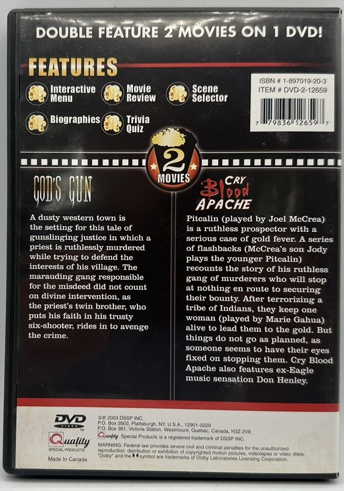 Experience the thrilling action and adventure of "God's Gun and Cry Blood Apache" with this DVD double feature. Featuring Lee Van Cleef and Jack Palance, this DVD set includes two classic movies in the DVD format. The movies are presented in English language with a rating of NR and a sub-genre of Country, Family, and Spaghetti Western. The DVD set comes in a Tall/DVD case and is a Standard Edition. The studio behind the movies is Quality and they were released in 2008. The movies were directed by an unknown director and belong to the Cinematic Movement of Expressionism. This item is perfect for any movie lover and is a must-have for fans of Lee Van Cleef and Jack Palance.