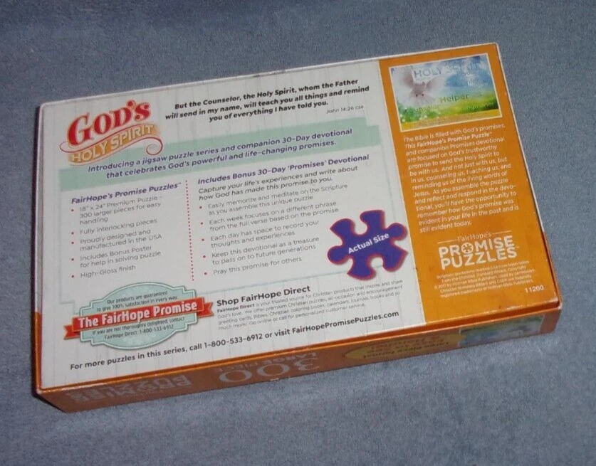 FairHope "God's Holy Spirit" 300 Large Piece Jigsaw Promise Puzzle. Includes a 30 Day Devotional and bonus poster. The finished size is 18" x 24". It is brand new. This item is from a smoke free home. Please contact me if you have any questions. Thank you.