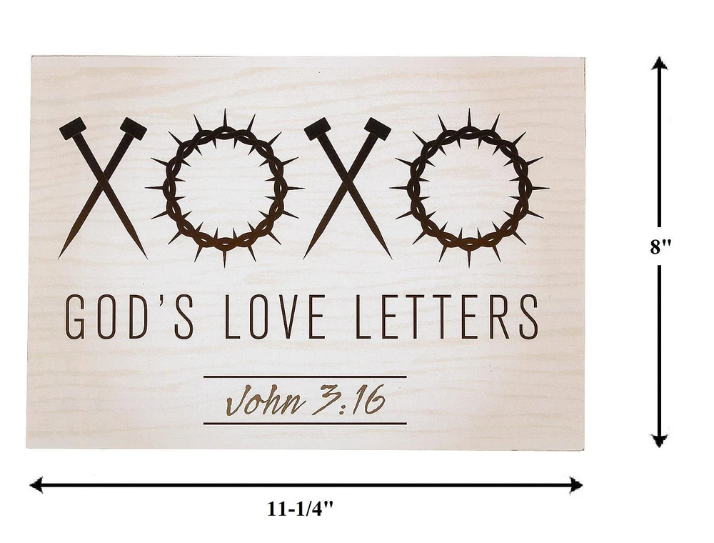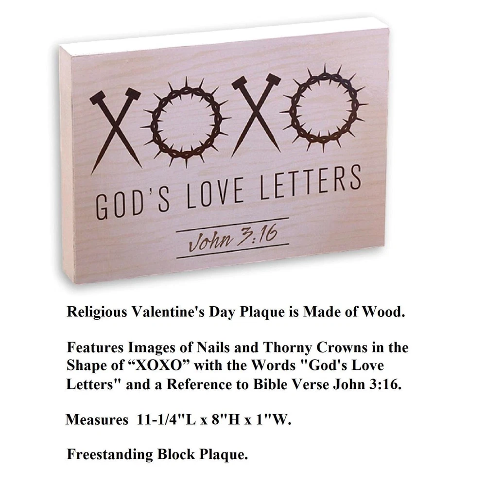 God's Love Letters Nails & Throny Corwns XOXO Valentine's Wooden Sign 11"L #416 God's Love Letters Nails & Throny Corwns XOXO Valentine's Wooden Sign 11"L #416 Click images to enlarge Description God's Love Letters Nails & Throny Corwns XOXO Valentine's Wooden Sign 11"L. This sign depicts the traditional hugs and kisses symbols of "XOXO" with a unique twist. The X's are images of the nails used to nail Jesus to the cross and the O's are images of the spiked crown. This sign reads, "God's Love Letters John 3:16". This sign shows God's love and the sacrifices He and Jesus made for us all. This sign makes a great gift for Valentine's Day or to display all year long as a constant reminder. Details: Measures 11-1/4"Long x 8"High Made of Wood Block Sign Is Free-Standing Re-Usable Year After Year - Or Keep Up All Year Long ~Buy more than one item at the same time from our eBay store and save in shipping costs!~ (If buying different items, just put them all in your cart before paying, to get the combined shipping discount!) Shipping We use UPS SurePost, UPS, USPS and FedEx SmartPost to deliver our products to your home, depending on which method is more efficient for your order. We use suppliers for some of our orders and our suppliers will choose the service that is used for these orders. PLEASE MAKE SURE YOUR ADDRESS CAN BE VERIFIED BY USPS. Please allow 7-10 days for the item to reach your home. We cannot be responsible for items shipped to incorrect or incomplete addresses, which may result in the cancellation of your order. YES, we do combine shipping! The highest shipping cost item ships at regular price, and each additional item ships at $2.00 more in additional shipping charges. If you are buying several different items from our store, put them all into your cart before paying to get the combined shipping discount. Terms of Sale Unless otherwise noted, we accept returns up to 30 Days after your purchase, through the eBay Returns System. Please use eBay to contact us if there is any problems or issues with your order. In some cases, we order the item purchased from one of our suppliers, and it is shipped directly from our supplier to the customer. There are times when an item unexpectedly becomes unavailable from our supplier. We do our best to check on all of the items availability several timea a day. If an item is unexpectedly unavailable, we will issue a refund immediately. Contact Us Please use the message center in eBay to contact us. We check our message box in eBay several times a day. If you have any questions or concerns with your order, please feel free to contact us. We care very much about our customers being 100% happy with their purchases. We would very much appreciate you letting us resolve any issues you may have with your order by contacting us first, before taking any other unnecessary actions. Get images that make Supersized seem small. Showcase your items with Auctiva's Listing Templates! THE simple solution for eBay sellers.