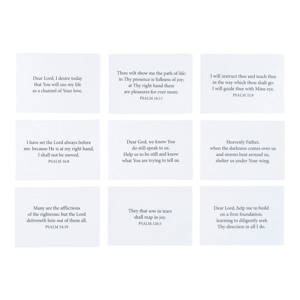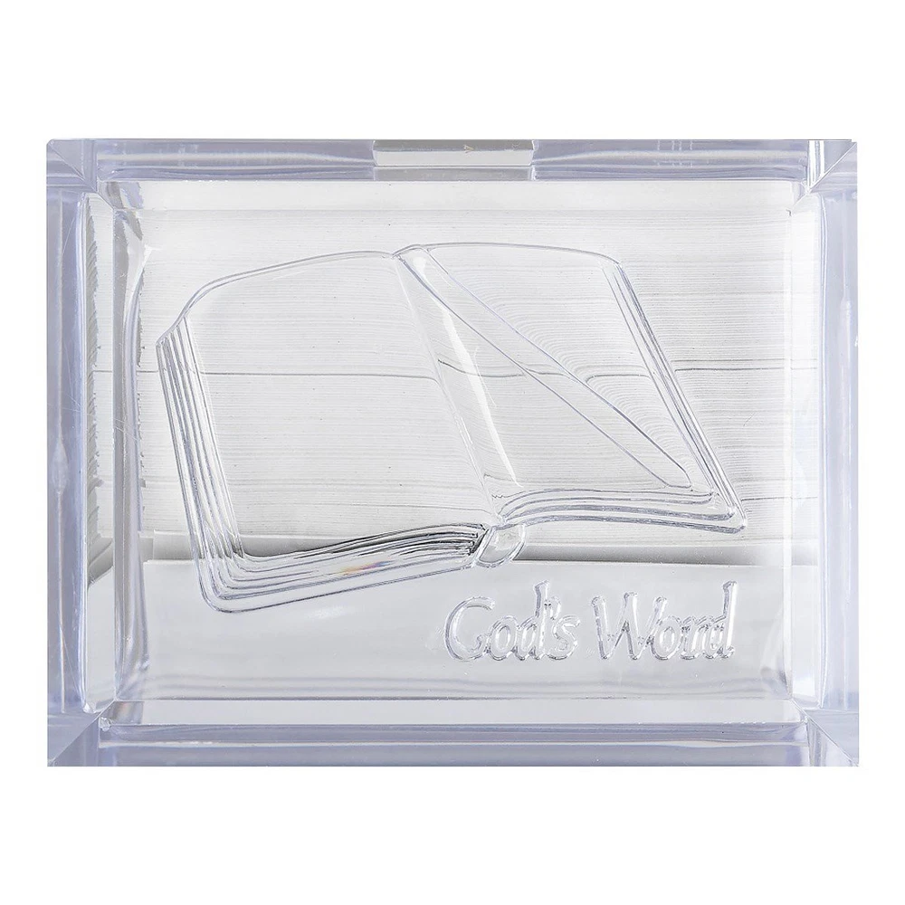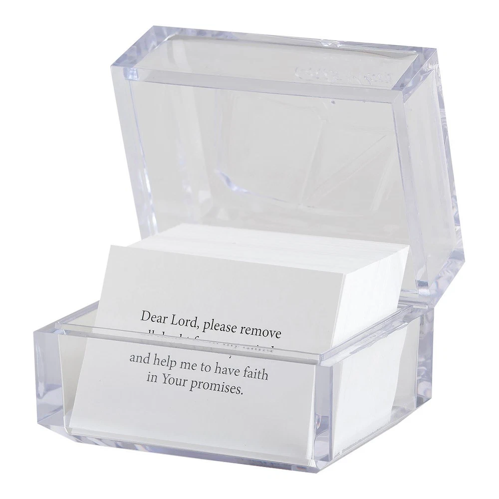 God's Word Promise Box is filled with 140 daily prayers and scriptures to live by. Each card has a scripture from the KIng James Version of the Bible on one side and an accompanying prayer on the other. These encouraging reminders of God's goodness and His faithfulness will renew your spirit and refresh your soul year after year. You can be read them again and again or share them with the people you care about. They do make the perfect gift no matter the occasion. The cards are stored in a simply beautiful acrylic promise box with an embossed design of the Bible and the message,'God's Word,' on the top. Sample text: Bible verse: As I was with Moses, so I will be with thee. - JOSHUA 3:7 KJV Prayer: Dear Lord, please remove all doubt from my mind and help me to have faith in Your promises. Bible verse: The Lord is thy keeper: the Lord is thy shade upon thy right hand. - PSALM 121:5 Prayer: We thank You, Father, for loving us so much that You bring answers in all areas of our lives. Product Details Receive a daily dose of encouragement year after year with this acrylic Promise Box filled with scripture and prayers. Be inspired by a hopeful message every day. 140 2-Sided Scripture prayer cards in an elegantly designed acrlic Promise Box size: 3 3/4" x 2 1/2" x 2 3/4". The removeable lid has an embossed floral design with the message, "God's Gifts". Not only are your cards protected, they're are also easily accessible and portable. They make a beautiful tabletop, desktop or shelf display at home or in the office. Each Bible verse card features KJV Scripture text. These cards can be used as daily encouragement, Scripture memory, or pass one along to inspire your friends or family. It's the word of God at your fingertips. You may find yourself ordering more as these are the perfect inspirational gift for your friends and family on any occasion. Receive a daily dose of encouragement year after year KJV Scripture text Size: 3 3/4" x 2 1/2" x 2 3/4" 140 2-Sided Cards Acrylic box with removable lid Receive a daily dose of encouragement year after year with this acrylic Promise Box filled with scripture and prayers. Be inspired by a hopeful message every day. 140 2-Sided Scripture prayer cards in an elegantly designed acrlic Promise Box size: 3 3/4" x 2 1/2" x 2 3/4". The removeable lid has an embossed floral design with the message, "God's Gifts". Not only are your cards protected, they're are also easily accessible and portable. They make a beautiful tabletop, desktop or shelf display at home or in the office. Each Bible verse card features KJV Scripture text. These cards can be used as daily encouragement, Scripture memory, or pass one along to inspire your friends or family. It's the word of God at your fingertips. You may find yourself ordering more as these are the perfect inspirational gift for your friends and family on any occasion. Receive a daily dose of encouragement year after year