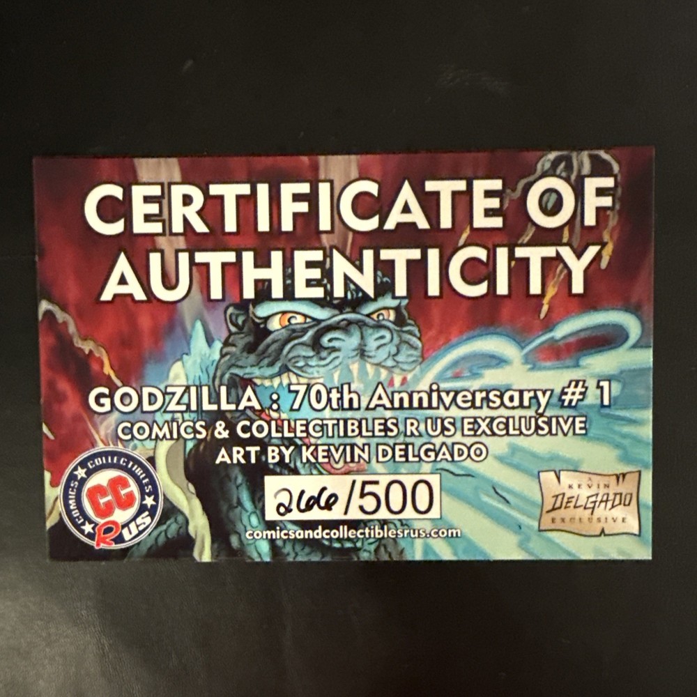 Godzilla #1 – 70th Anniversary FULL FOIL – Kevin Delgado Cover – LTD 500 w/COA – IDW RARE NM/M Kaiju Monsterverse Godzilla #1 – 70th Anniversary FOIL Edition – Limited to 500 w/COA – NM/M Celebrate 70 years of the King of the Monsters with this stunning limited foil edition of Godzilla #1 ! Featuring breathtaking cover art by Kevin Delgado , this collectible was produced in an extremely limited run of just 500 copies worldwide , making it a must-have centerpiece for any serious kaiju or comic fan. ✨ Key Features: Title: Godzilla #1 – 70th Anniversary Foil Edition Publisher: IDW Comics Cover Artist: Kevin Delgado Edition Size: Limited to 500 copies Certificate of Authenticity (COA): Included Condition: NM/M (see photos; I am not a professional grader. I always try to call out any major defects so you know exactly what you’re getting.) Special Feature: Striking full foil treatment that makes the artwork shine with incredible depth and detail 📦 Shipping & Handling: Your comic will be securely packaged in a Gemini mailer to ensure safe arrival. I combine shipping on multiple purchases—just check out my other listings! 🔥 Don’t miss out on this rare anniversary edition of Godzilla #1 —a perfect tribute to the monster that started it all and a true grail for collectors.