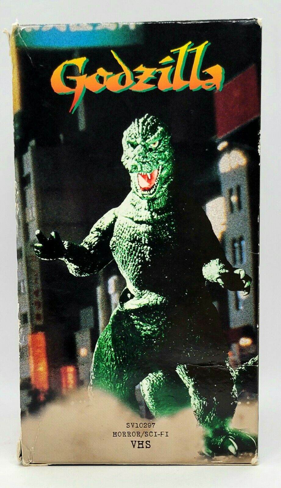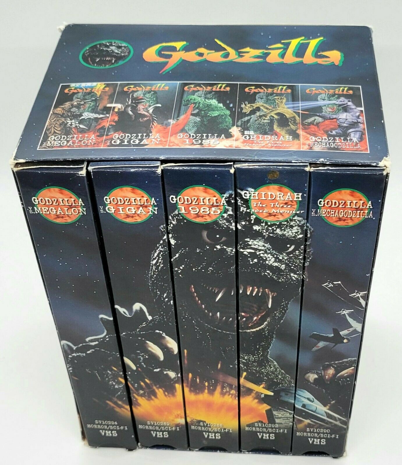 1997 Godzilla VHS set of 5 movies collected into a decorative cover set to form a visually appealing depiction of Godzilla. The movies include the most famous of his battles. Godzilla vs Megalon Godzilla vs Gigan Godzilla 1985 Godzilla vs Ghidrah The Three Headed Monster Godzilla vs Mechagodzilla Condition: The quality of the tapes are not verified. The outer box has several issues as the pictures show. Still a unique piece to add to a collection.