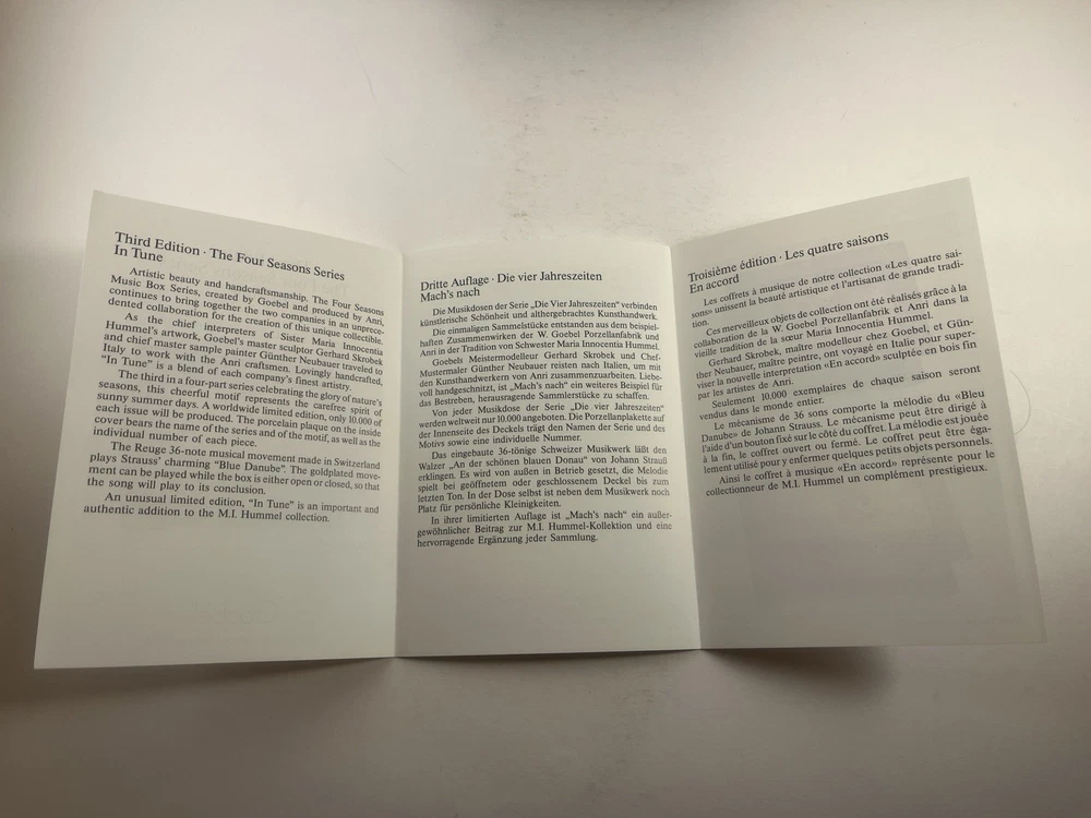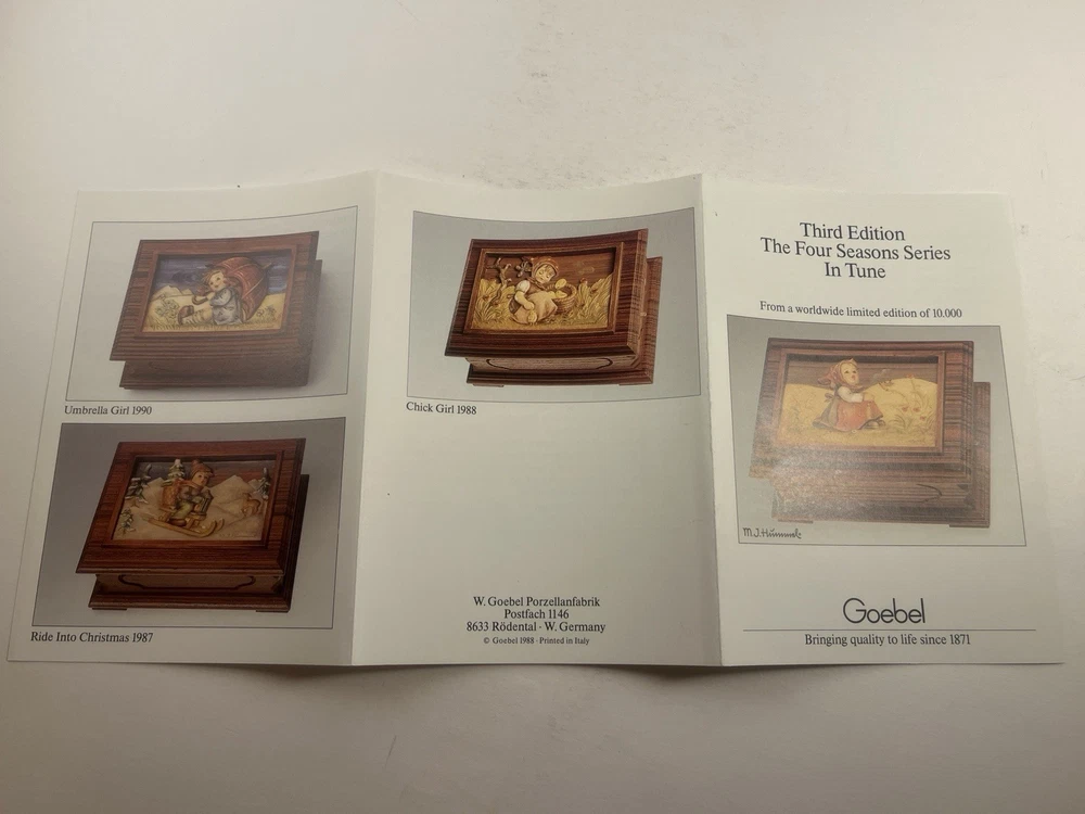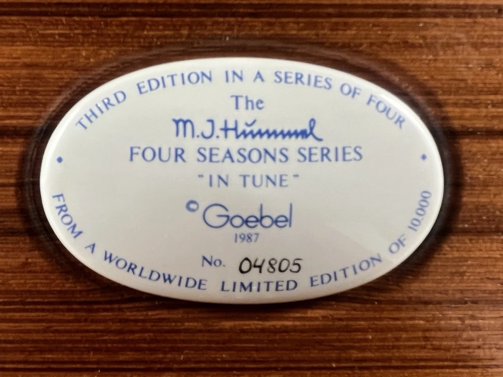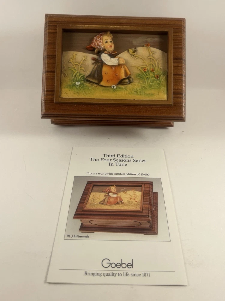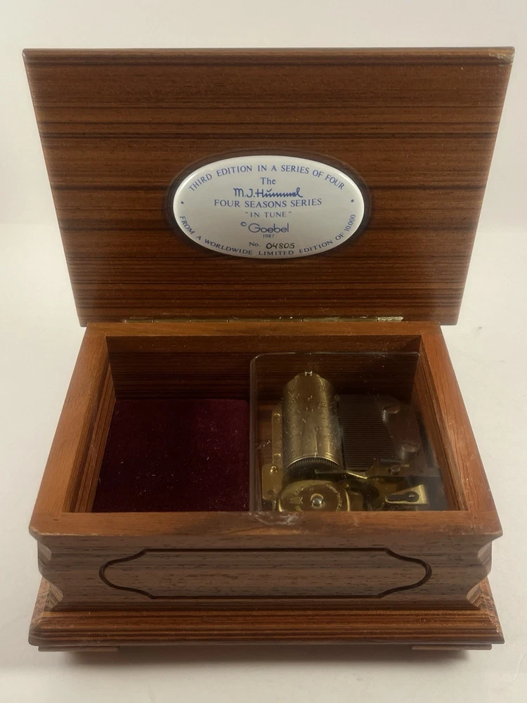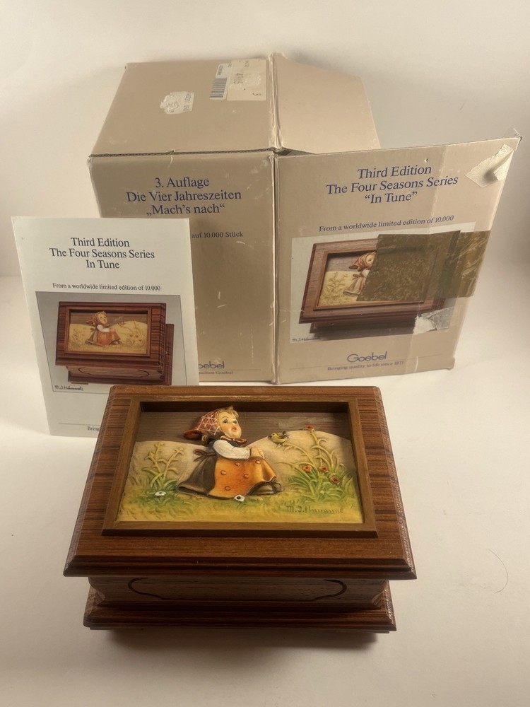 Subject: M.I. Hummel "In Tune" Limited Edition Musical Box by Anri & Reuge Item Specifics • Brand: Goebel / M.I. Hummel • Collaboration: Anri (Italy) & Reuge (Switzerland) • Series: Four Seasons Series (Third Edition) • Title: "In Tune" (Mach's Nach) • Limited Edition: No. 04805 of 10,000 • Year Produced: 1987 (Released 1988) • Musical Movement: Reuge 36-Note Swiss Movement • Song Played: The Blue Danube (Blaue Donau) • Material: Hand-Carved Wood, Hand-Painted Porcelain Plaque • Handmade: Yes (Hand-carved, hand-painted, and hand-tuned components) • Features: Original Box, Certificate/Booklet Included • Country of Manufacture: Italy / Switzerland / W. Germany Key Features • Triple-Artisan Collaboration: A rare collectible featuring M.I. Hummel artistry, precision hand-carved woodwork by Anri, and a world-class musical movement by Reuge. • Limited Edition Status: This piece is individually numbered 04805 of 10,000, making it a significant find for serious Hummel or music box collectors. • Handmade Quality: Every element of this box showcases manual craftsmanship, from the chiseled wooden frame to the meticulously hand-tuned 36-note mechanical movement. • Musical Performance: Plays a crisp, melodic rendition of Johann Strauss’s "The Blue Danube." Condition Report • Functional: The Reuge movement has been tested and is in excellent working order, playing clearly and at the proper tempo. • Cosmetic: The porcelain plaque is in pristine condition with no chips, cracks, or fading. The wooden case shows minor, light surface scuffing on the top edges of the frame consistent with careful previous display. • Packaging: Includes the original Goebel box and the informational series booklet. The box shows some light shelf wear and evidence of previous tape but provides excellent protection.