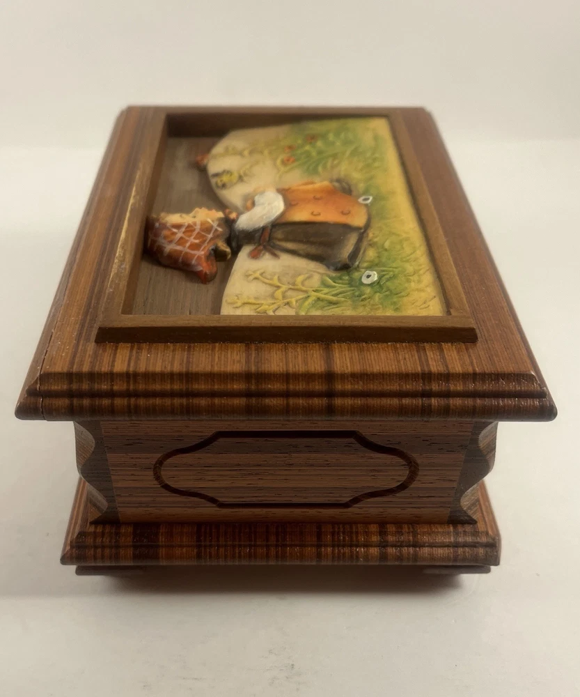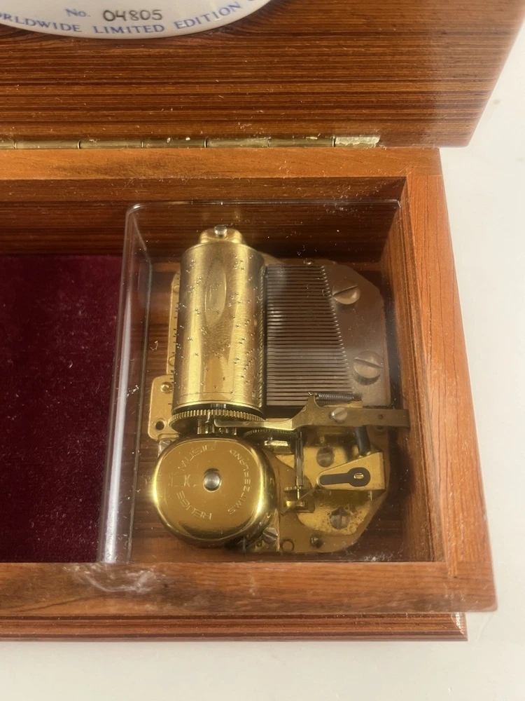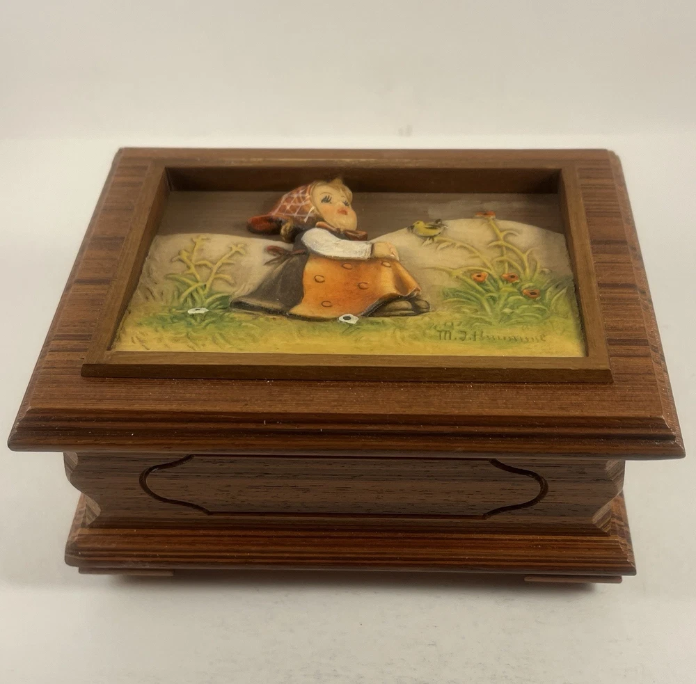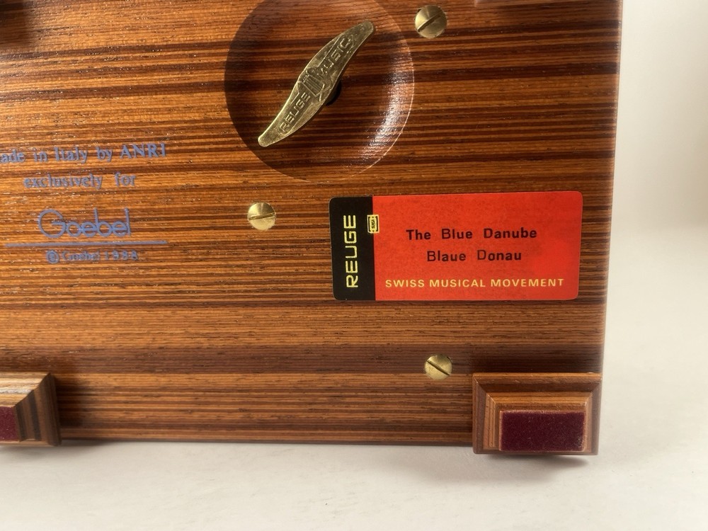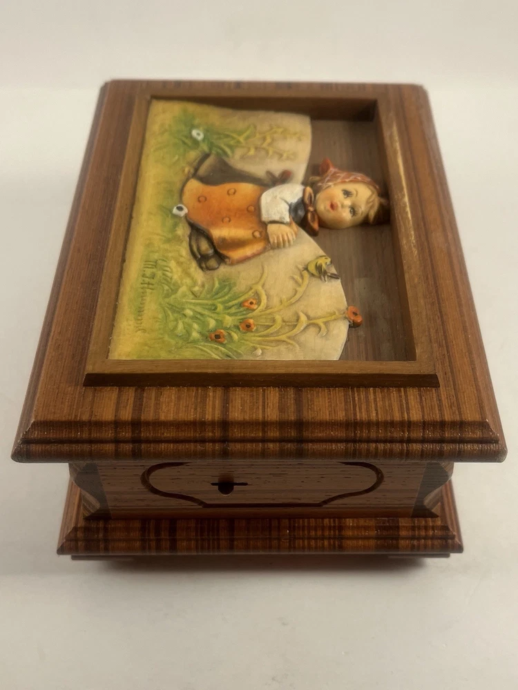 Subject: M.I. Hummel "In Tune" Limited Edition Musical Box by Anri & Reuge Item Specifics • Brand: Goebel / M.I. Hummel • Collaboration: Anri (Italy) & Reuge (Switzerland) • Series: Four Seasons Series (Third Edition) • Title: "In Tune" (Mach's Nach) • Limited Edition: No. 04805 of 10,000 • Year Produced: 1987 (Released 1988) • Musical Movement: Reuge 36-Note Swiss Movement • Song Played: The Blue Danube (Blaue Donau) • Material: Hand-Carved Wood, Hand-Painted Porcelain Plaque • Handmade: Yes (Hand-carved, hand-painted, and hand-tuned components) • Features: Original Box, Certificate/Booklet Included • Country of Manufacture: Italy / Switzerland / W. Germany Key Features • Triple-Artisan Collaboration: A rare collectible featuring M.I. Hummel artistry, precision hand-carved woodwork by Anri, and a world-class musical movement by Reuge. • Limited Edition Status: This piece is individually numbered 04805 of 10,000, making it a significant find for serious Hummel or music box collectors. • Handmade Quality: Every element of this box showcases manual craftsmanship, from the chiseled wooden frame to the meticulously hand-tuned 36-note mechanical movement. • Musical Performance: Plays a crisp, melodic rendition of Johann Strauss’s "The Blue Danube." Condition Report • Functional: The Reuge movement has been tested and is in excellent working order, playing clearly and at the proper tempo. • Cosmetic: The porcelain plaque is in pristine condition with no chips, cracks, or fading. The wooden case shows minor, light surface scuffing on the top edges of the frame consistent with careful previous display. • Packaging: Includes the original Goebel box and the informational series booklet. The box shows some light shelf wear and evidence of previous tape but provides excellent protection.