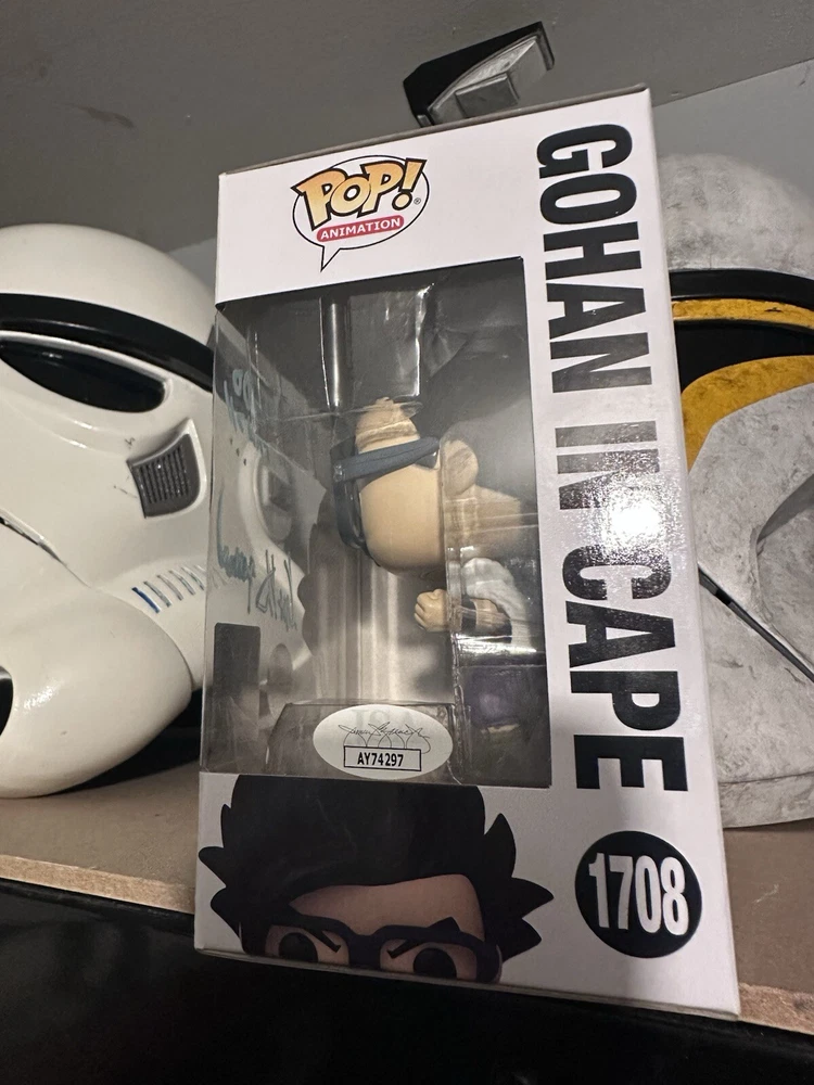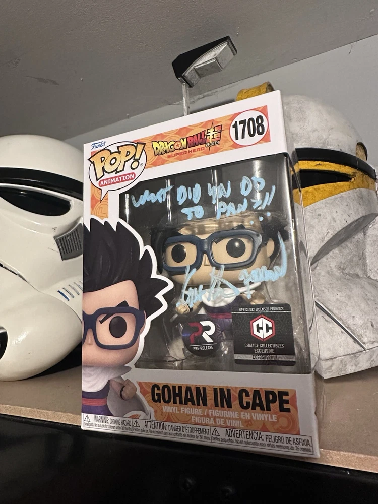 This limited edition Funko Pop Pre-Release signed with a quote written by the voice actor of Gohan in the Dragon Ball Super Hero movie Kyle Herbert , which is also certified to show that the signature and quote were actually written by Kyle Herbert. This would also make an amazing Christmas present for a Dragon Ball fan. The figure features Gohan in his cape from the popular anime series Dragon Ball Super. The figure is made of high-quality vinyl and comes with a protector to ensure its safety. Gohan is depicted in his classic fighting pose and is accompanied by a sticker with his famous quote, "I will protect the Earth with all my might!" This collectible is perfect for any Dragon Ball fan and is sure to be a valuable addition to any collection.