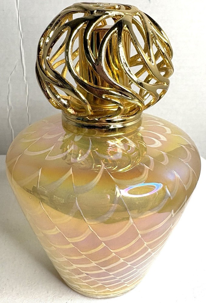 Elevate the ambiance of any room with this exquisite Gold and White Iridescent Swirl Art Glass Wick Fragrance Oil Diffuser Burner. Its medium size is perfect for placing on a shelf, desk, or nightstand, and the 4" diameter provides a substantial presence that complements its alluring pattern. The oil diffuser is designed to fill your space with your favorite aromas, promoting a sense of well-being and tranquility. Crafted from high-quality glass, the diffuser features a golden hue that captures the light, adding a touch of elegance to your decor. Standing at 6 inches tall, it's an ideal addition for any setting, be it a personal workspace, living area, or bathroom. This single-pack diffuser is a simple yet sophisticated way to infuse your environment with your preferred scents, ensuring a pleasant and inviting atmosphere.