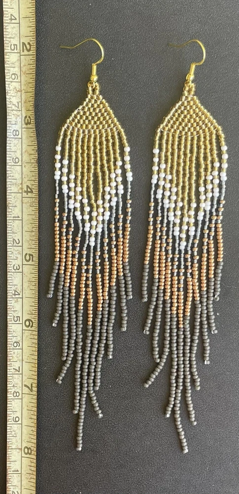 1 pair of gold, white, grey and bronze long seed bead beaded earrings. You will receive earrings pictured. The earrings are handmade with seed beads. The earrings are approximately 6 1/4" long with the ear hooks included. The ear hooks are sterling silver, gold plated. They are for pierced ears. 0-ea-seed-102-1