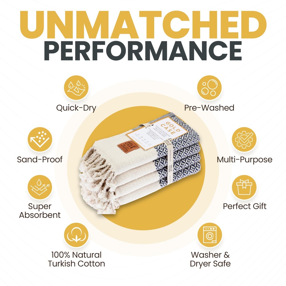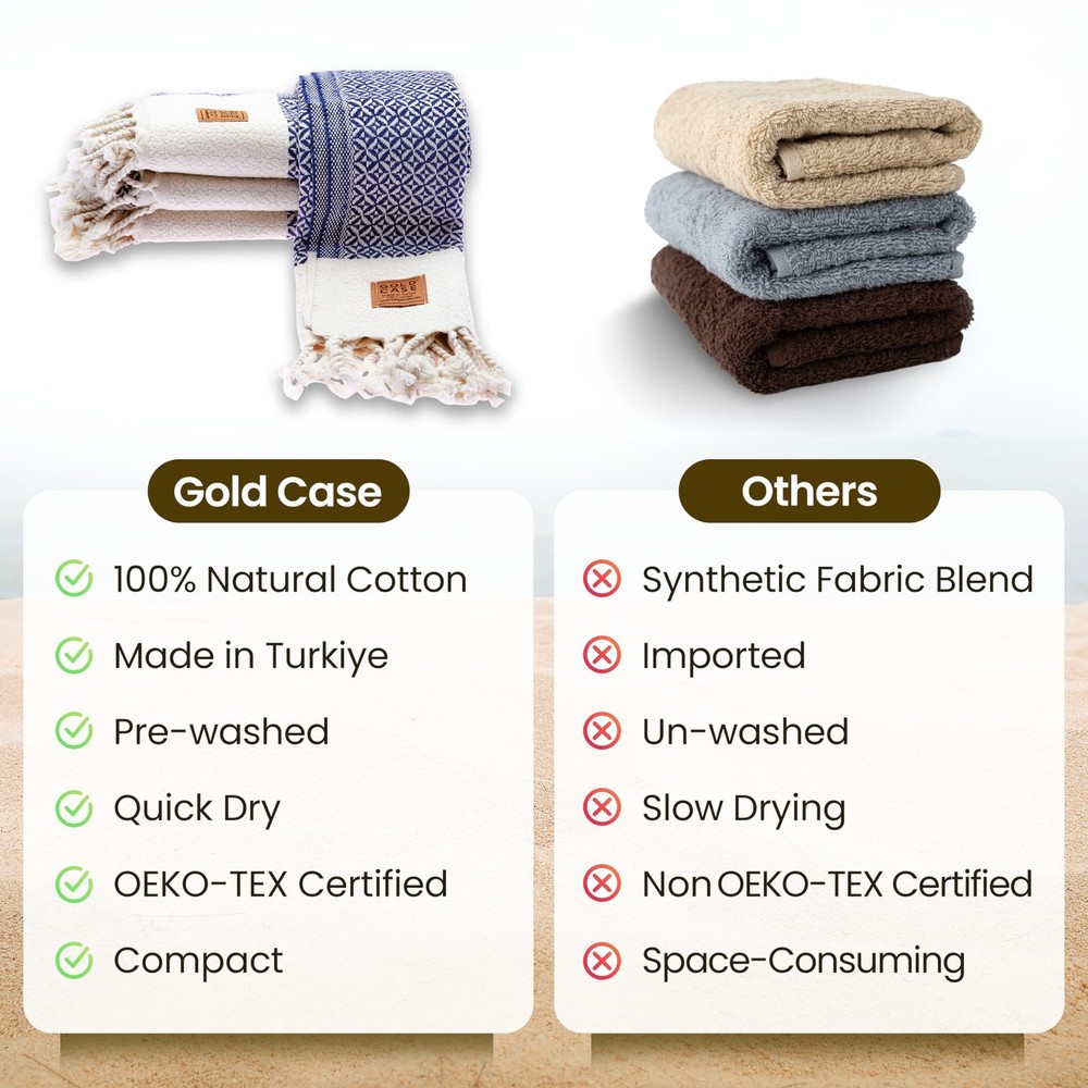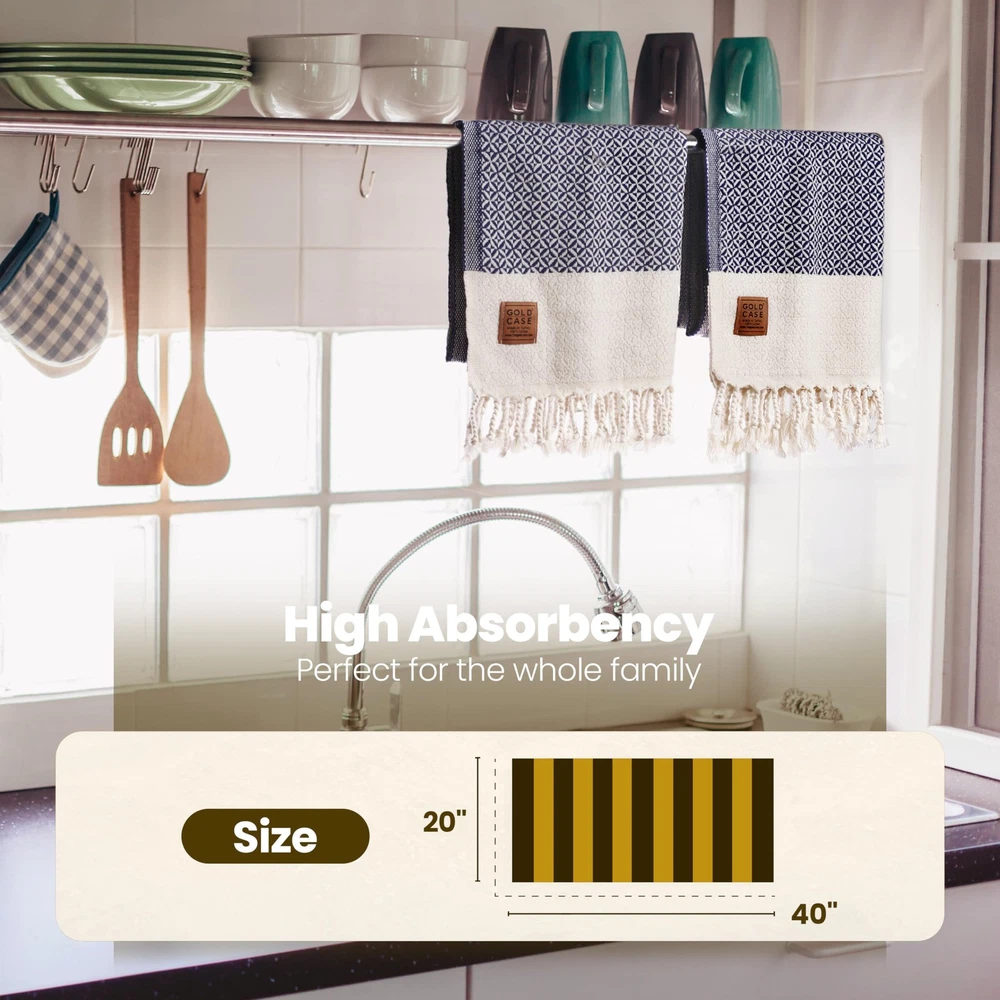 Embrace Pure Comfort: Our Turkish cotton hand towels offer a soft and plush embrace like no other. The Gold Case Turkish towel set is already washed to be super soft and absorbent. You can wash them in the machine, dry them in the machine on low/medium heat, or air-dry them. Don't use bleach. To keep them in good shape for a long time, it's best to air-dry them. Your Travel-Friendly Companions: Thin, lightweight, and generously sized, the 20 x 40 inches hand towel for bathroom redefines convenience for your on-the-go lifestyle. Perfect for travel, camping, or a quick yoga session, they take up minimal space while providing maximum comfort. Pack light, stay bright, and enjoy the freedom of movement with these versatile soft Turkish bathroom hand towels. Join The Eco-Conscious Wave With The Turkish Towel Set: Certified by OEKO-TEX Standard 100, our Turkish cotton hand towels for bathroom are your guilt-free indulgence. Embrace the joy of using a product that not only cares for your comfort but also cares for the environment. TRUE TURKISH CRAFTSMANSHIP & QUALITY: Indulge in the authentic luxury of the Aphrodite hand towels for bathroom set of 4, meticulously MADE IN TURKIYE. Made from 100% natural cotton, these bathroom hand towels boast genuine quality and durability, staying soft and highly absorbent for years. CARE INSTRUCTIONS: The holiday decorative hand towels for bathroom are pre-washed for enhanced softness. Machine wash up to 100°F and tumble dry on low/medium heat or line dry. Avoid bleach. Line drying extends the towel's lifespan. OEKO-TEX CERTIFIED ECO-FRIENDLINESS: Proudly certified by OEKO-TEX Standard 100, these hand towels for kitchen are free of harmful chemicals. Compact and convenient, four of these kitchen hand towels occupy the same space as a traditional terry towel. NO MORE DAMP DISCOMFORT: Our Turkish hand towels for bathroom redefine convenience with their quick-dry feature. In mere minutes, the Turkish hand towel dries completely, leaving no room for moisture or unpleasant odors. Use a bathroom hand towel that dries before you get out of the space. LONG-LASTING & DURABLE: Unlike others, we believe in the longevity and quality of our Turkish towels for bathroom, face, hand, yoga, and gym. Wash after wash, these Turkish kitchen towels improve in softness and absorbency.